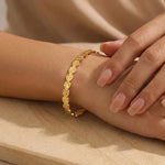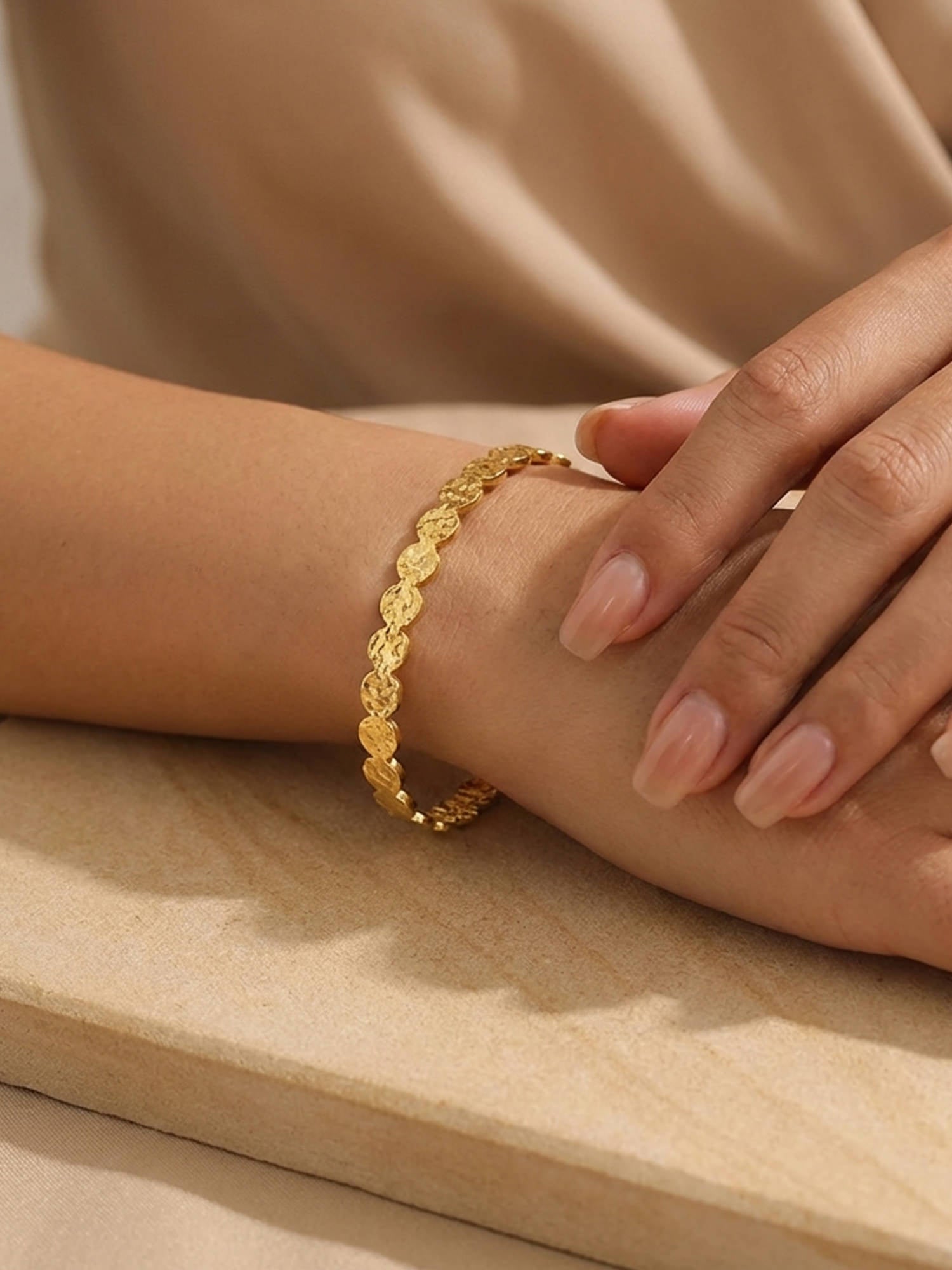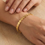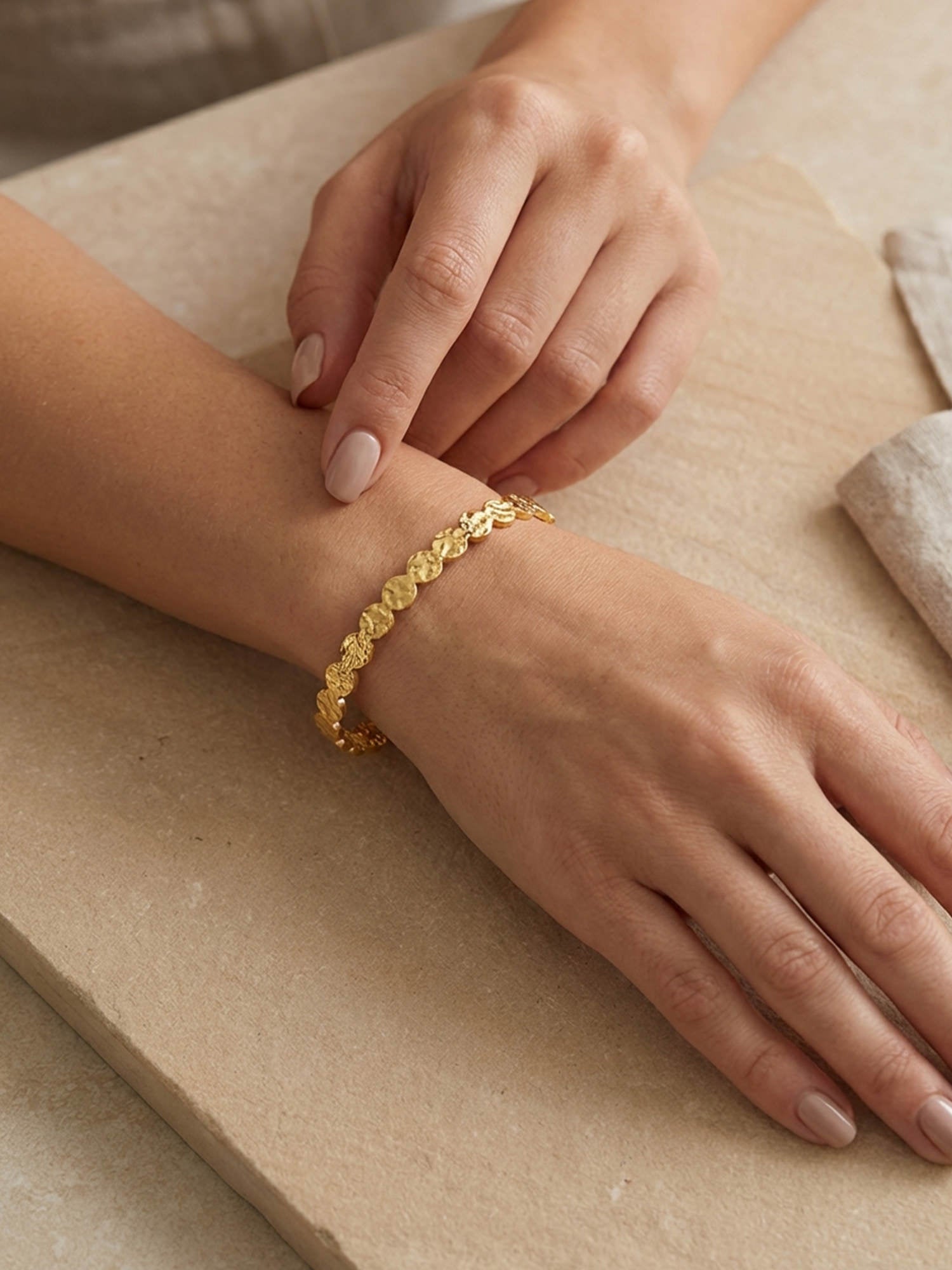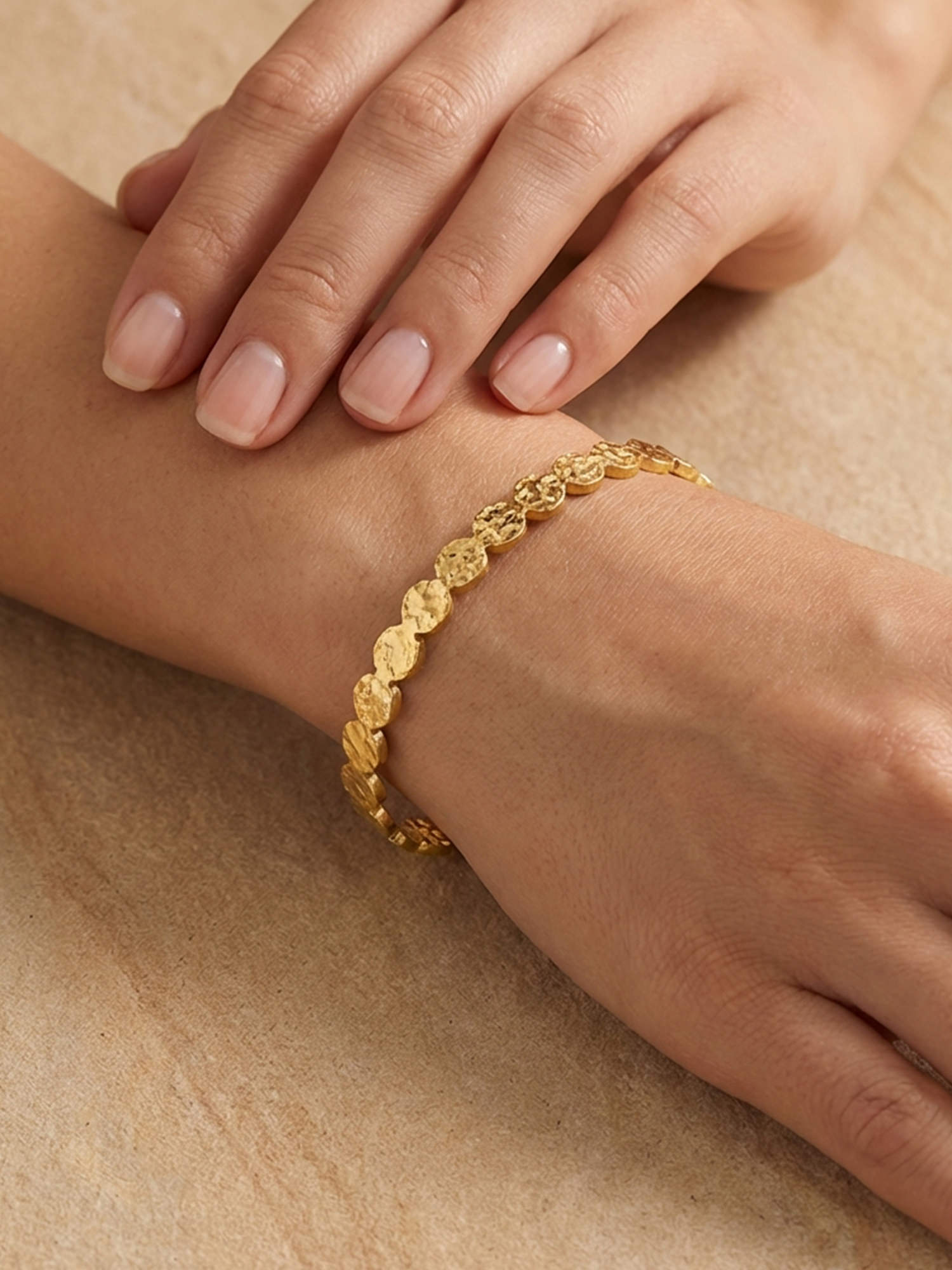 Der Hammered Coin Bangle Gold bringt Sonnenglanz an dein Handgelenk ✨. Die kleinen, gehämmerten Plättchen reflektieren das Licht bei jeder Bewegung und erinnern an die ersten Strahlen der Morgensonne. Dank der offenen Form lässt sich der Armreif leicht anlegen und angenehm tragen. Ein besonderes Stück für alle, die Boho-Charme und zeitlose Eleganz vereinen möchten.