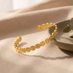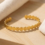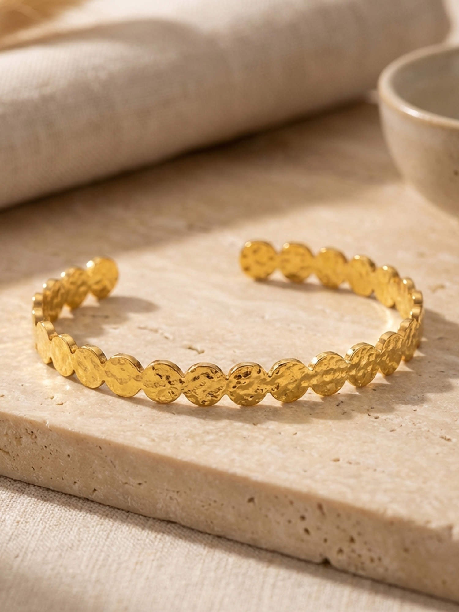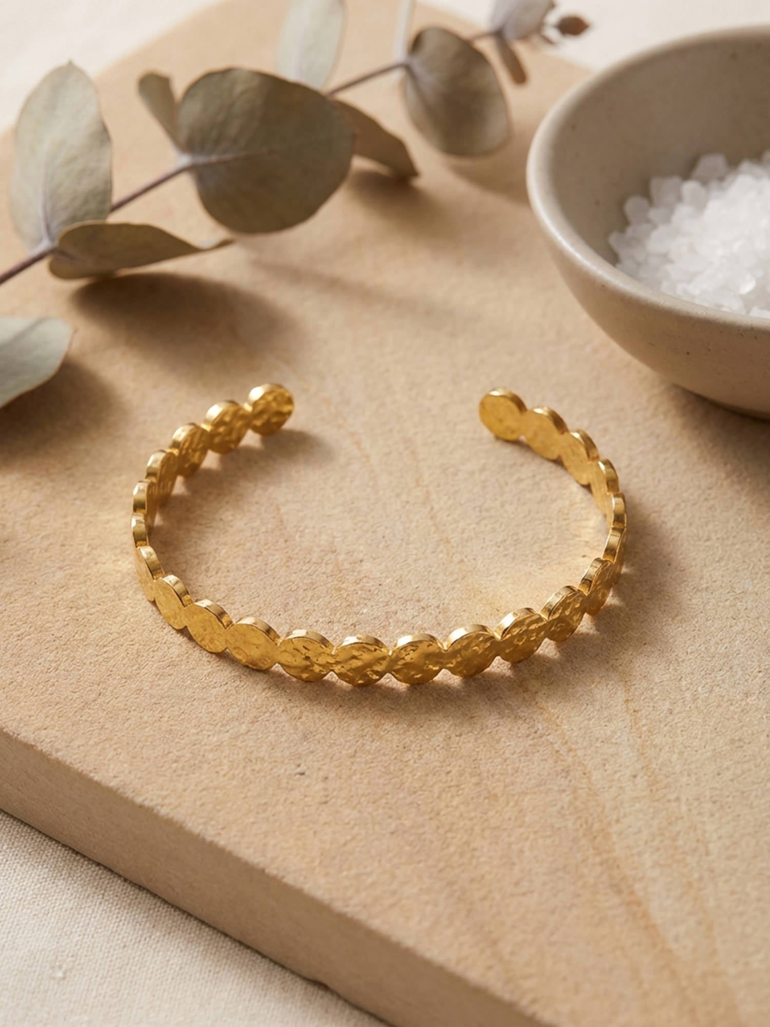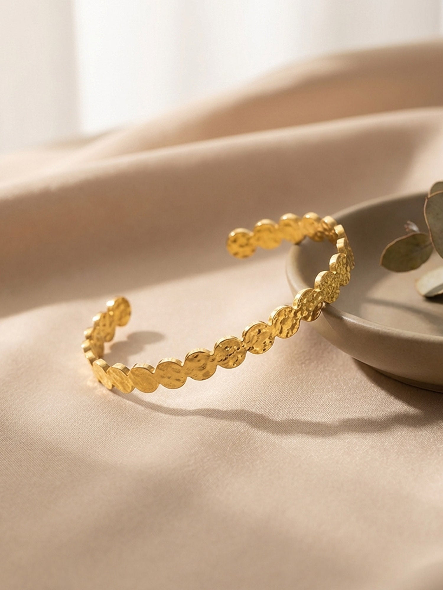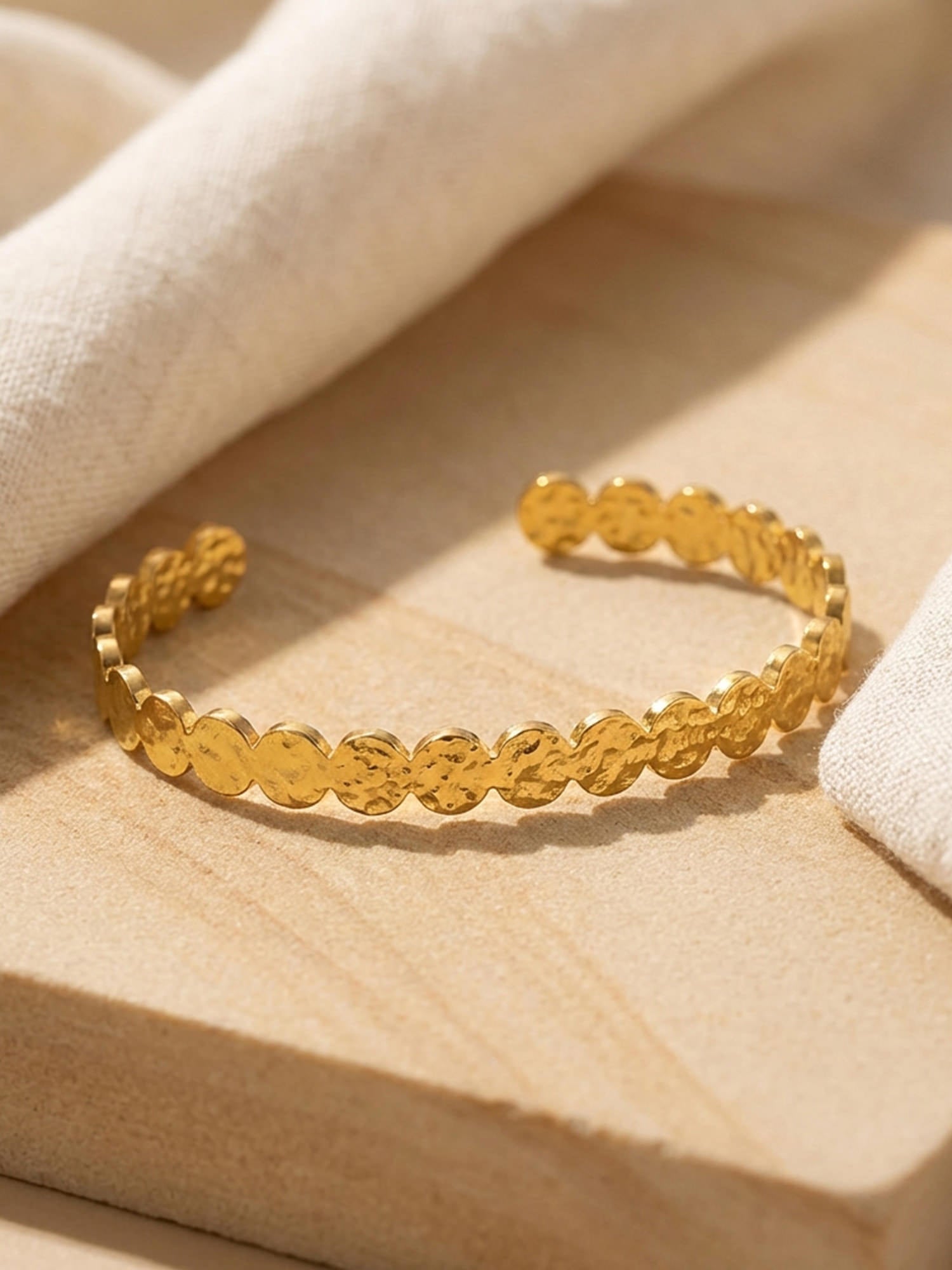 Offener Armreif aus vergoldetem Edelstahl mit zarten, gehämmerten Plättchen – inspiriert von Sonnenstrahlen.