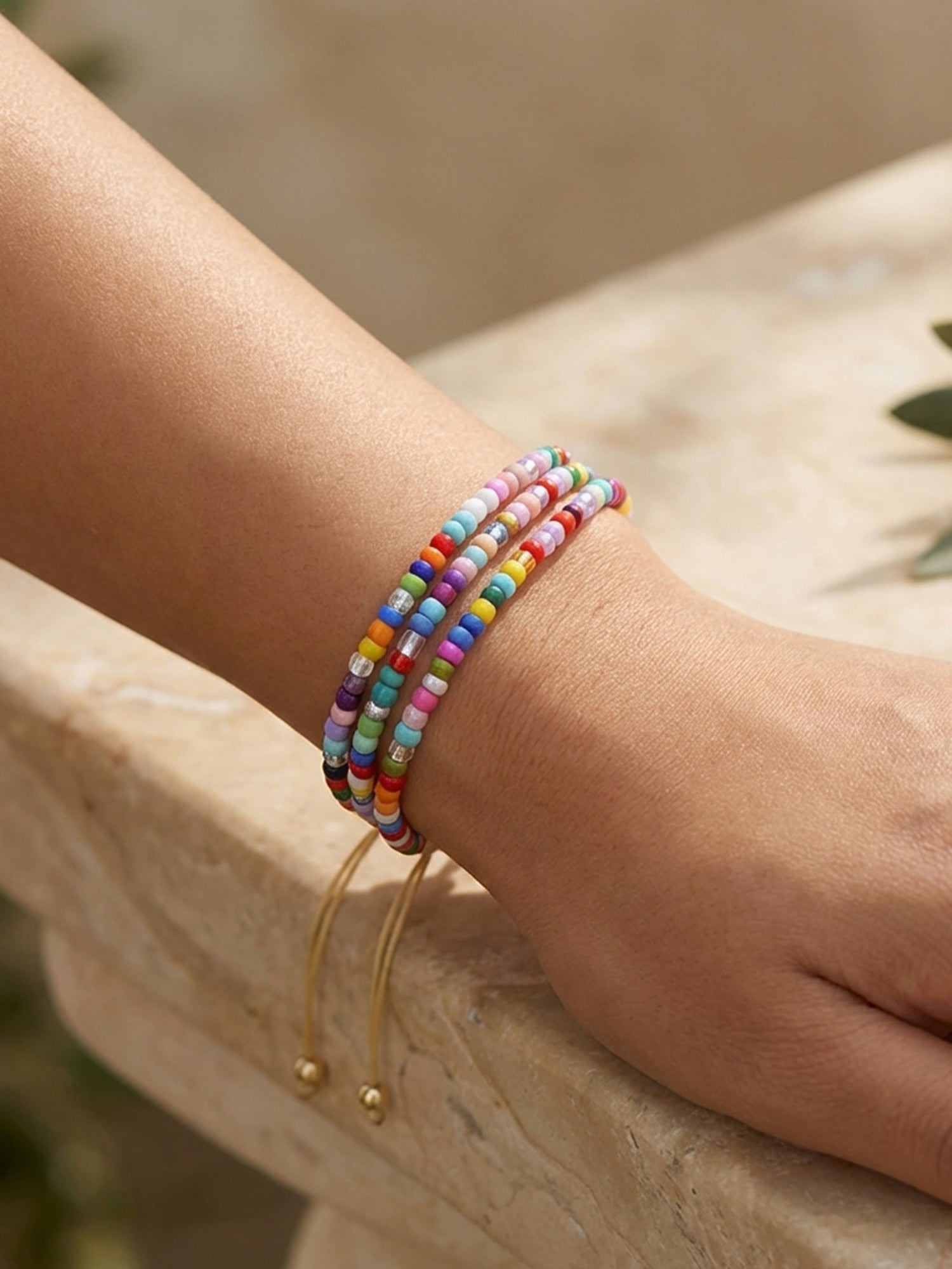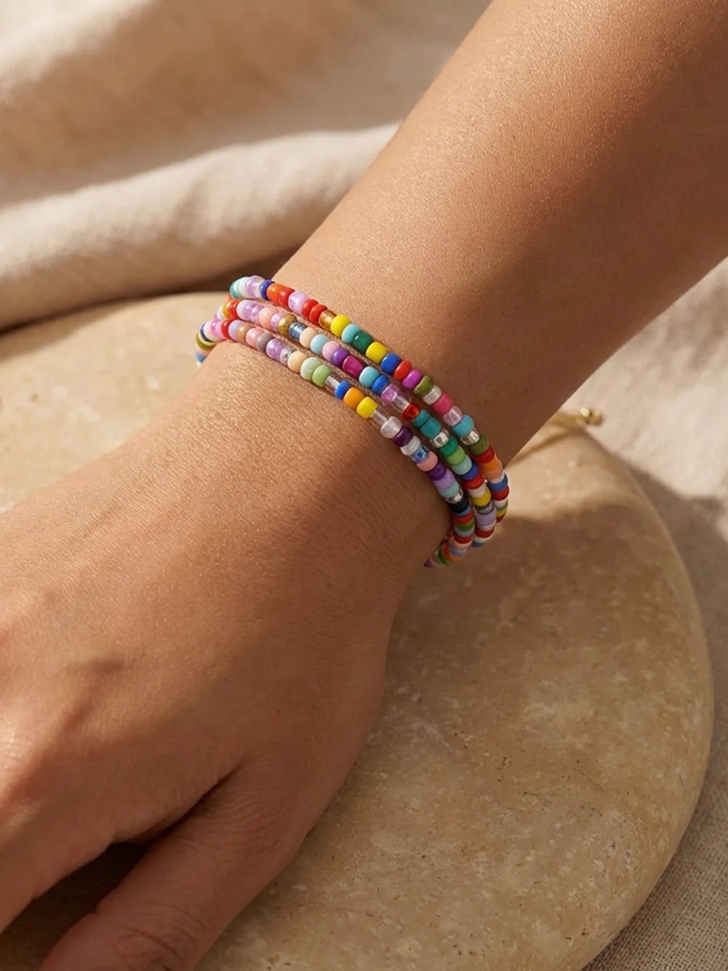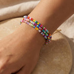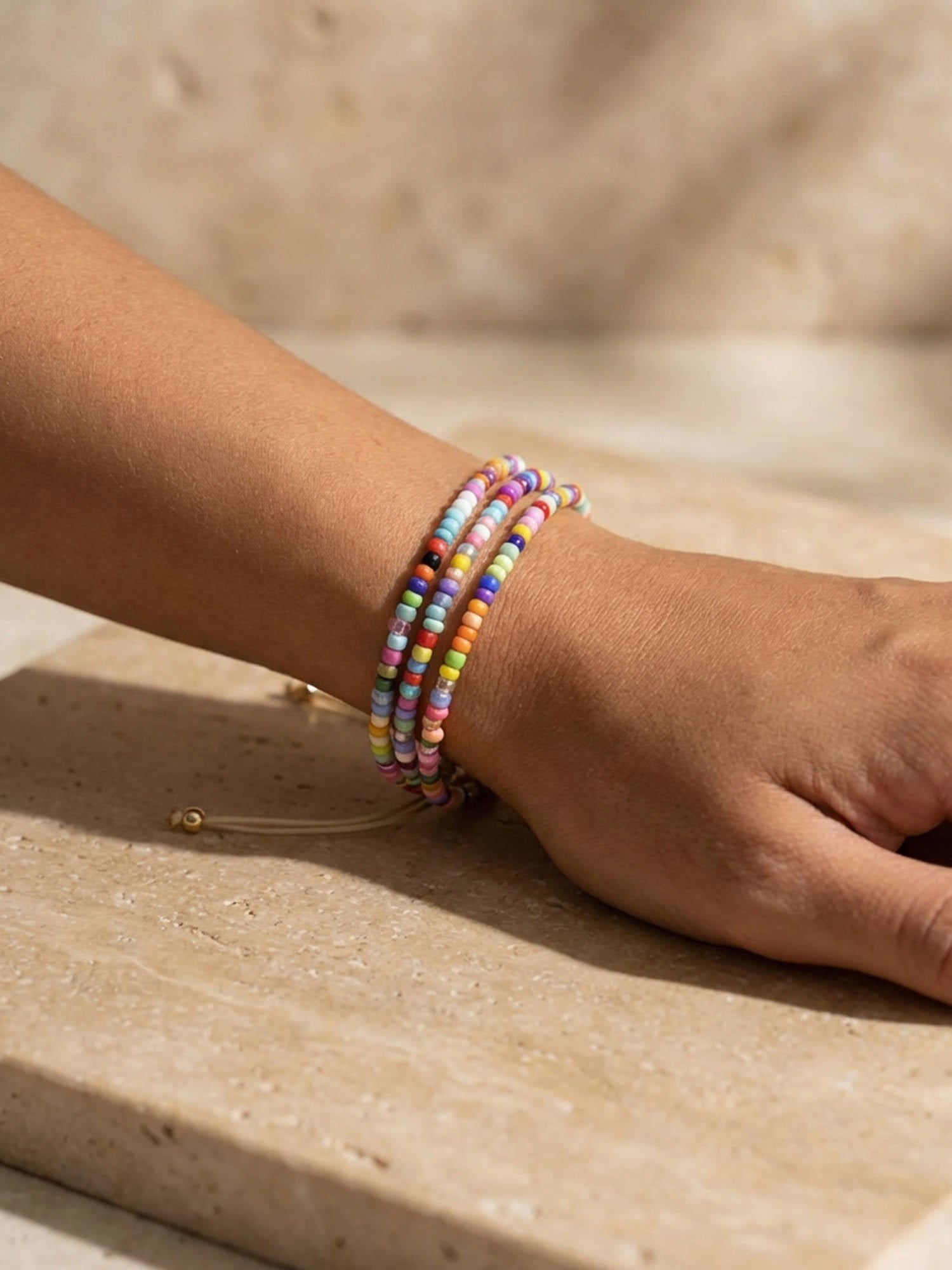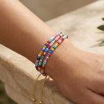 Bring Farbe in deinen Sommer! 🌈 Das Rainbow Bliss Armband ist ein echter Gute-Laune-Macher – mit seinen bunten Perlen erinnert es an Festivalnächte, warme Sonnenuntergänge und unbeschwerte Strandtage.