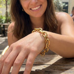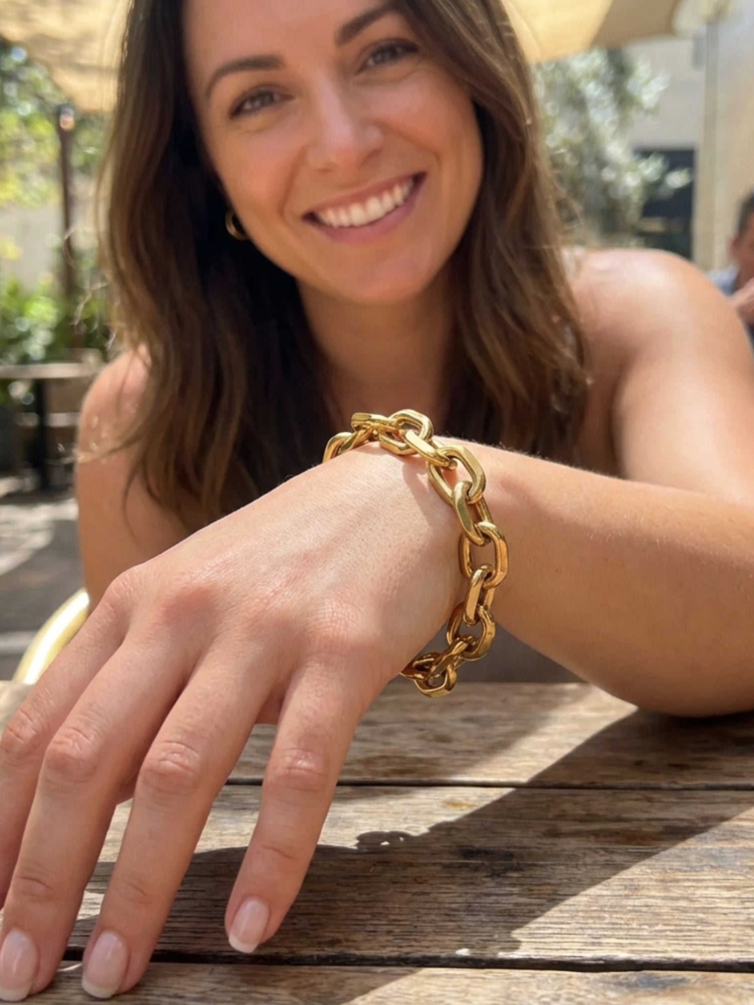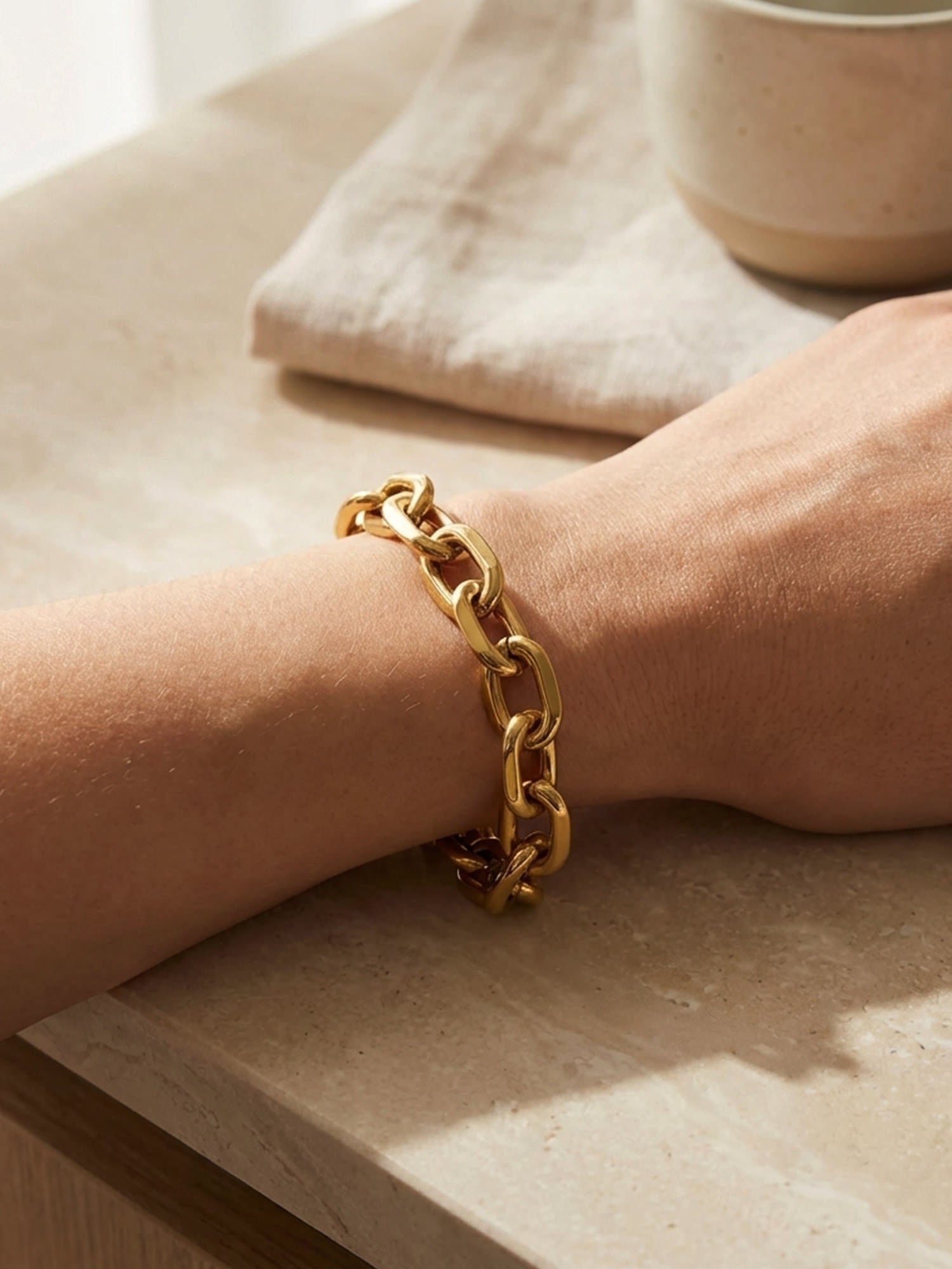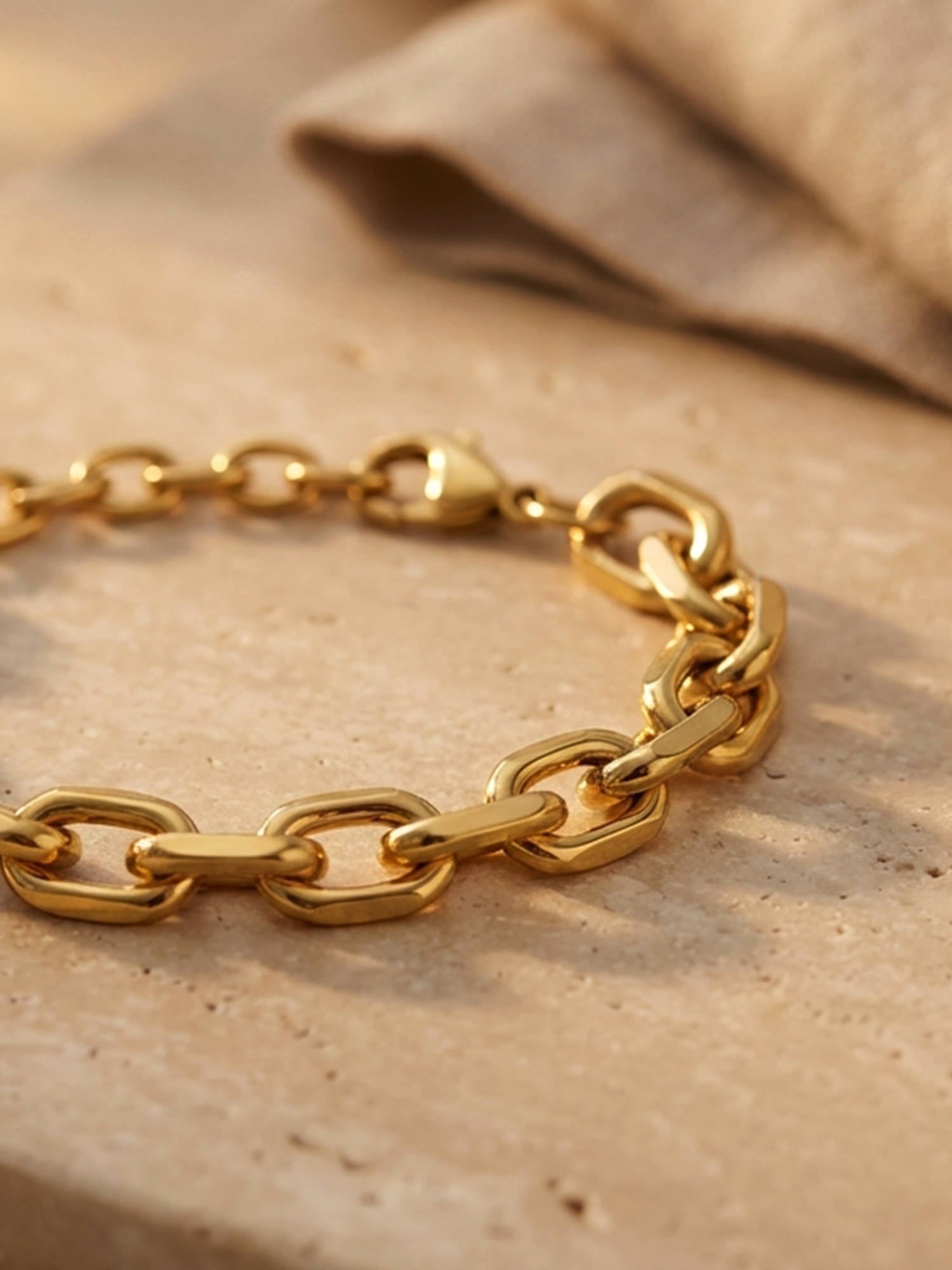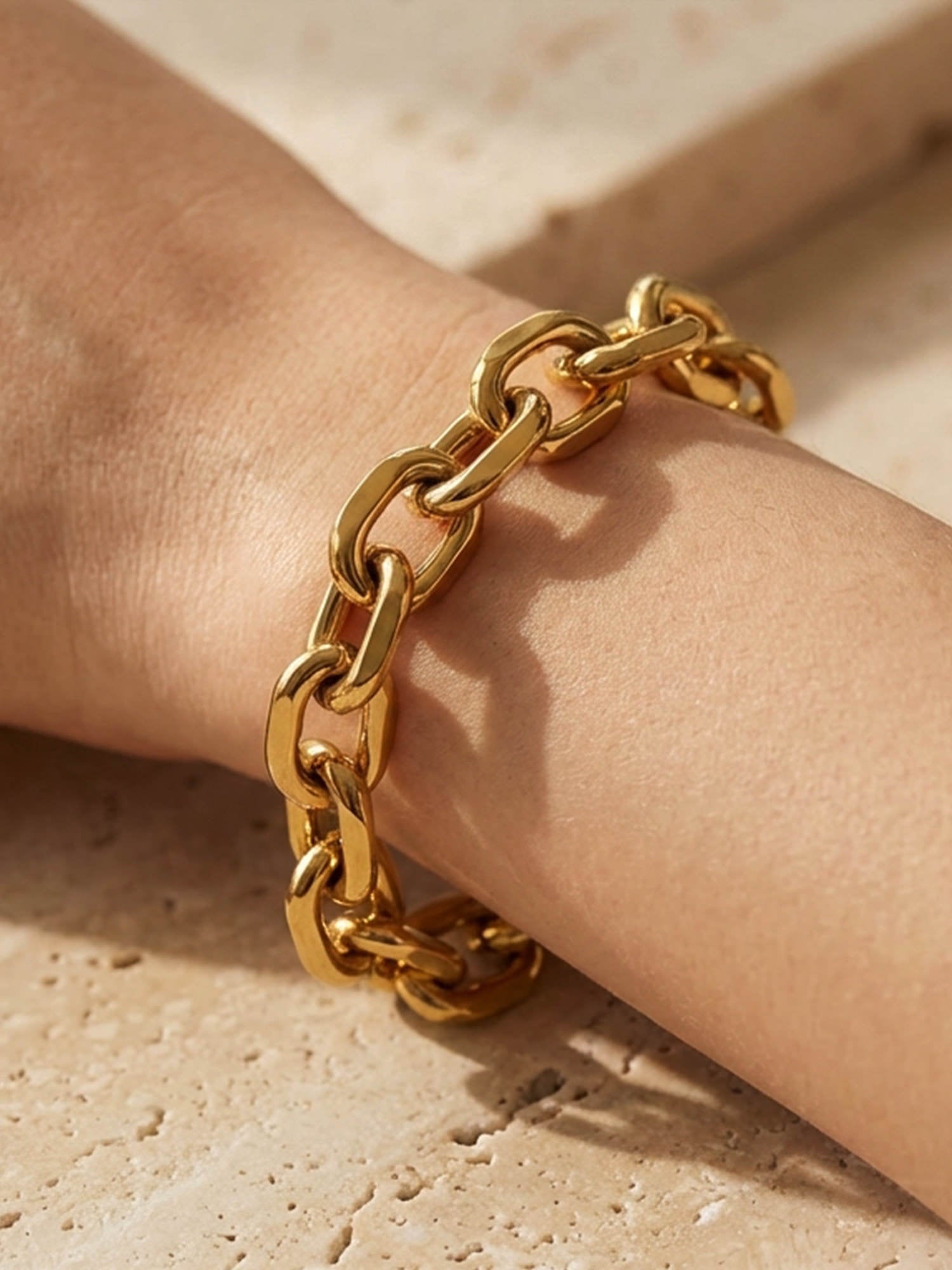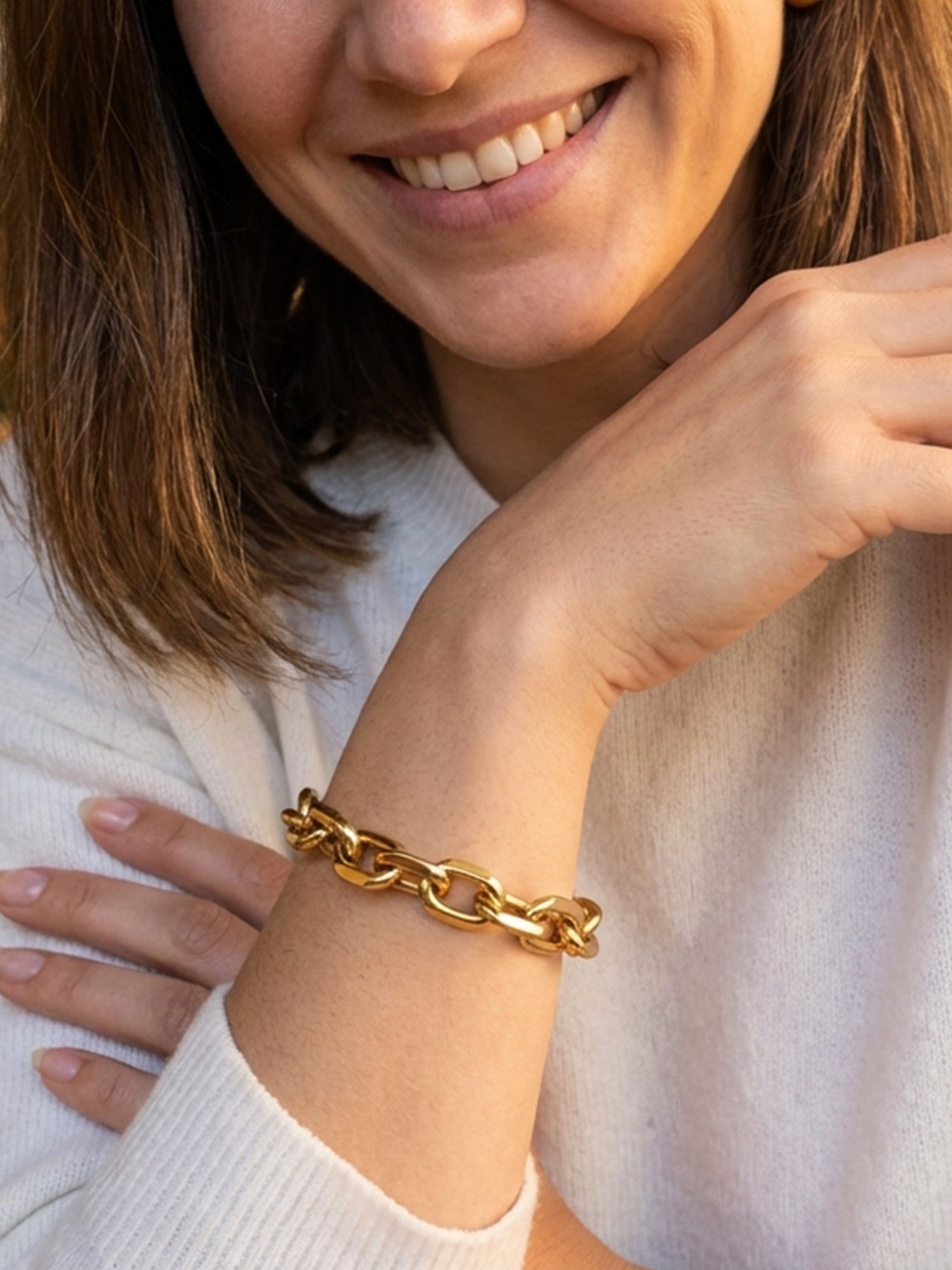 Das Rolo Chain Bracelet Gold ist ein echtes Statement-Piece – bold, modern und mit einem warmen, strahlenden Goldglanz. Durch die hochwertige 18k Vergoldung wirkt es besonders edel, shiny und luxuriös, ohne dabei überladen zu sein. Der klare Glanz und die satte Farbe verleihen dem Armband diesen hochwertigen, cleanen Look, der sofort ins Auge fällt.