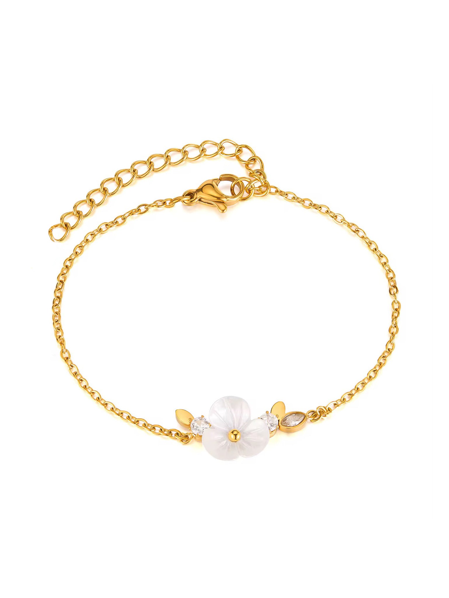 Zartes Armband mit einer Blüte aus handgegossenem Resin, kombiniert mit 18 Karat vergoldetem Edelstahl und funkelnden Zirkonia Steinen. Zeitlos, elegant, hypoallergen & wasserfest.