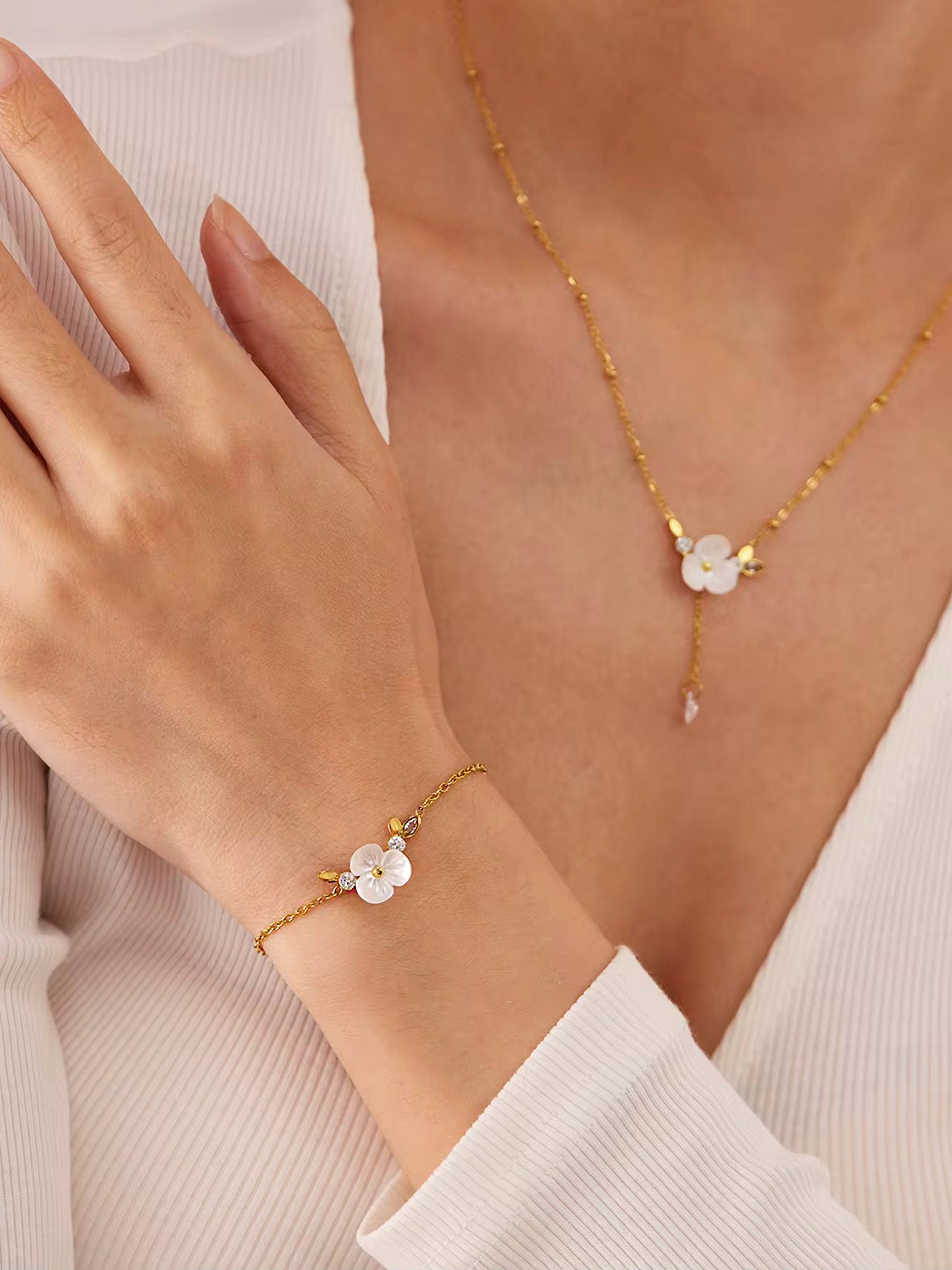 Das Blossom Bracelet Gold vereint filigrane Eleganz mit romantischen Akzenten. Die handgegossene Blüte aus Resin wird von goldfarbenen Blättchen und funkelnden Zirkonia-Steinen umrahmt – ein Symbol für Reinheit und Neubeginn. Ideal als Brautarmband oder als feines Accessoire, das dich auch im Alltag an besondere Momente erinnert.