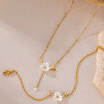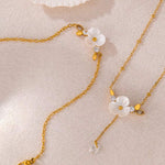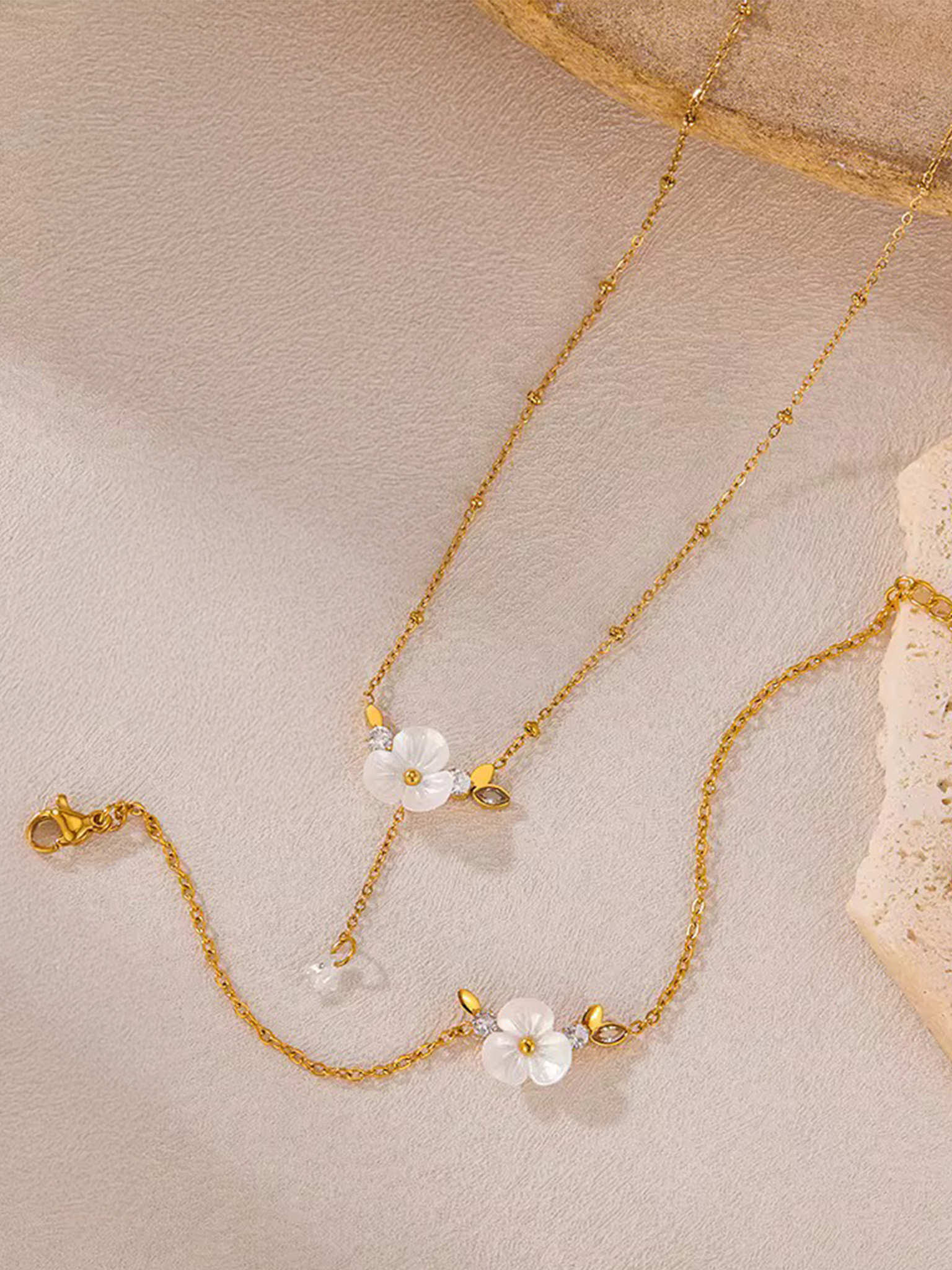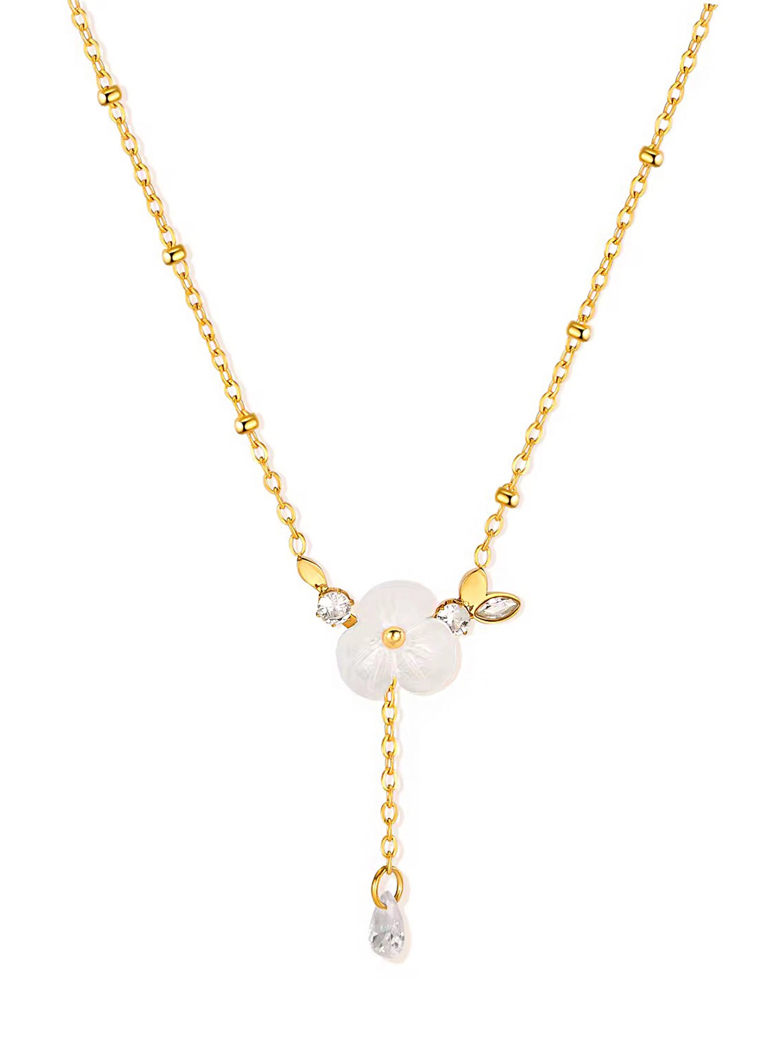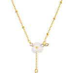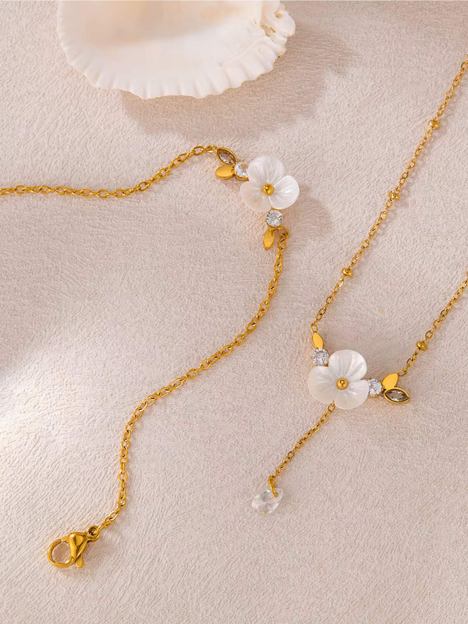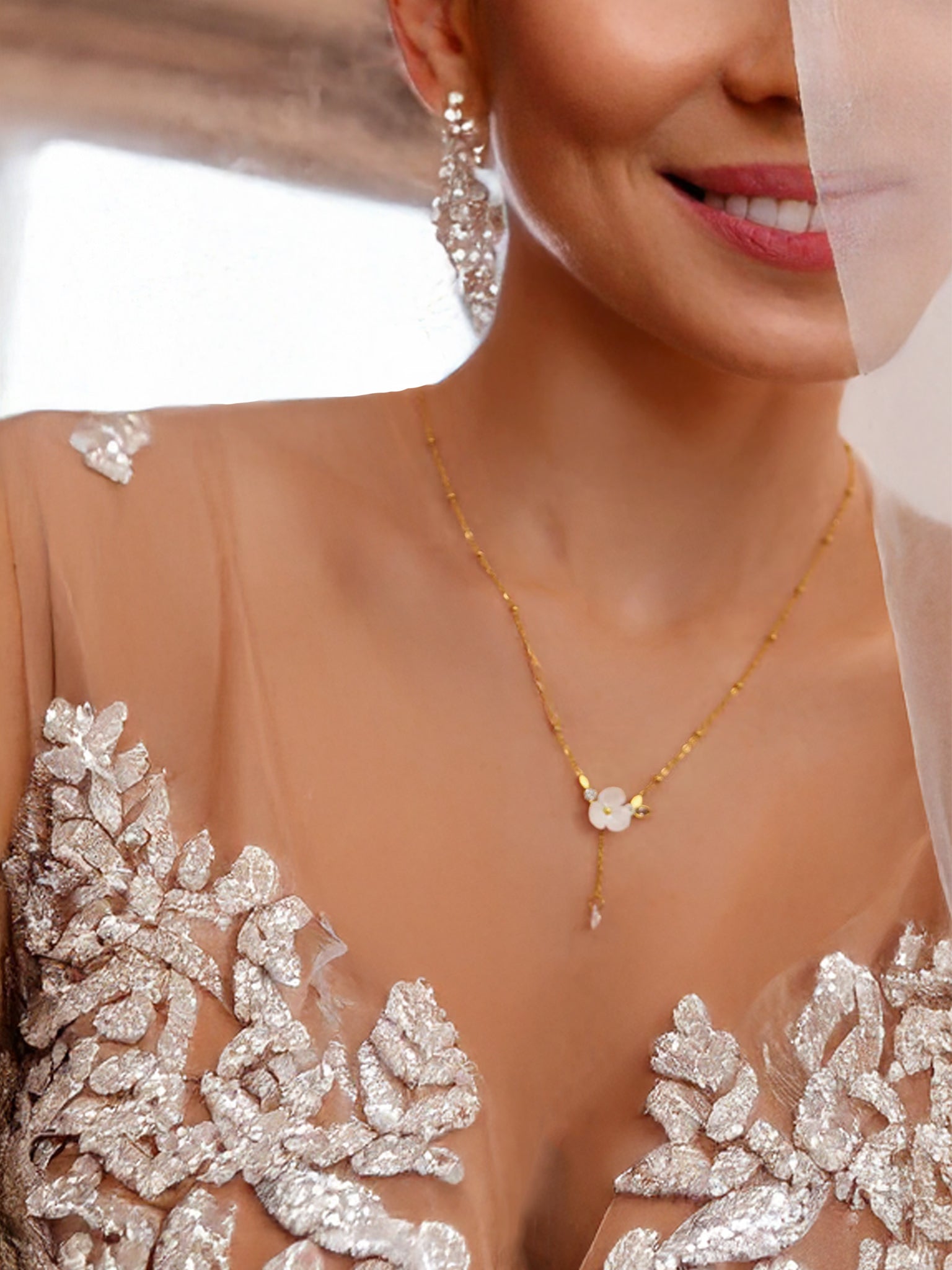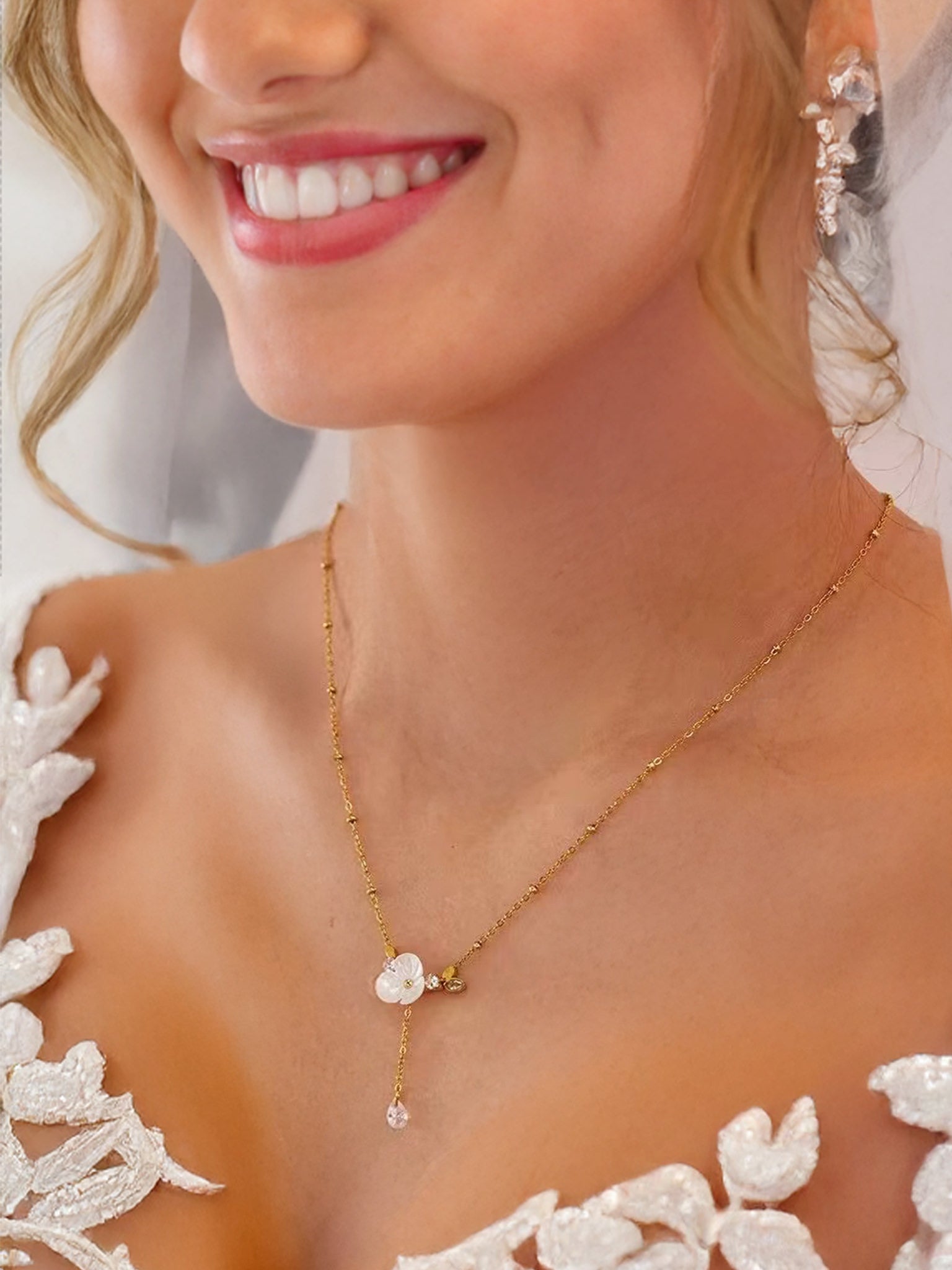Die Blossom Necklace Gold besticht durch ihre einzigartige Kombination aus filigraner Blüte, goldfarbenen Blättchen und funkelnden Zirkonia-Steinen. Der feine Tropfenanhänger rundet das Design elegant ab und verleiht der Kette eine feminine Leichtigkeit. Ob zum Brautkleid, für die Trauzeugin oder als stilvolles Schmuckstück im Alltag – diese Kette ist zeitlos schön und vielseitig tragbar.