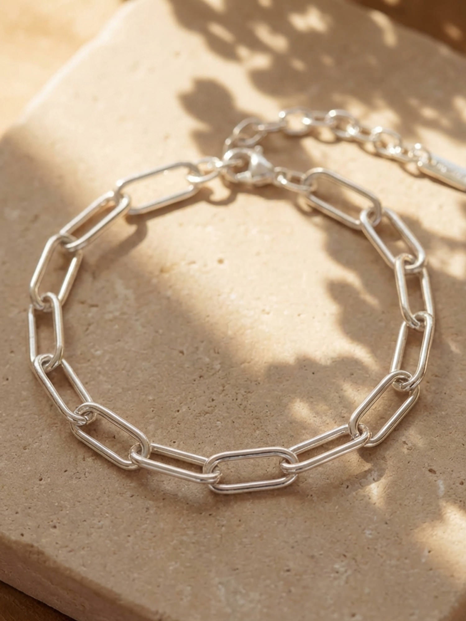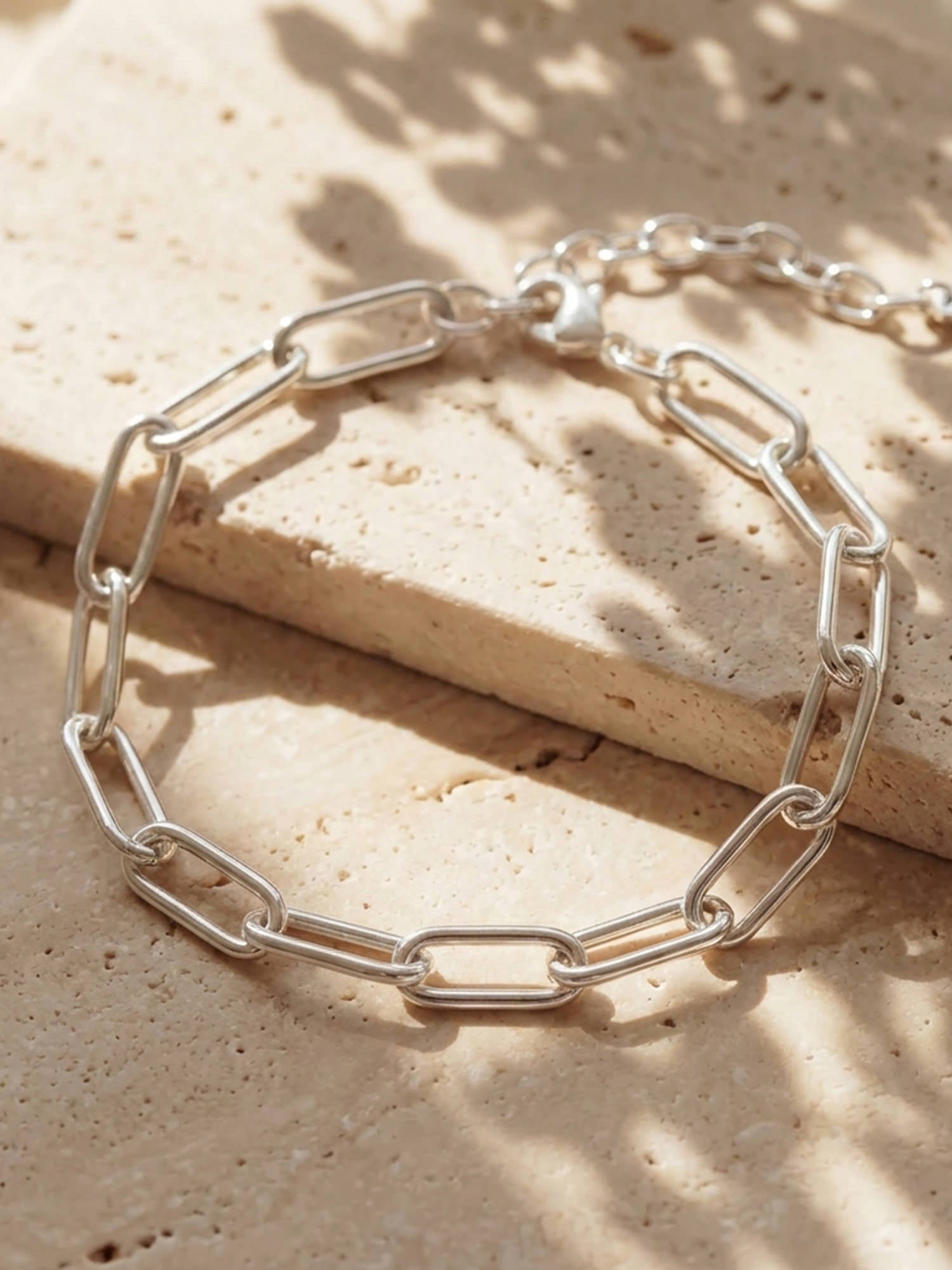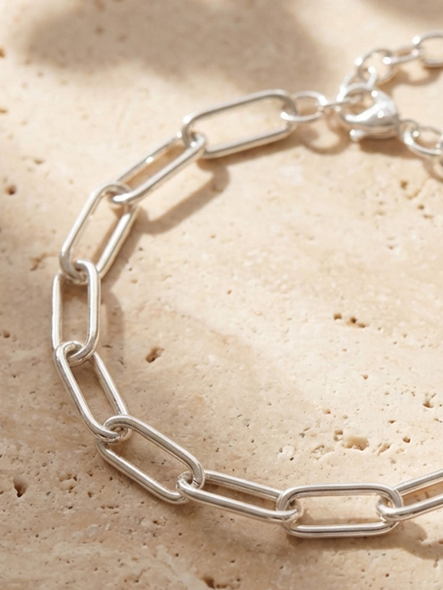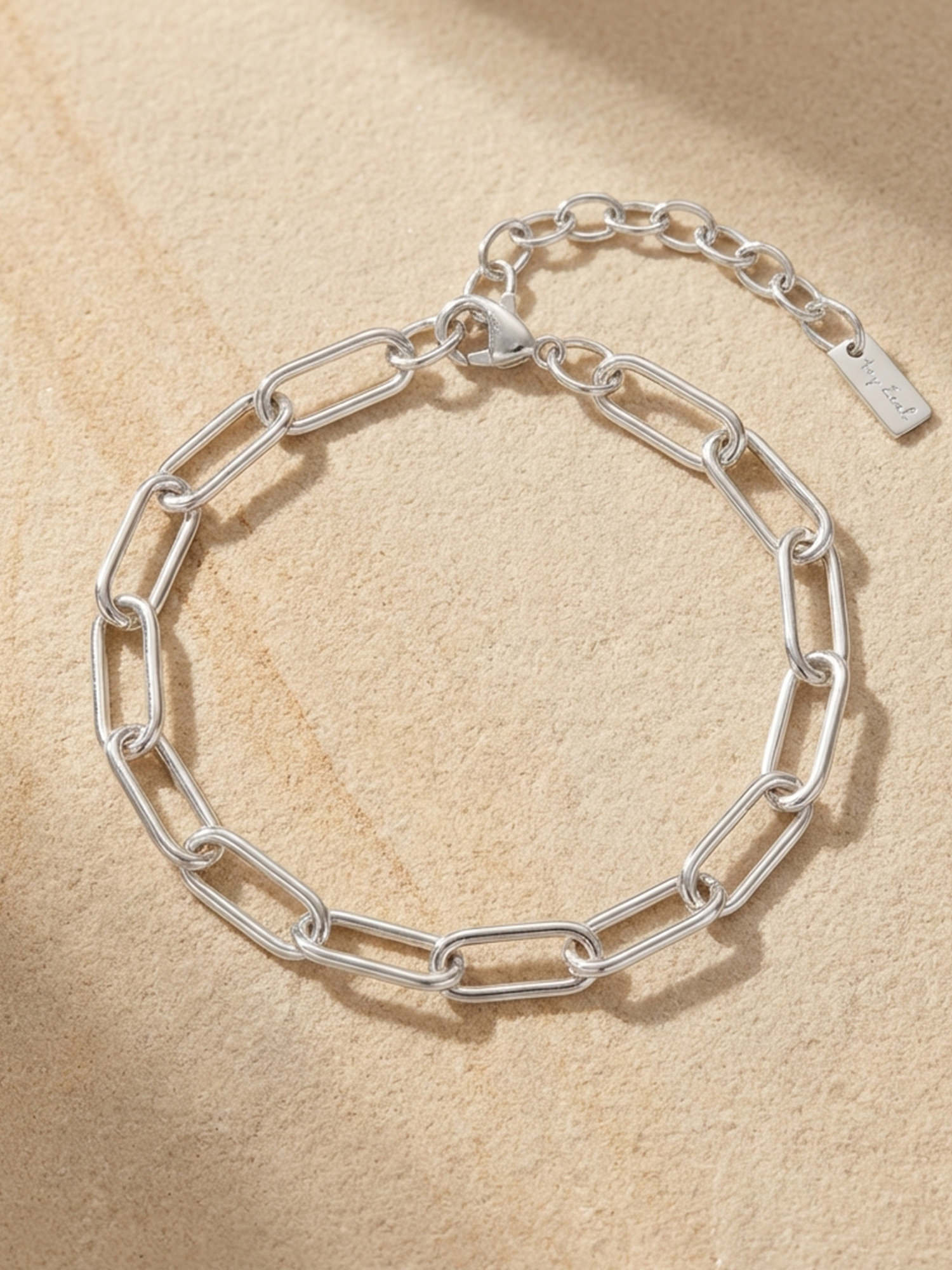 Das Big Paperclip Anklet Silber überzeugt durch sein klares Design und seine moderne Ausstrahlung. Die großen, länglichen Paperclip-Glieder legen sich ruhig um den Knöchel und verleihen dem Fußkettchen einen reduzierten, aber selbstbewussten Look – perfekt für minimalistische Sommerstyles.