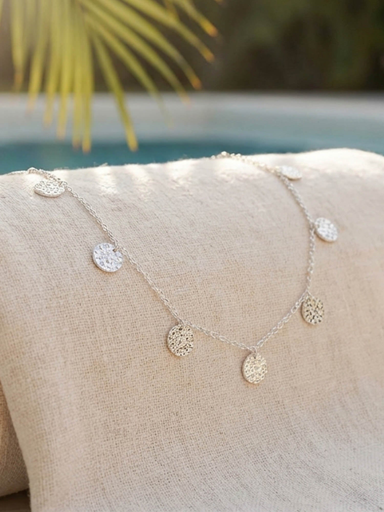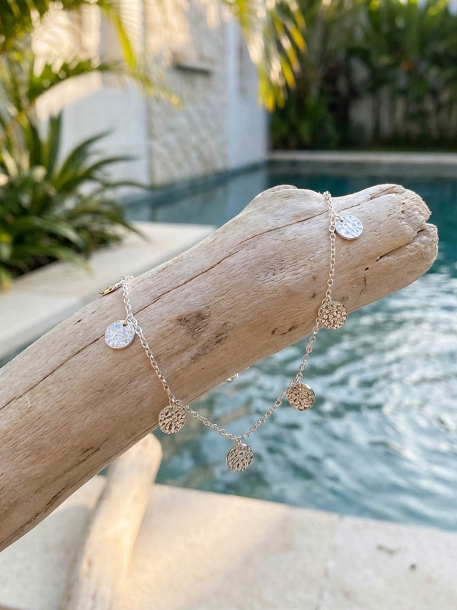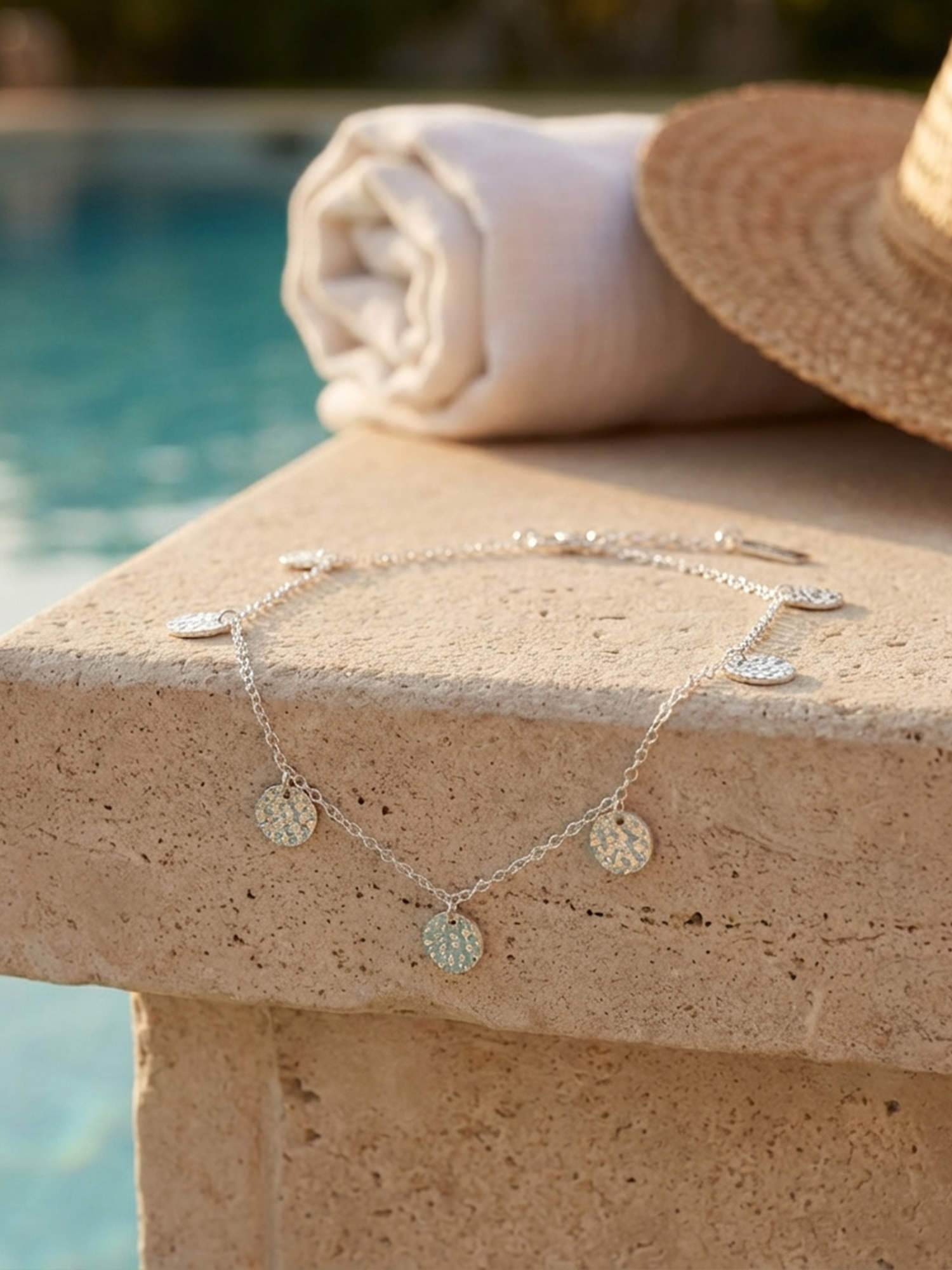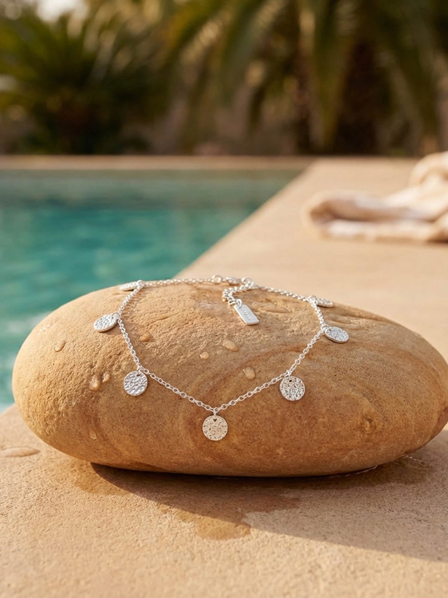 Das Hammered Coins Anklet Silber überzeugt durch seinen modernen, hochwertigen Weißgold-Look, der bewusst kühler und klarer wirkt als klassisches Silber. Die feine Versilberung auf Edelstahl verleiht dem Fußkettchen einen eleganten, fast weißgoldähnlichen Glanz – zeitlos, pur und besonders edel.