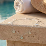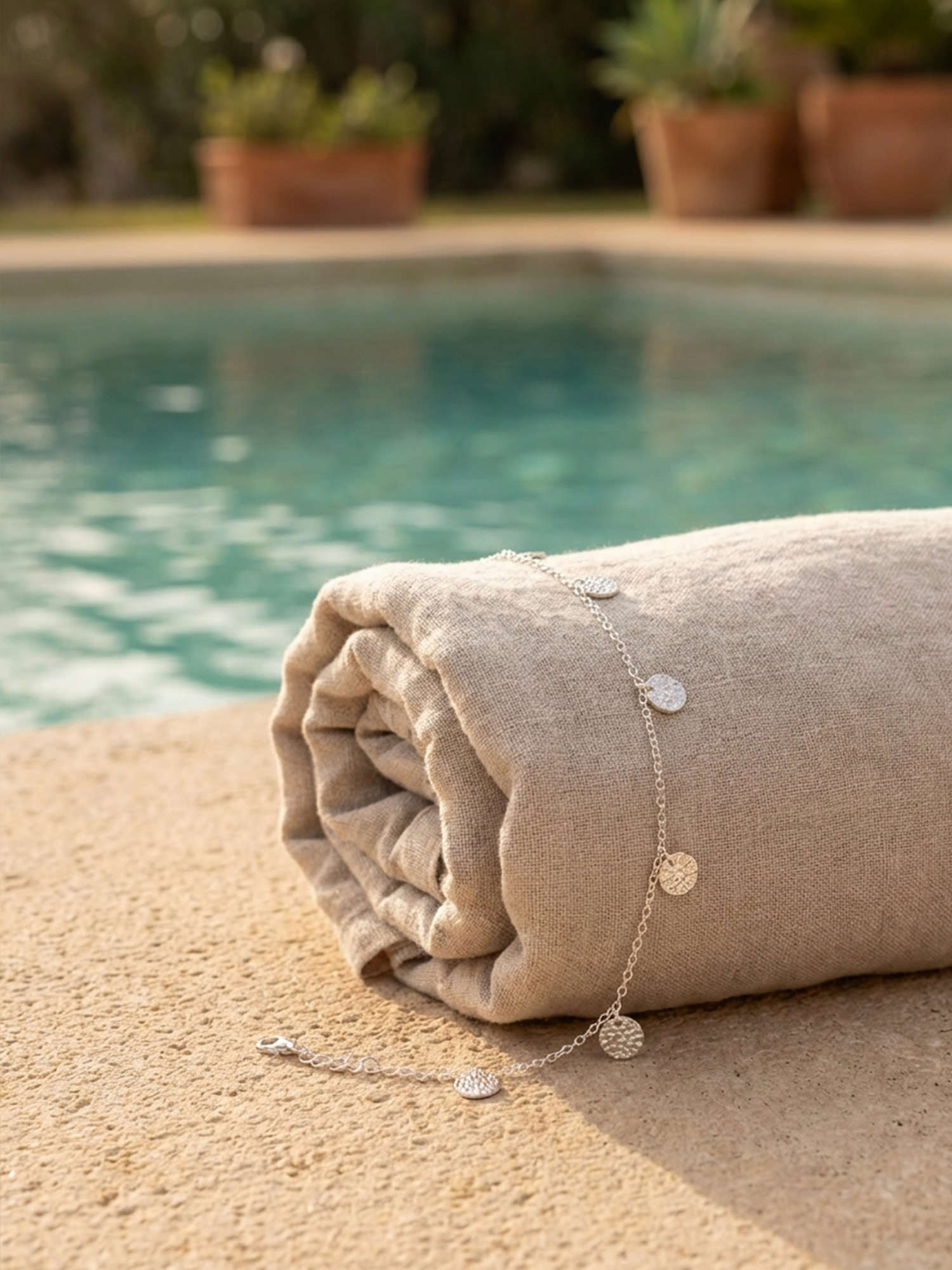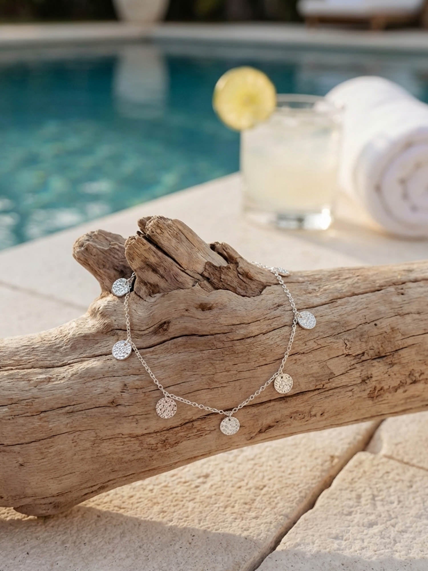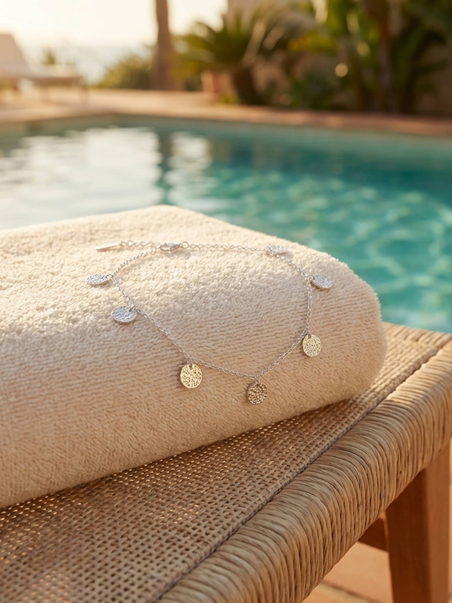 Das Hammered Coins Anklet Silber überzeugt durch seinen modernen, hochwertigen Weißgold-Look, der bewusst kühler und klarer wirkt als klassisches Silber. Die feine Versilberung auf Edelstahl verleiht dem Fußkettchen einen eleganten, fast weißgoldähnlichen Glanz – zeitlos, pur und besonders edel.