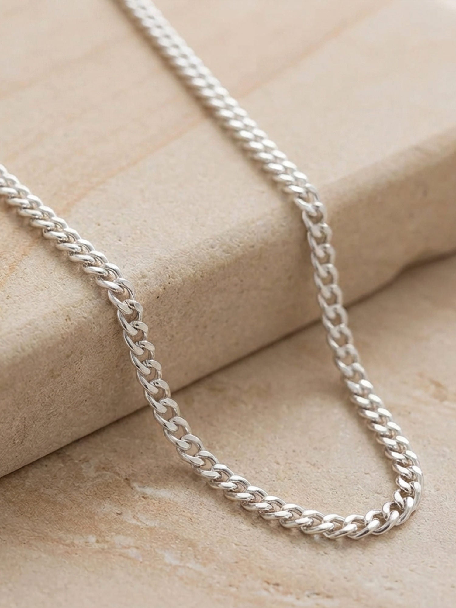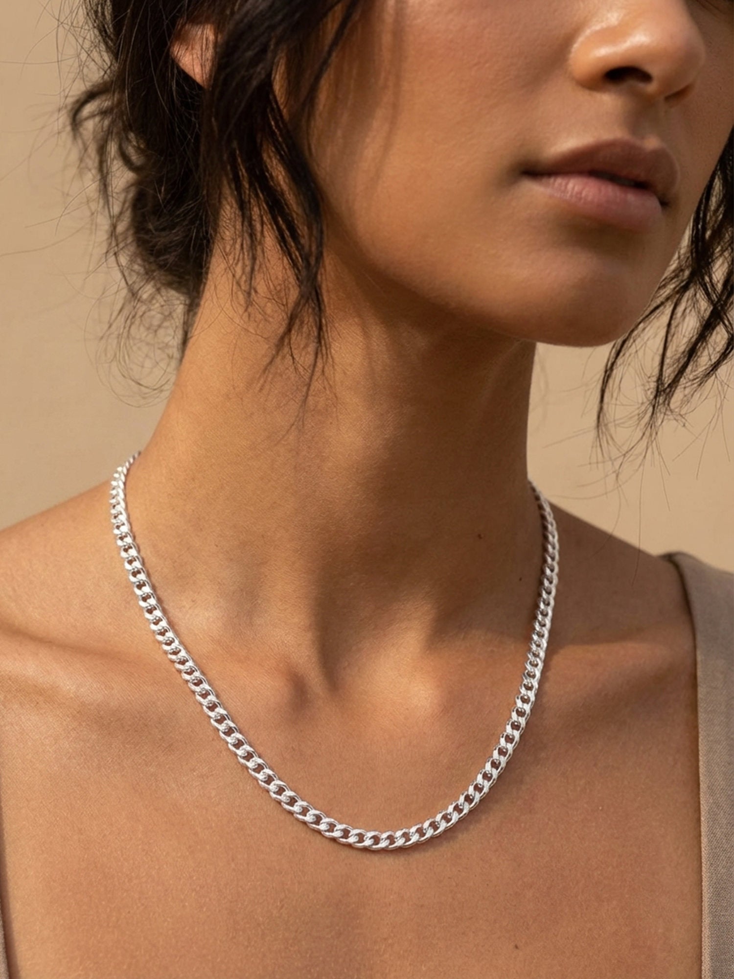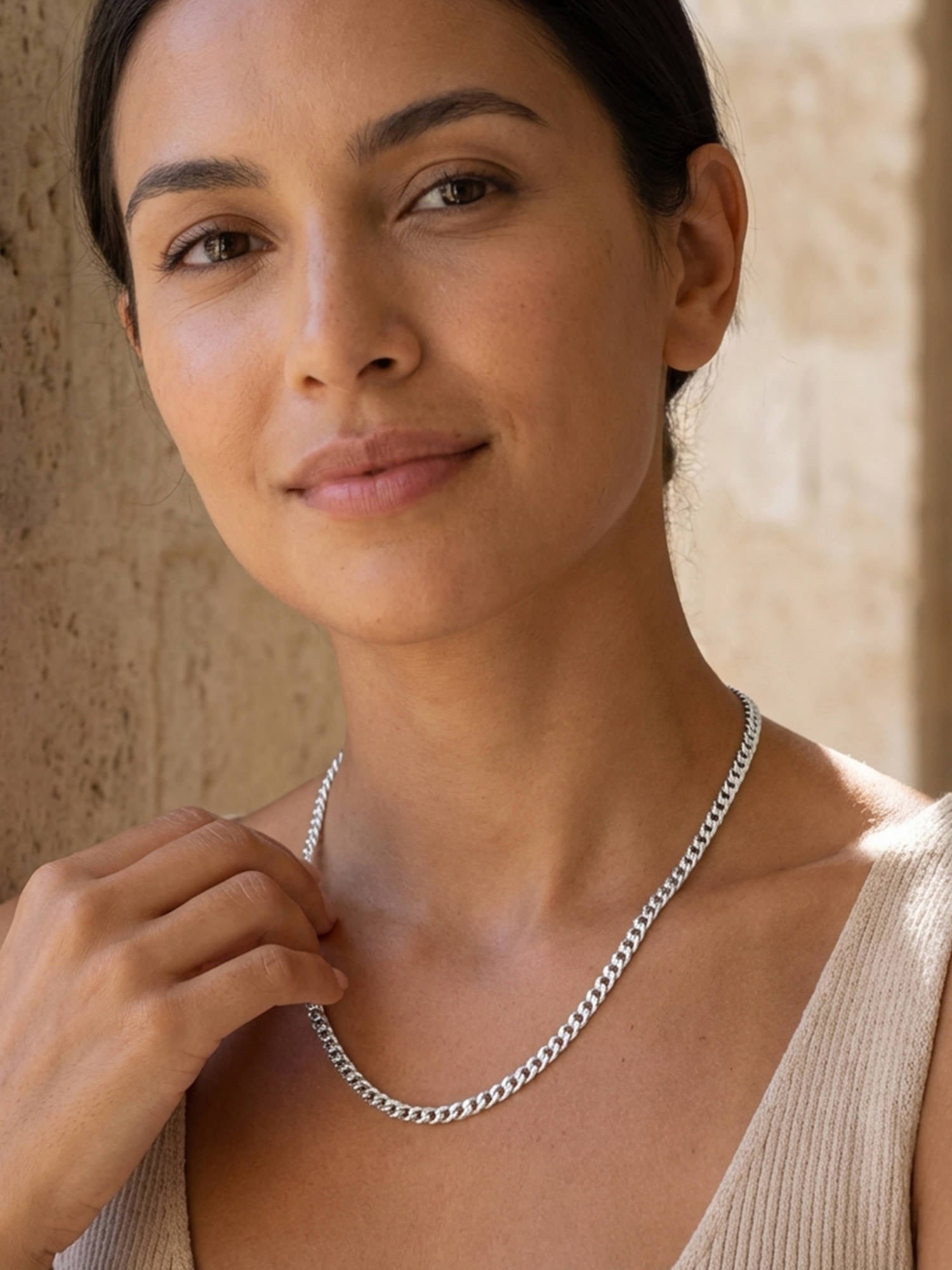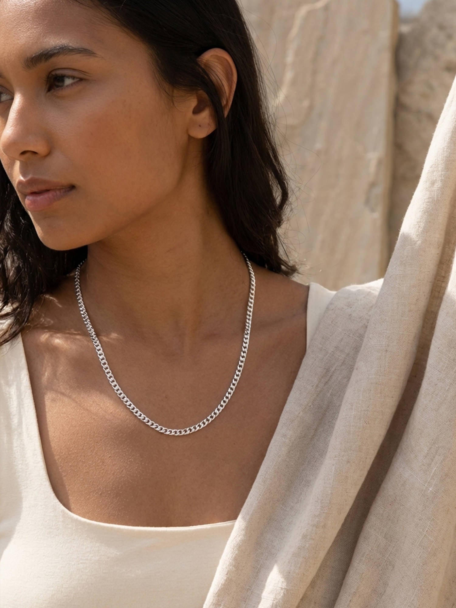 Die Cuban Chain Necklace Silber ist ein boldes Statement-Piece, das trotzdem clean und elegant wirkt. Die markante Panzerkette liegt flach am Hals und reflektiert das Licht mit jedem Glied – modern, glänzend und mit genau dem richtigen Maß an Präsenz.