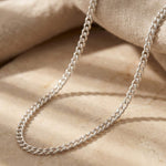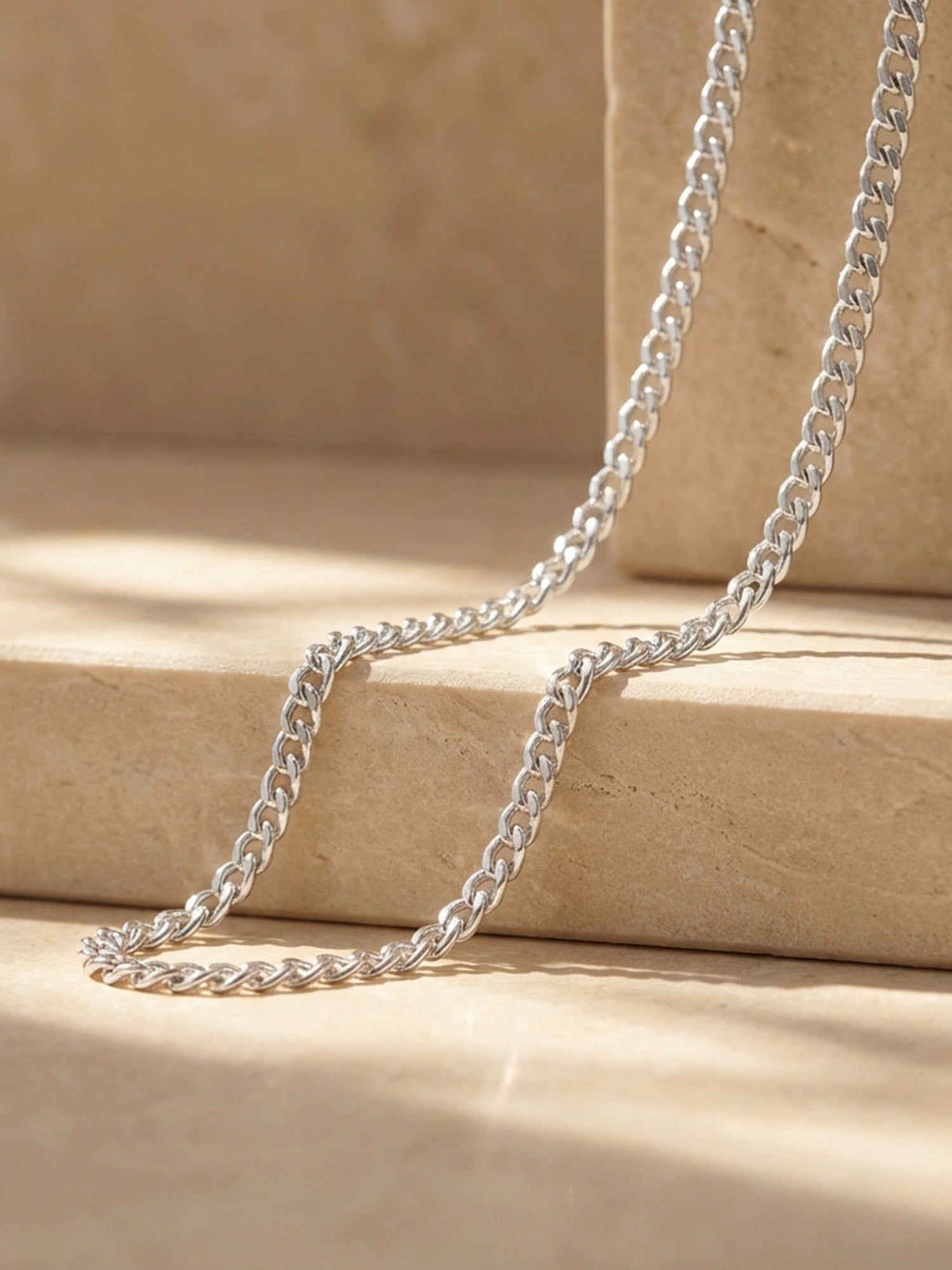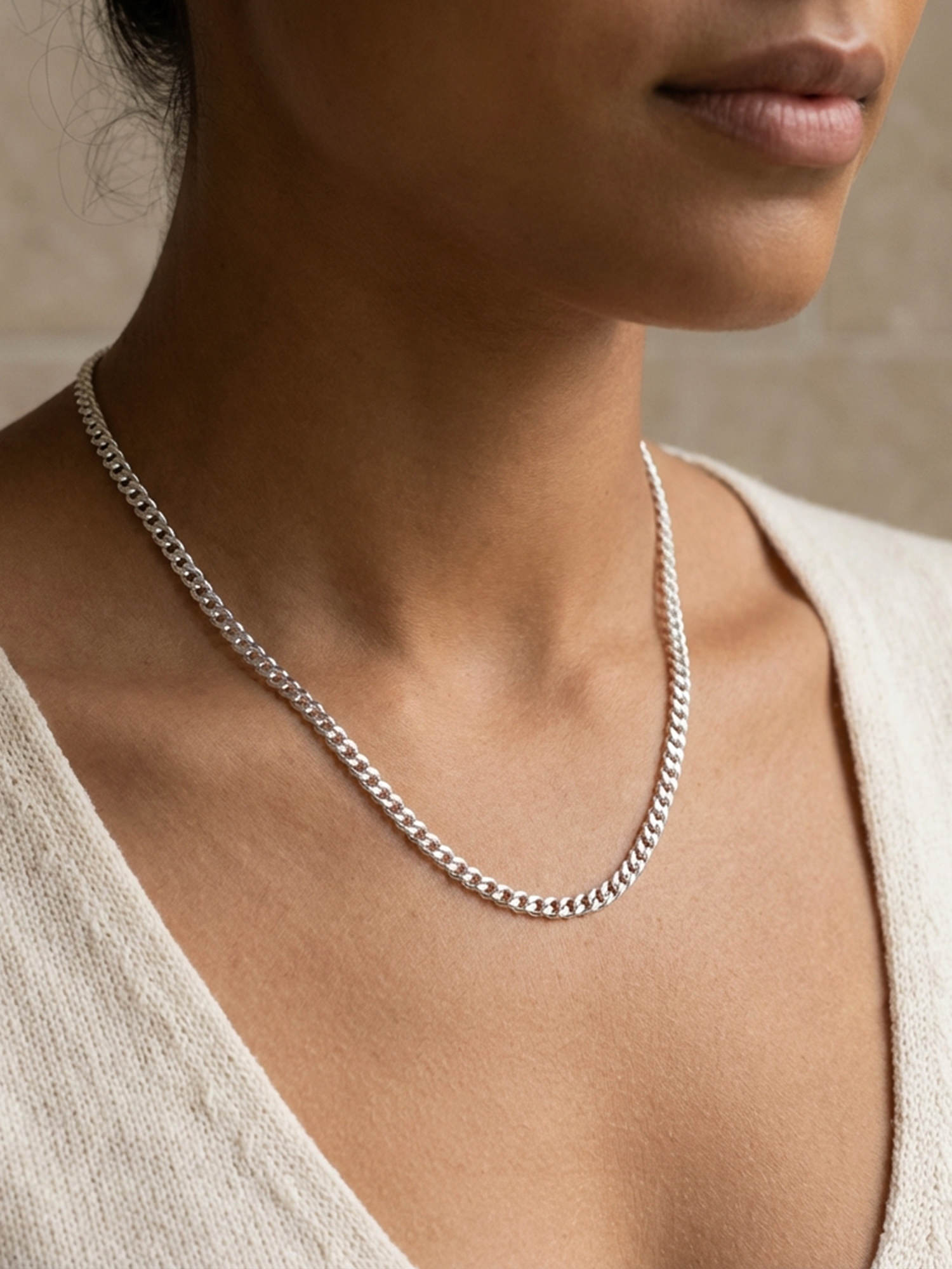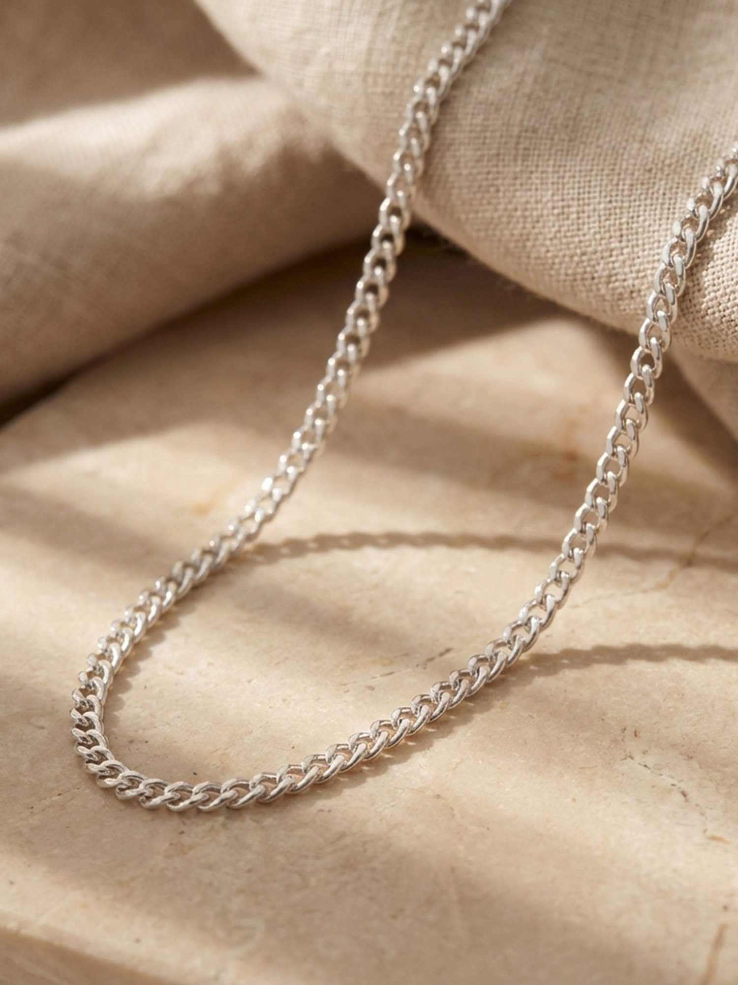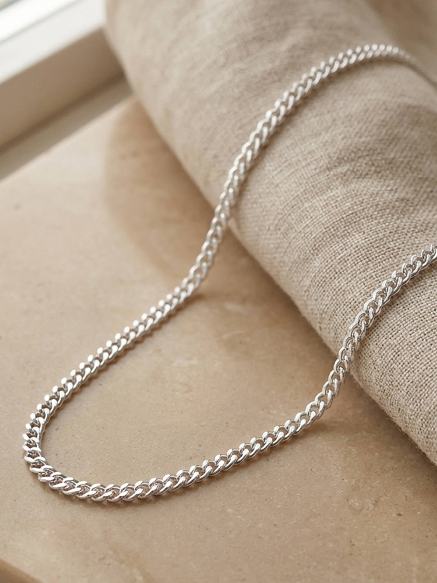 Die Cuban Chain Necklace Silber ist ein boldes Statement-Piece, das trotzdem clean und elegant wirkt. Die markante Panzerkette liegt flach am Hals und reflektiert das Licht mit jedem Glied – modern, glänzend und mit genau dem richtigen Maß an Präsenz.