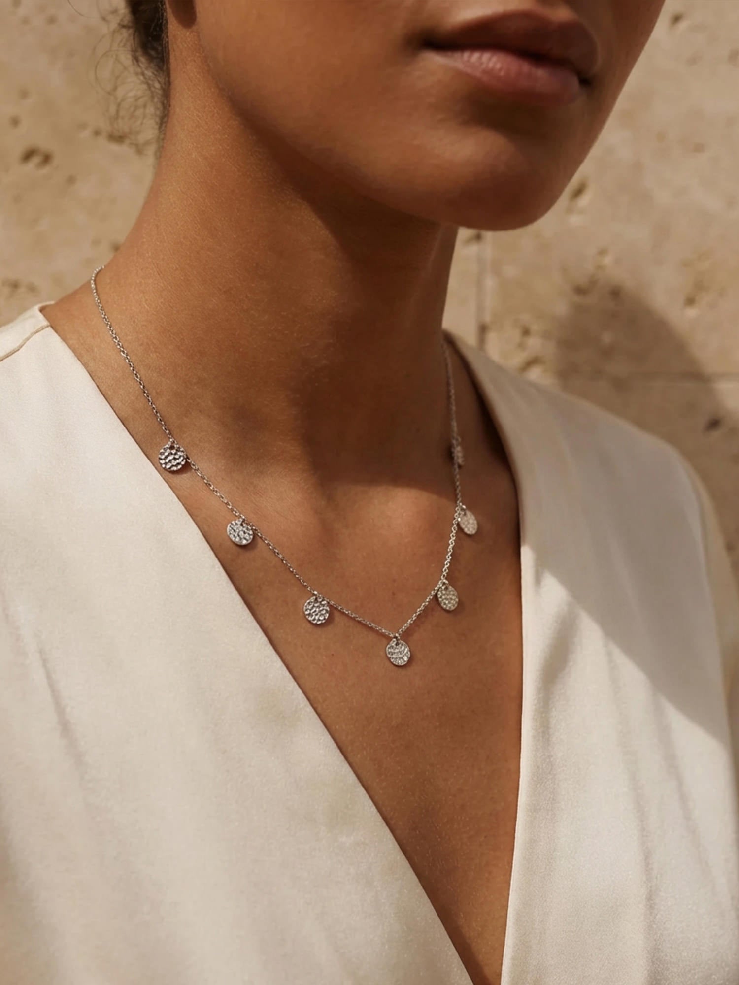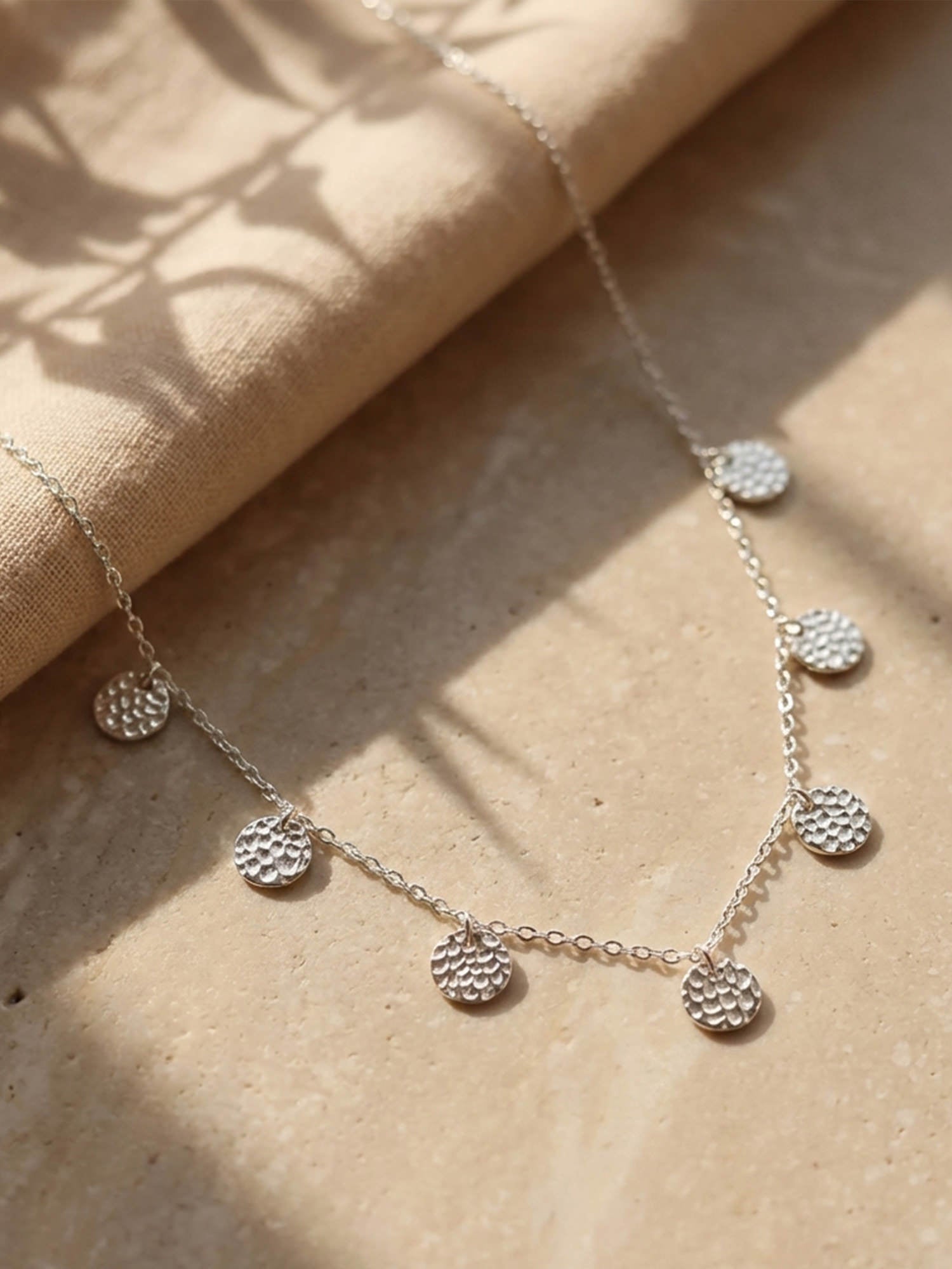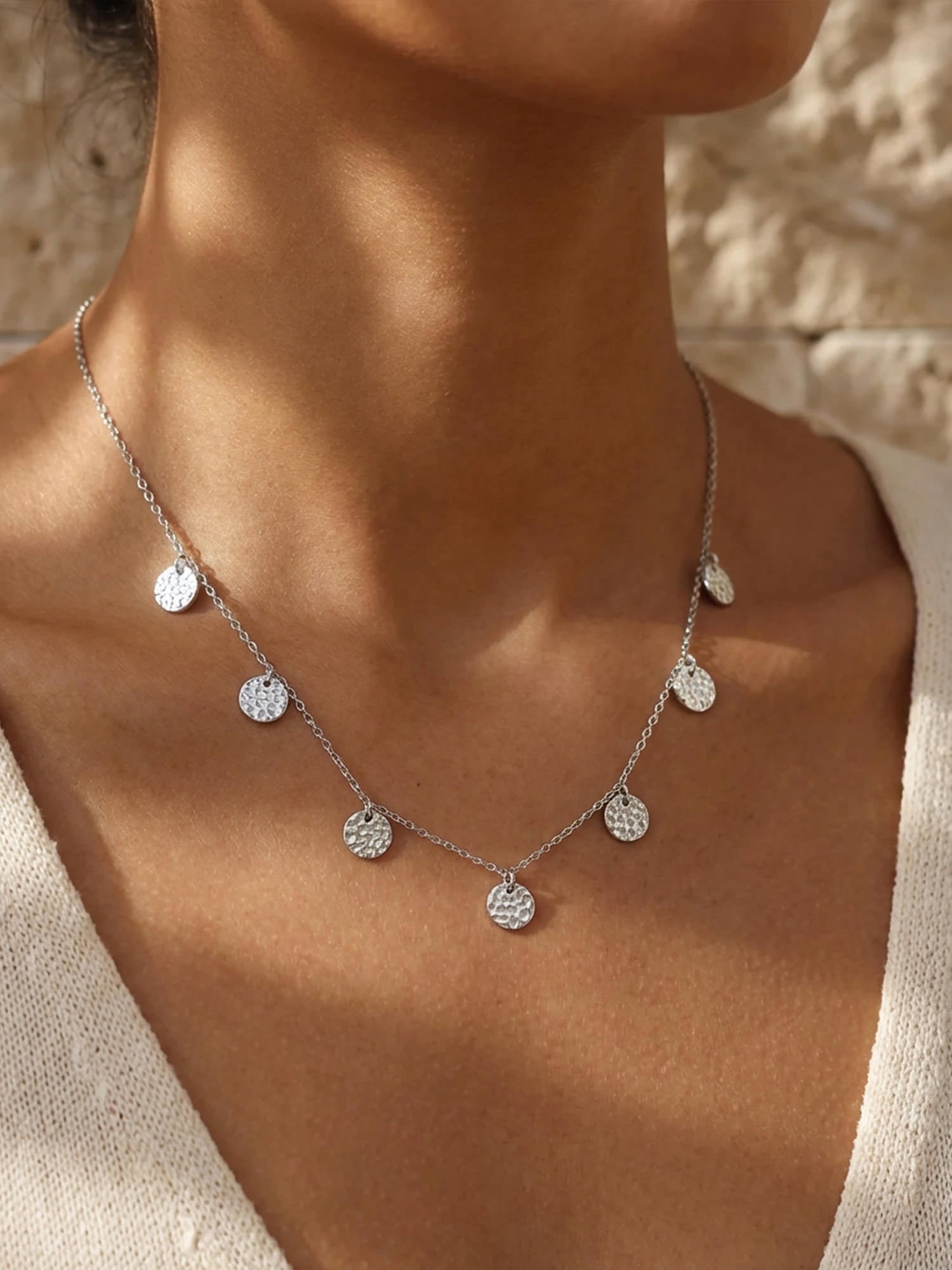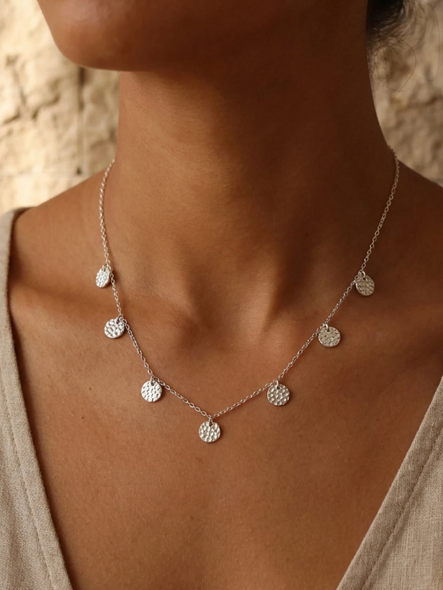 Die gehämmerten Medaillons sind einzeln angebracht und können sich leicht bewegen, was der Kette einen natürlichen Flow und eine hochwertige Haptik verleiht. Durch das Lichtspiel auf der strukturierten Oberfläche entsteht ein subtiler Glanz, der nie aufdringlich wirkt, sondern charmant ergänzt.
