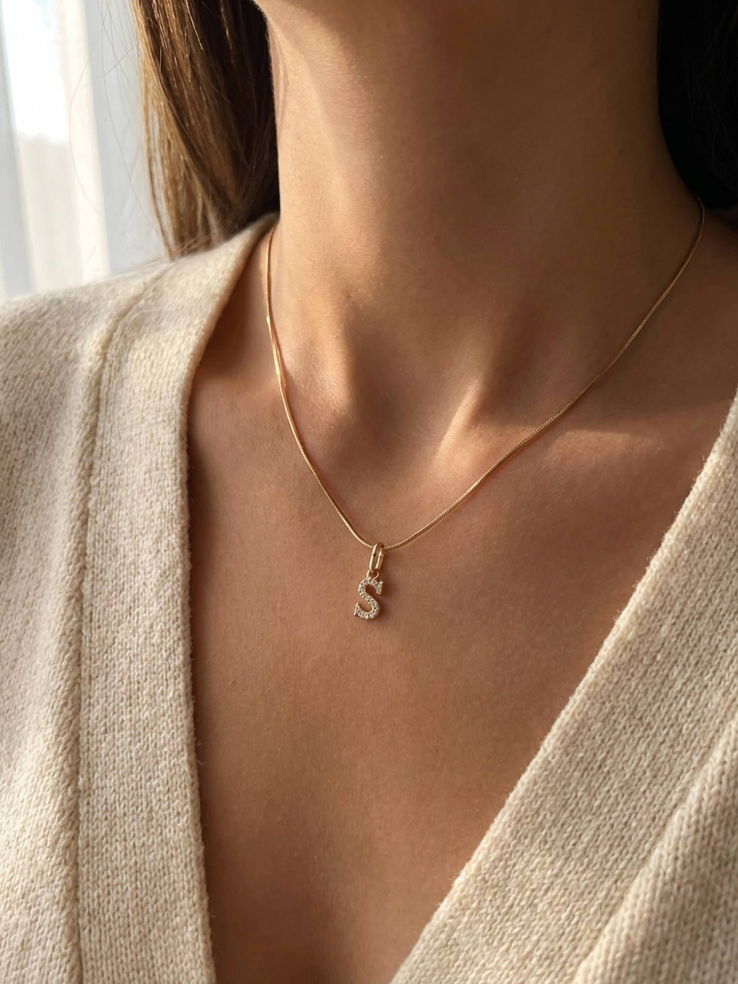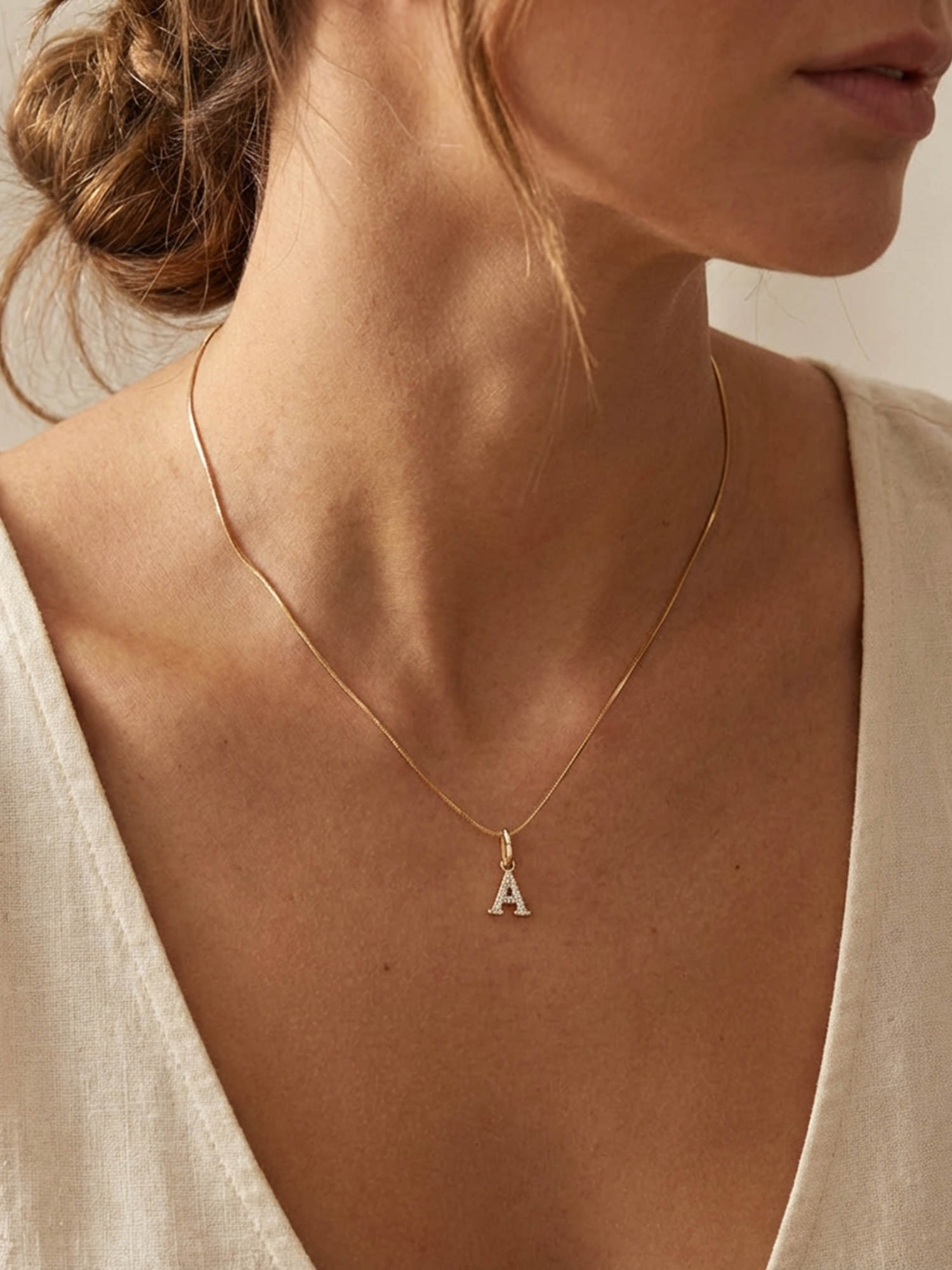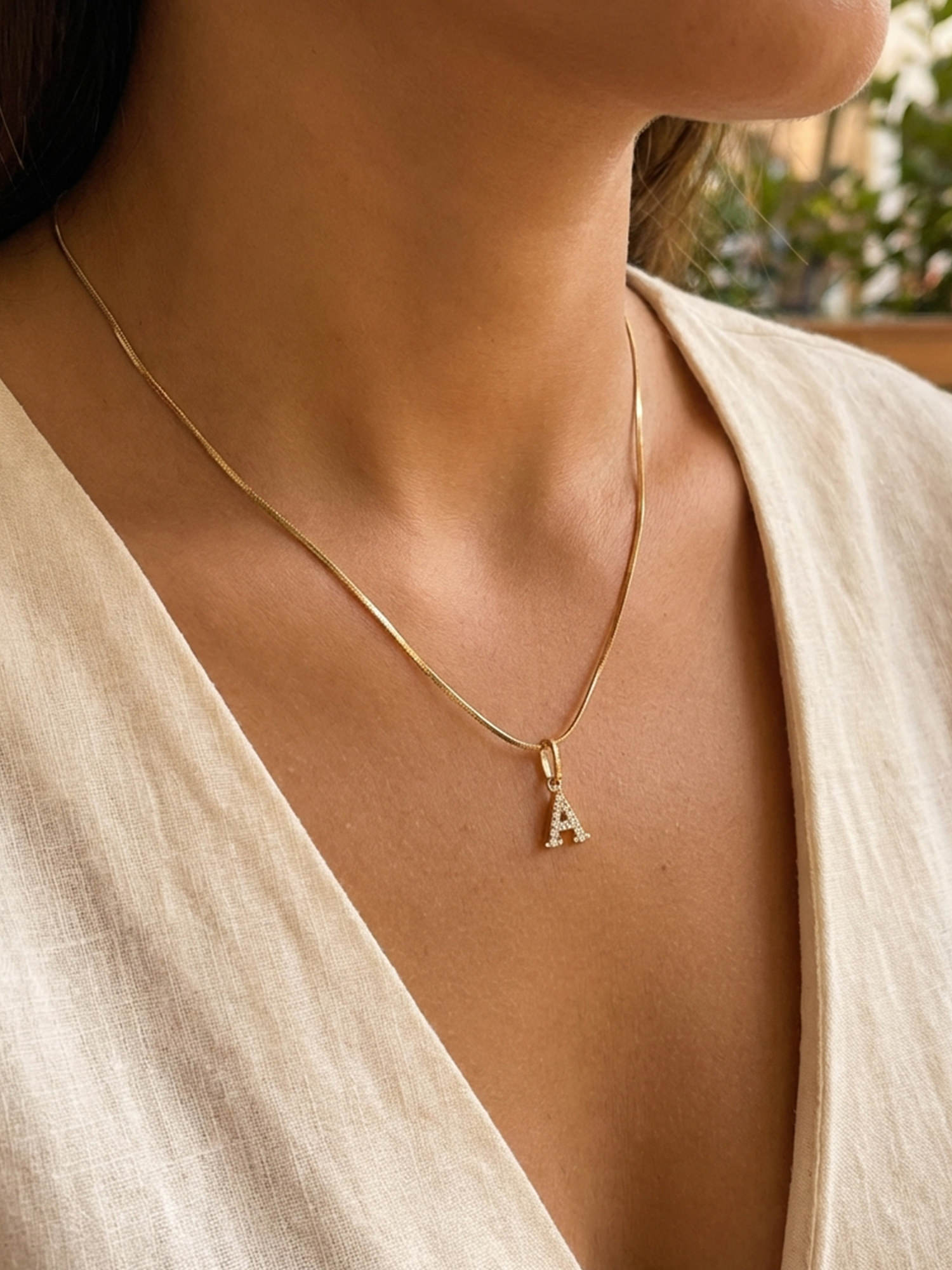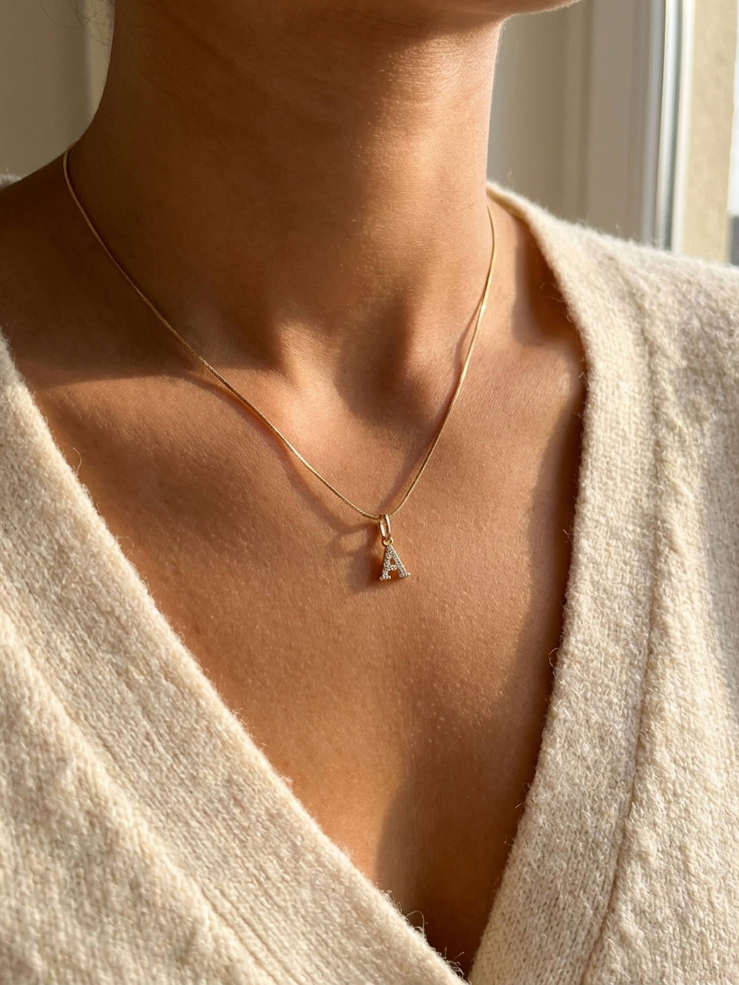 Die filigrane Letter Necklace kombiniert eine elegante Herringbone-Halskette mit einem funkelnden Zirkonia-Buchstabenanhänger. Ein zeitloses Schmuckstück, das Persönlichkeit und Stil vereint – perfekt als Geschenk oder für dich selbst!