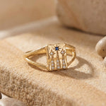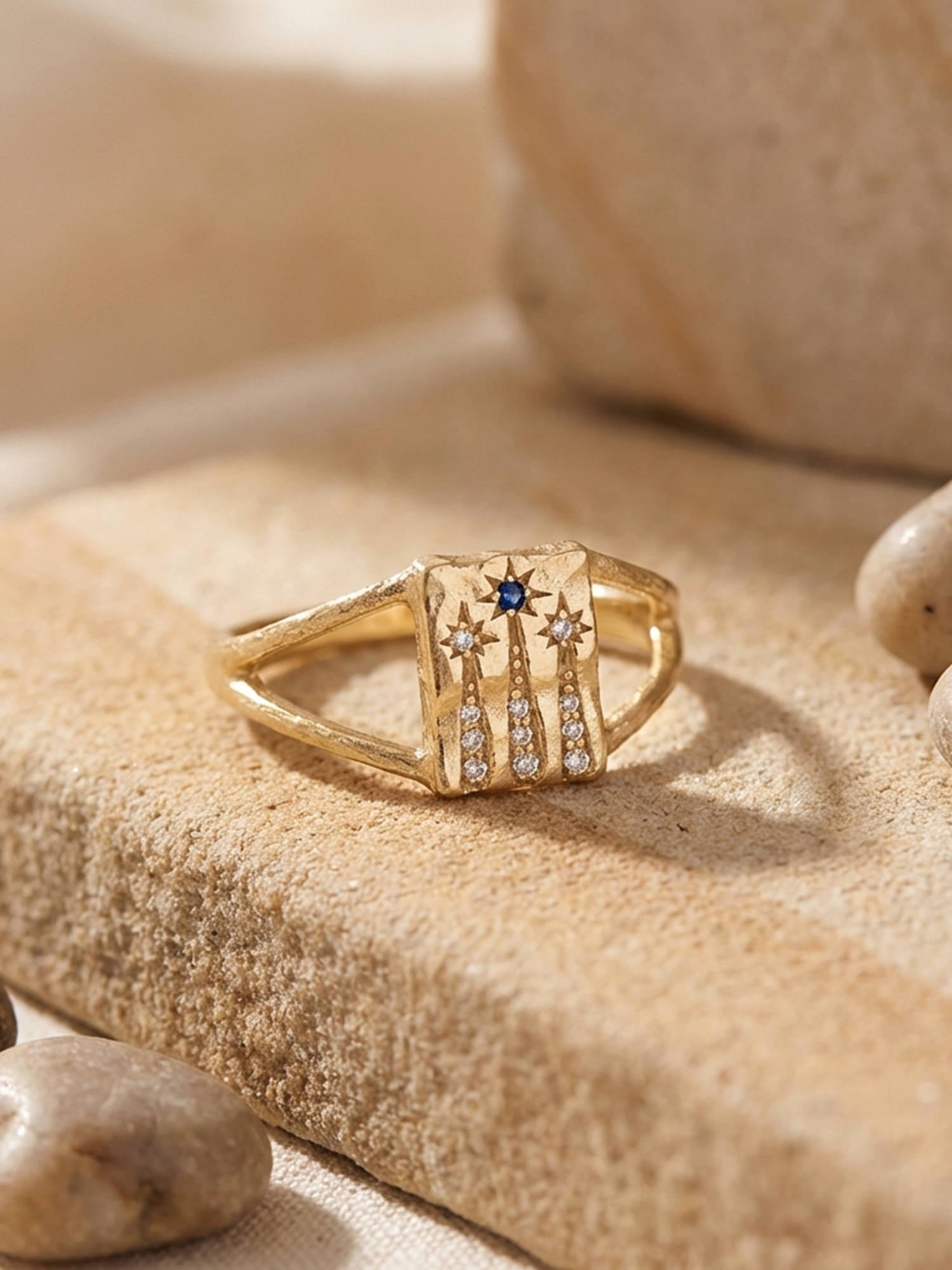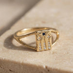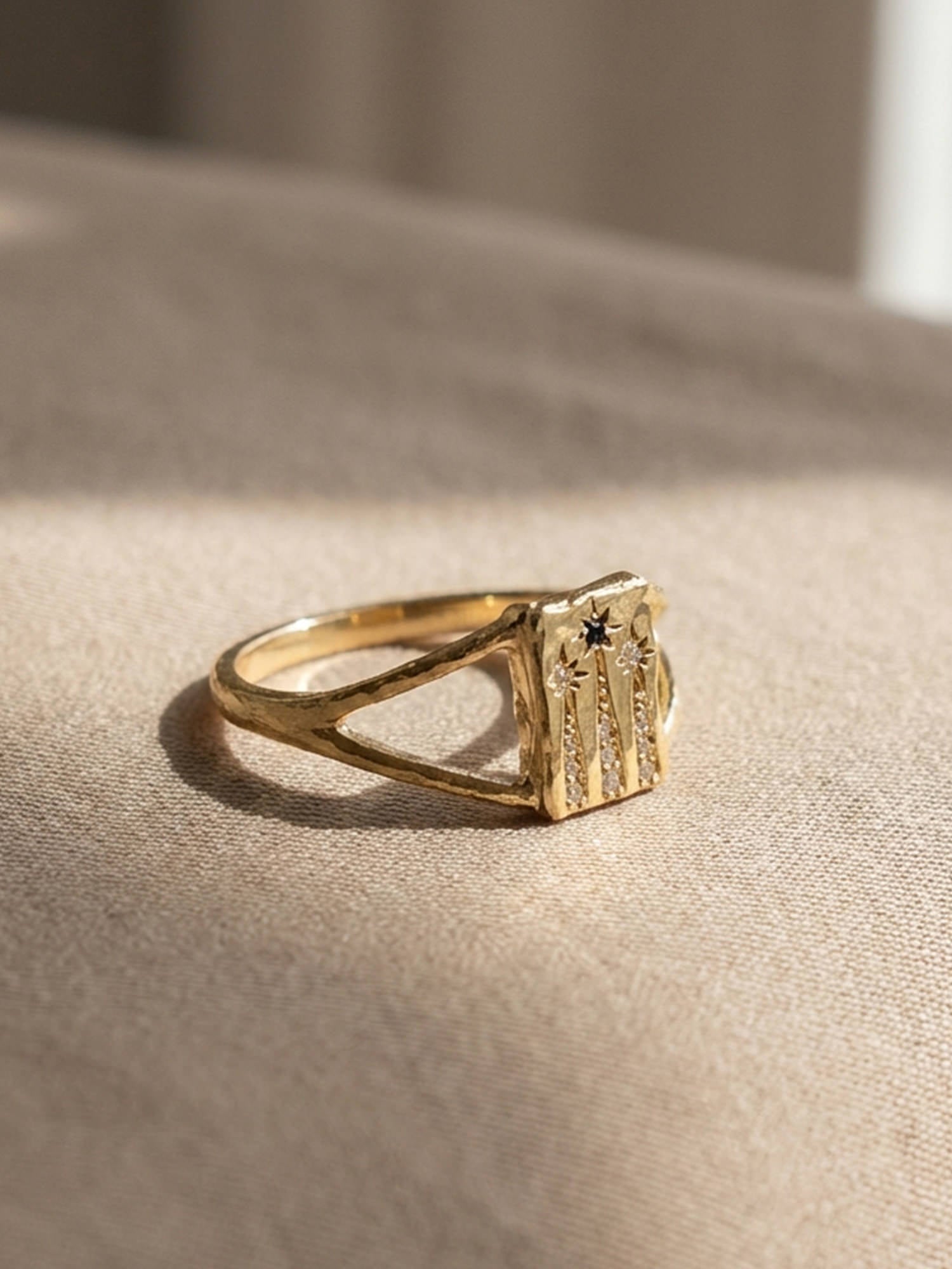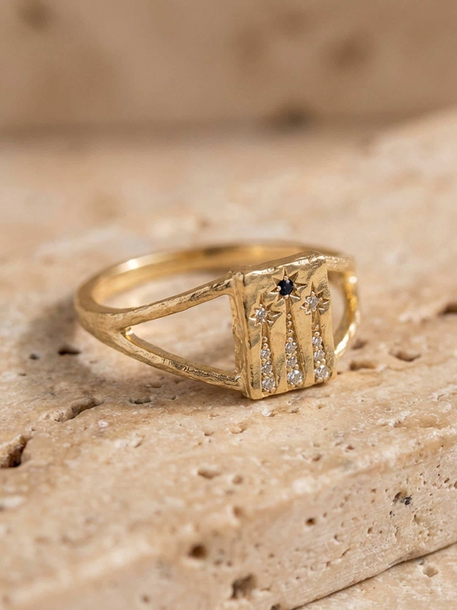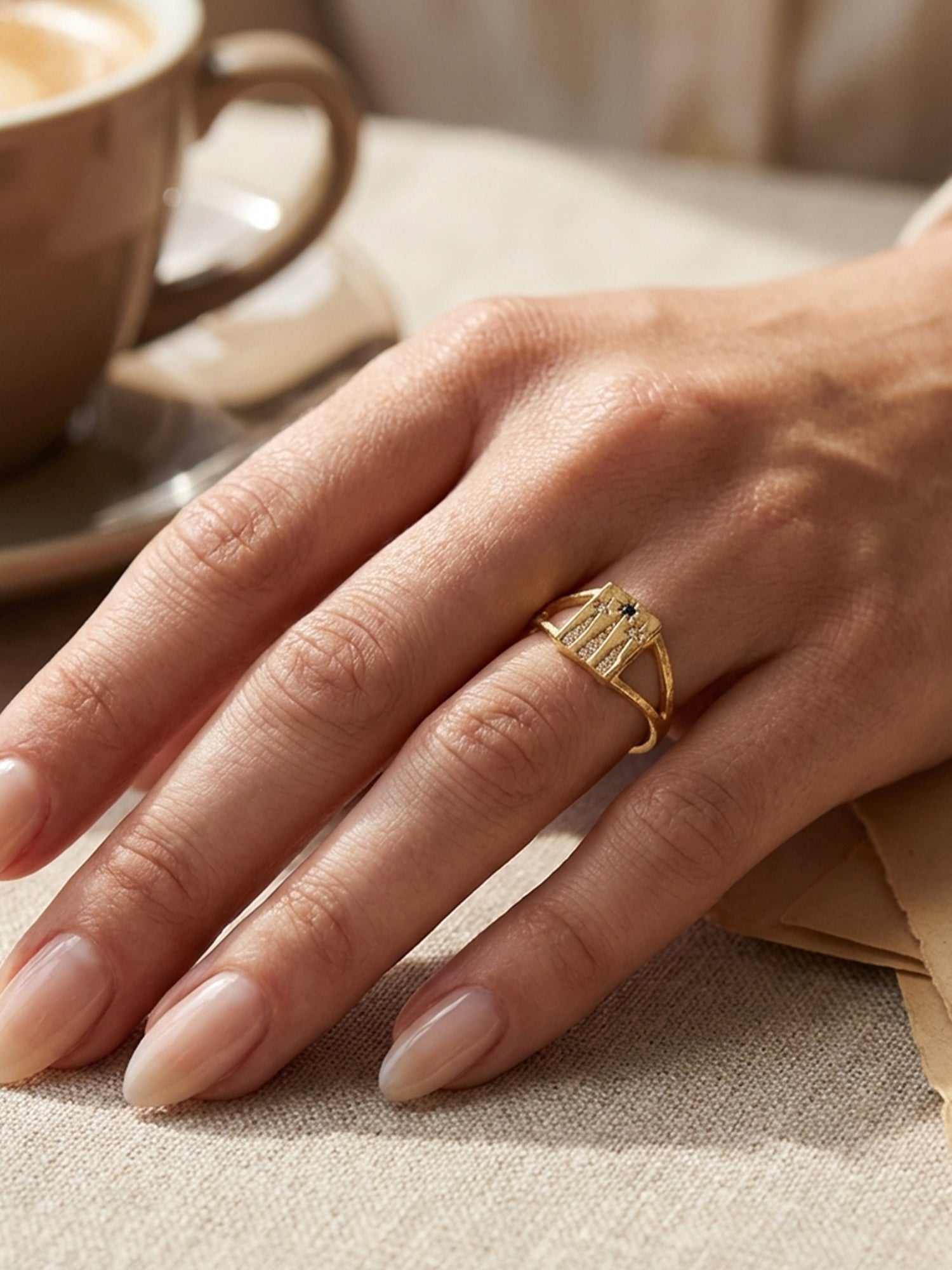 Im Zentrum sitzt ein tiefschwarzer Zirkonia-Stein, der wie ein beleuchtetes Fenster oder ein leuchtender Akzent in der nächtlichen Skyline wirkt. Der warme 18-Karat-Goldglanz verleiht dem Design zusätzlich eine luxuriöse Tiefe und macht den Ring zu einem echten Blickfang.
