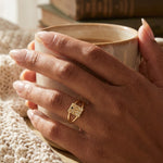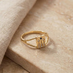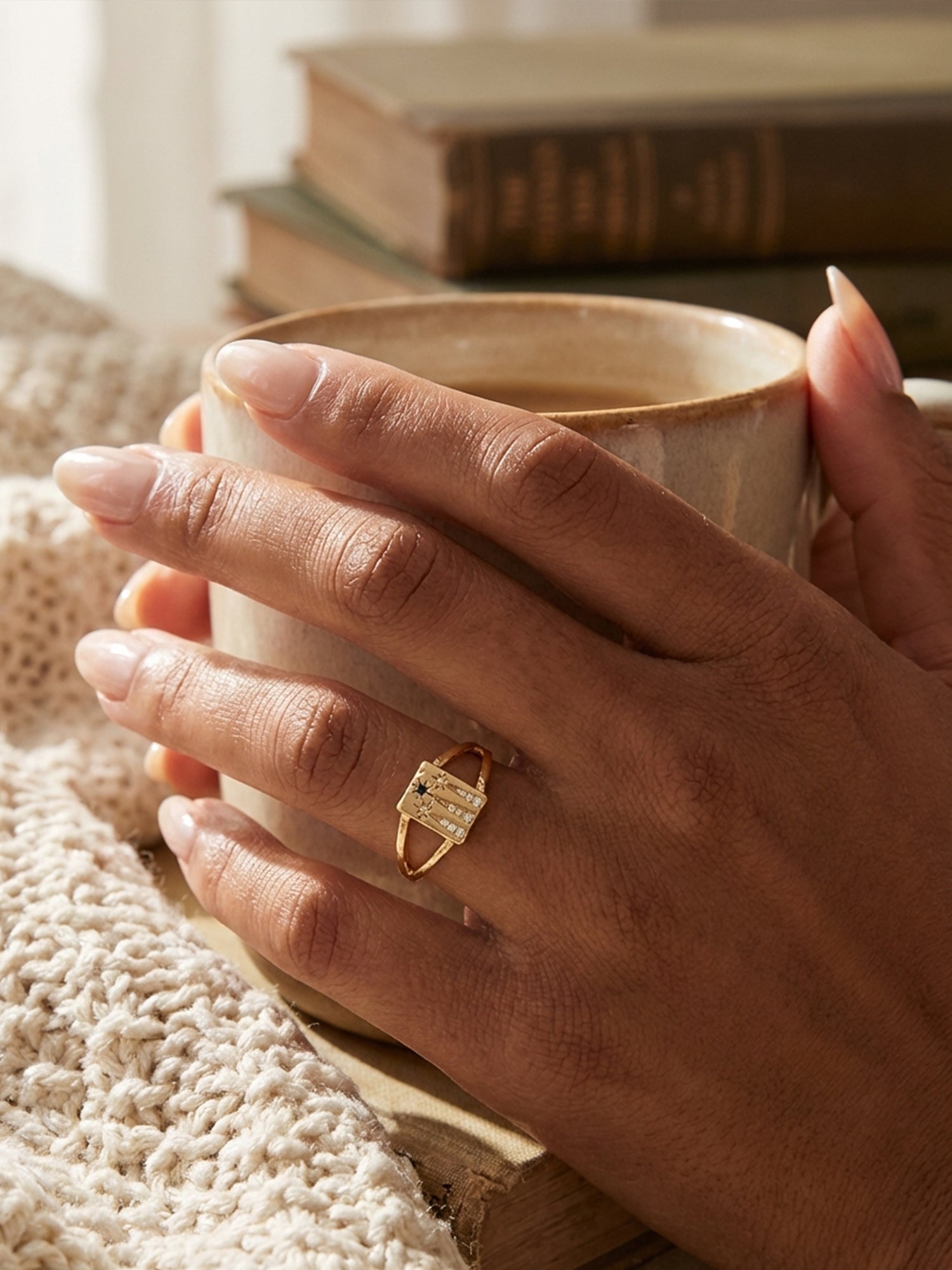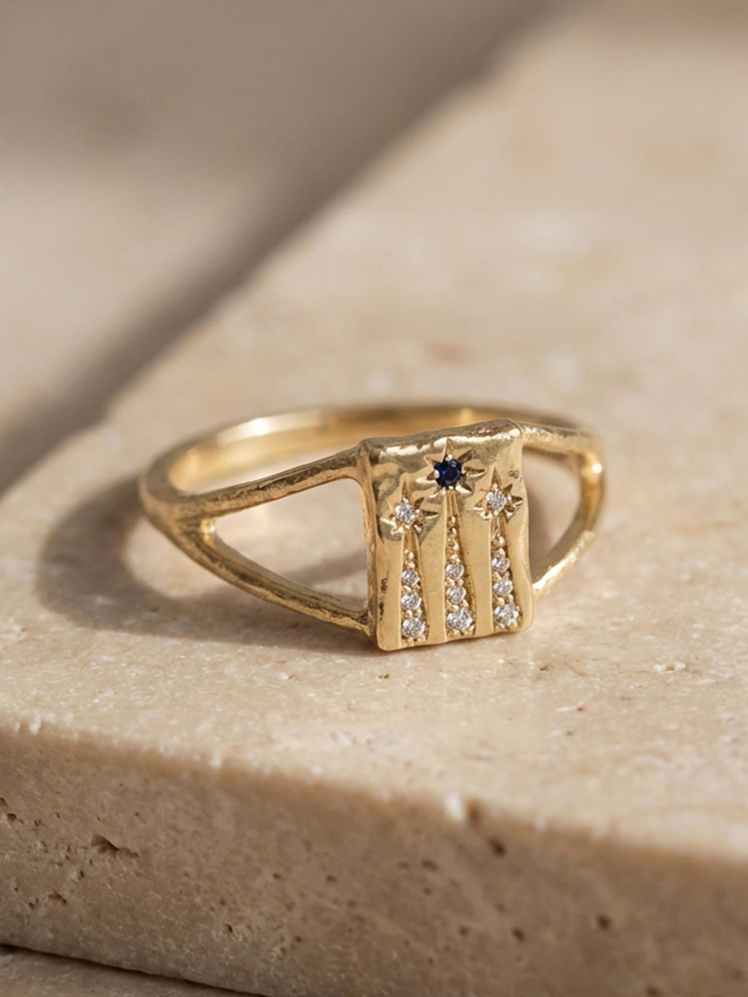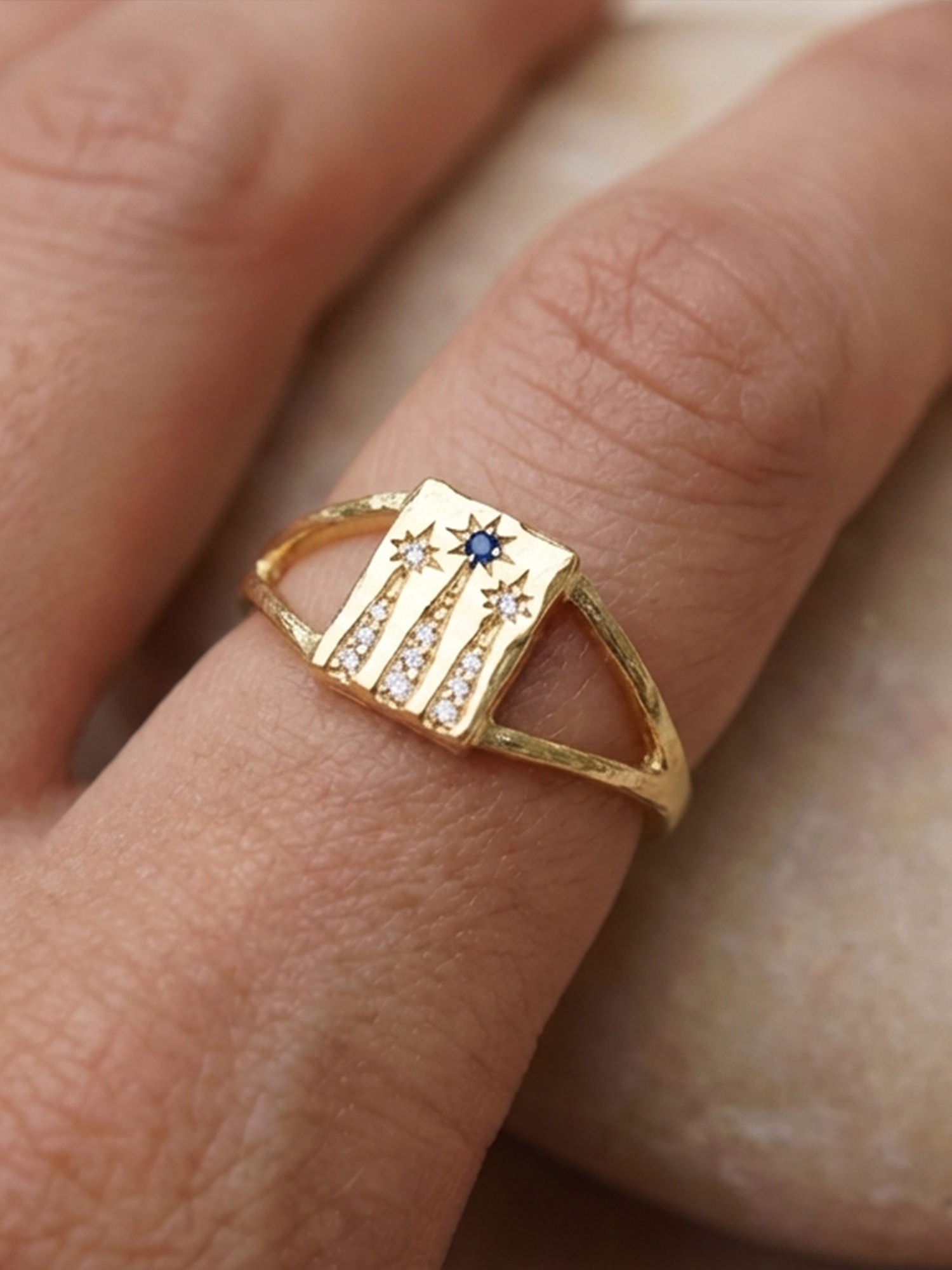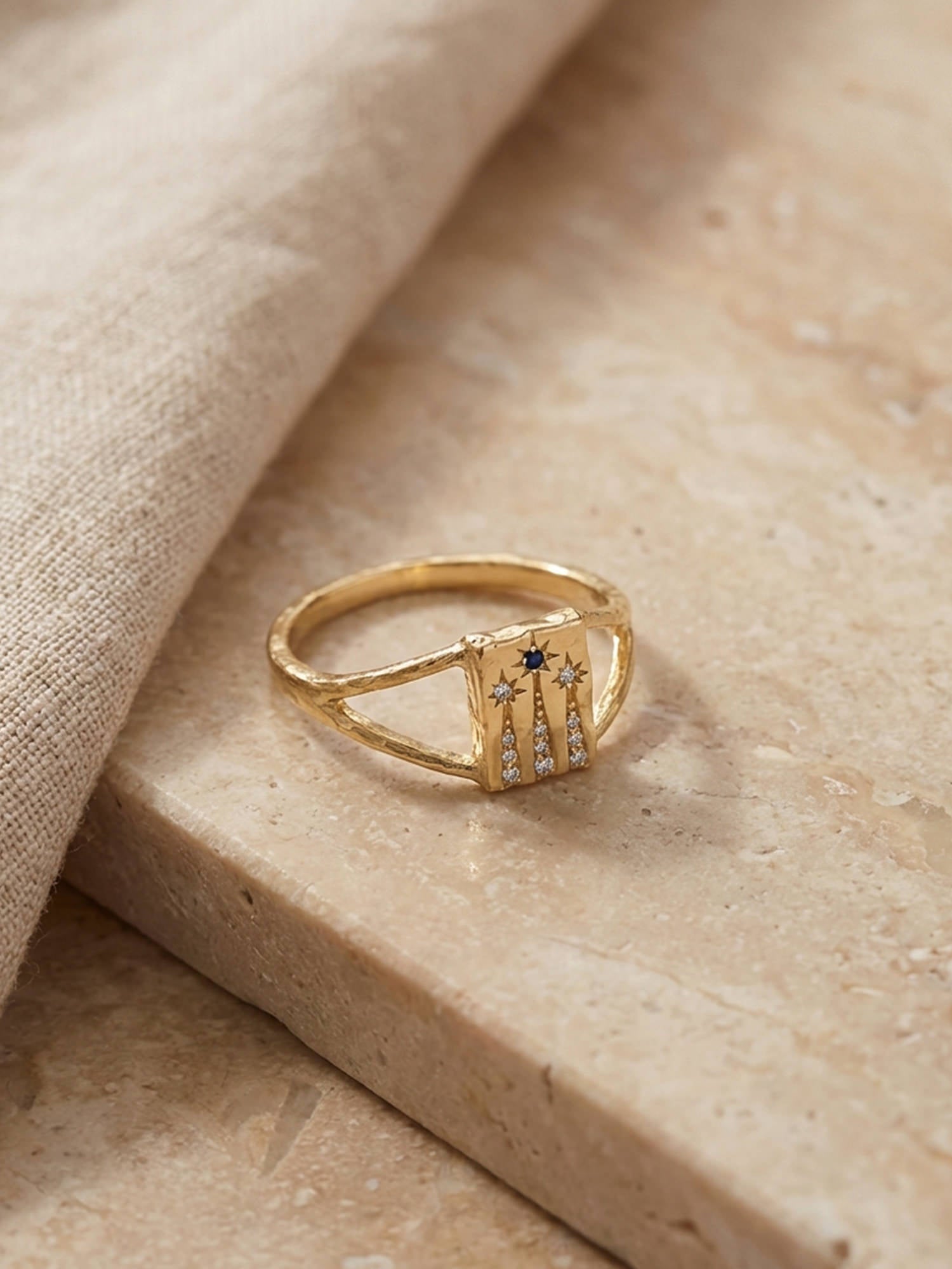 Im Zentrum sitzt ein tiefschwarzer Zirkonia-Stein, der wie ein beleuchtetes Fenster oder ein leuchtender Akzent in der nächtlichen Skyline wirkt. Der warme 18-Karat-Goldglanz verleiht dem Design zusätzlich eine luxuriöse Tiefe und macht den Ring zu einem echten Blickfang.