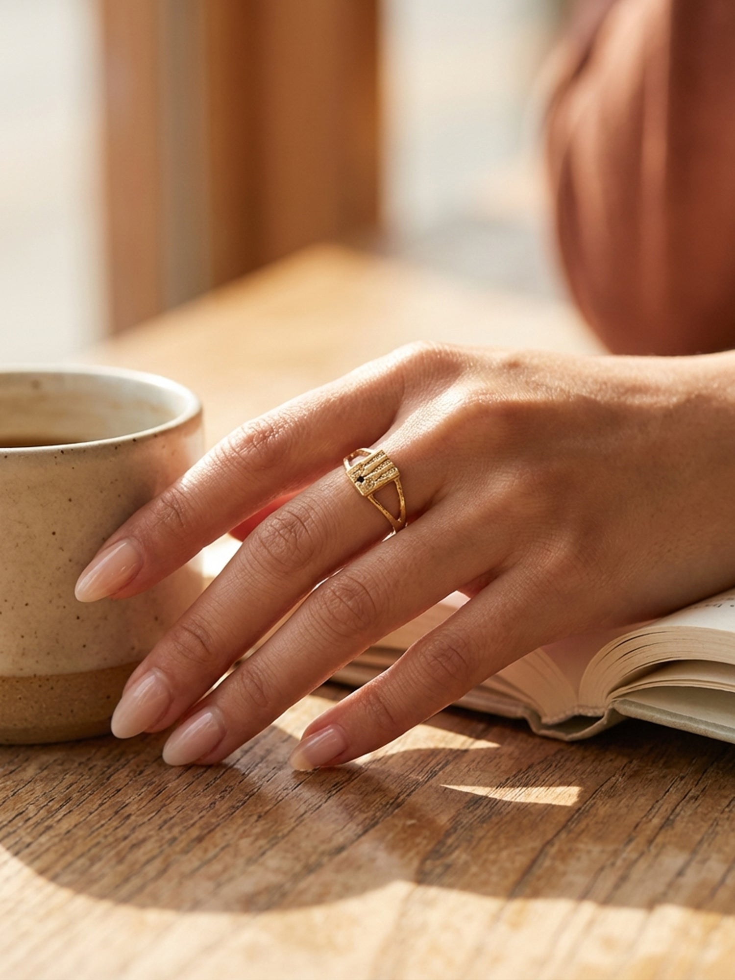 Der Dubai Ring Gold ist ein moderner Statement-Ring, der die Eleganz der ikonischen Skyline Dubais in ein Schmuckstück übersetzt. Die eingravierten Linien erinnern an die klaren Formen der berühmten Tower-Silhouetten, die sich in der Wüstenhitze in den Himmel strecken – kraftvoll, architektonisch und zeitlos.