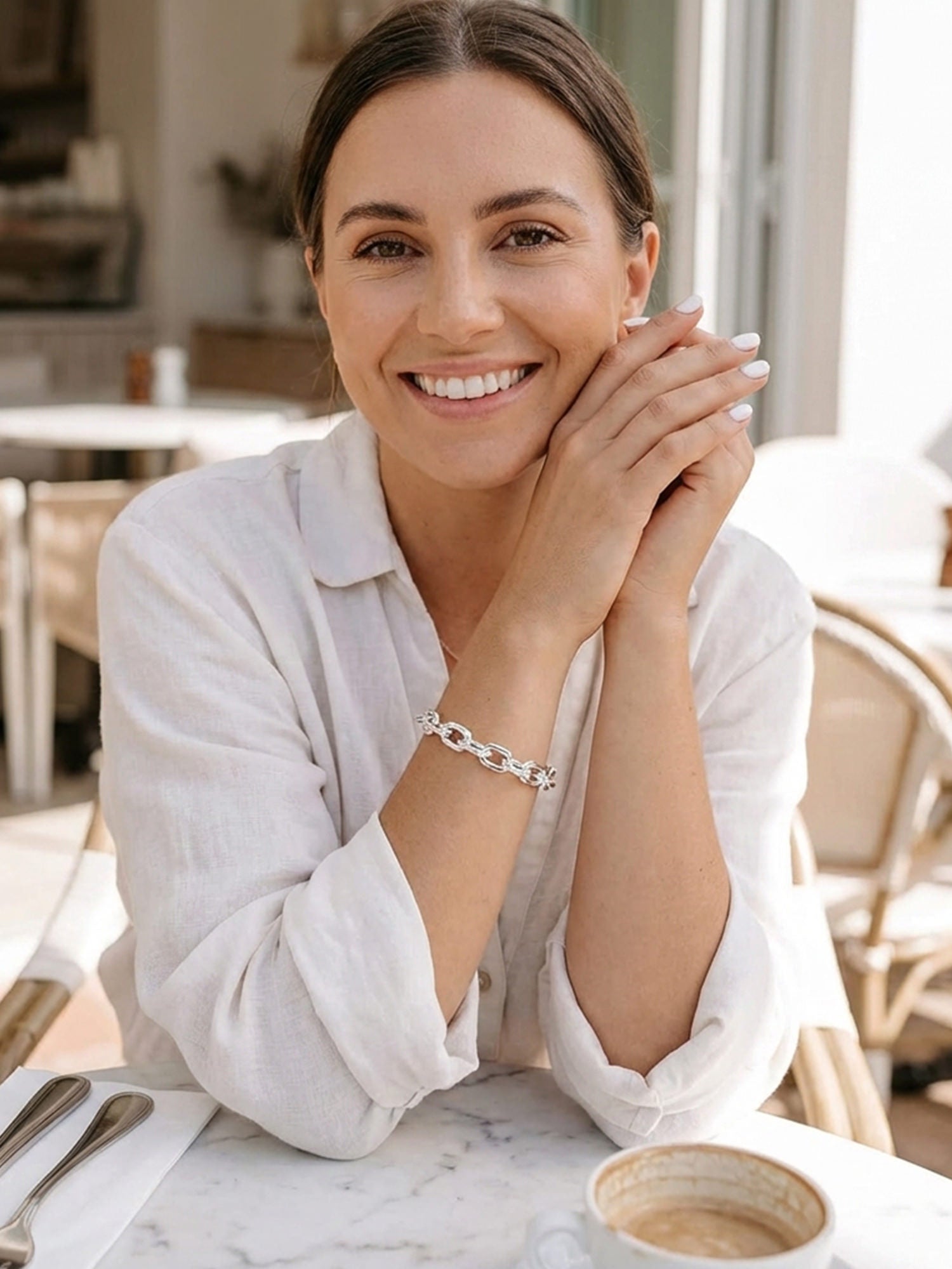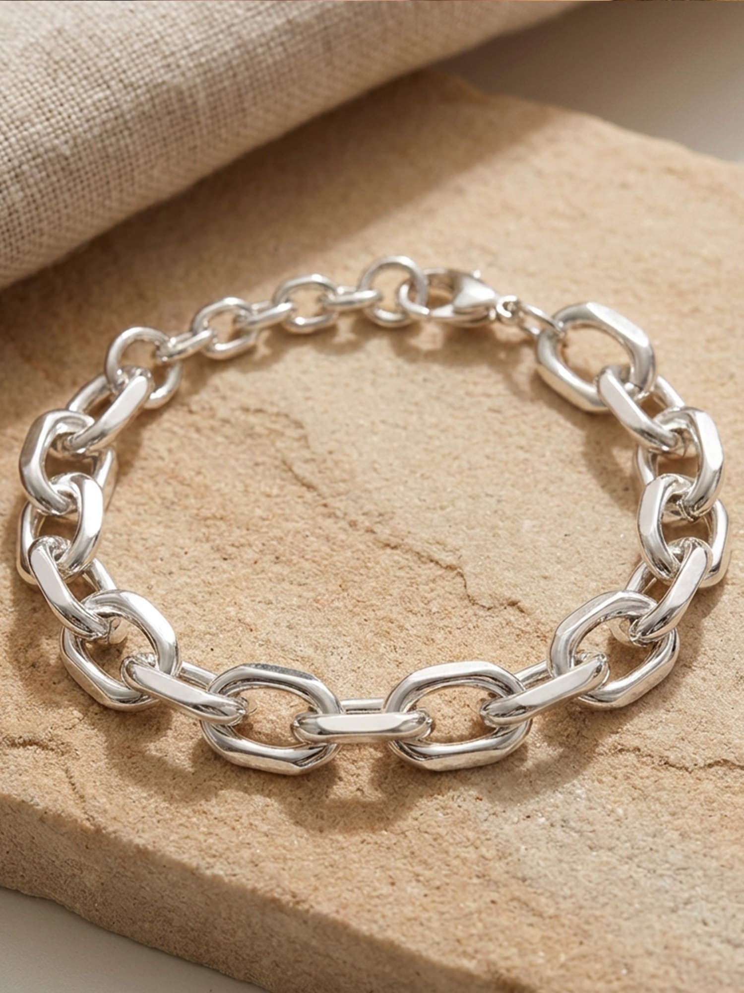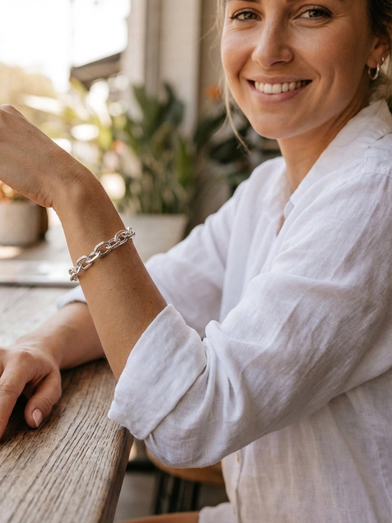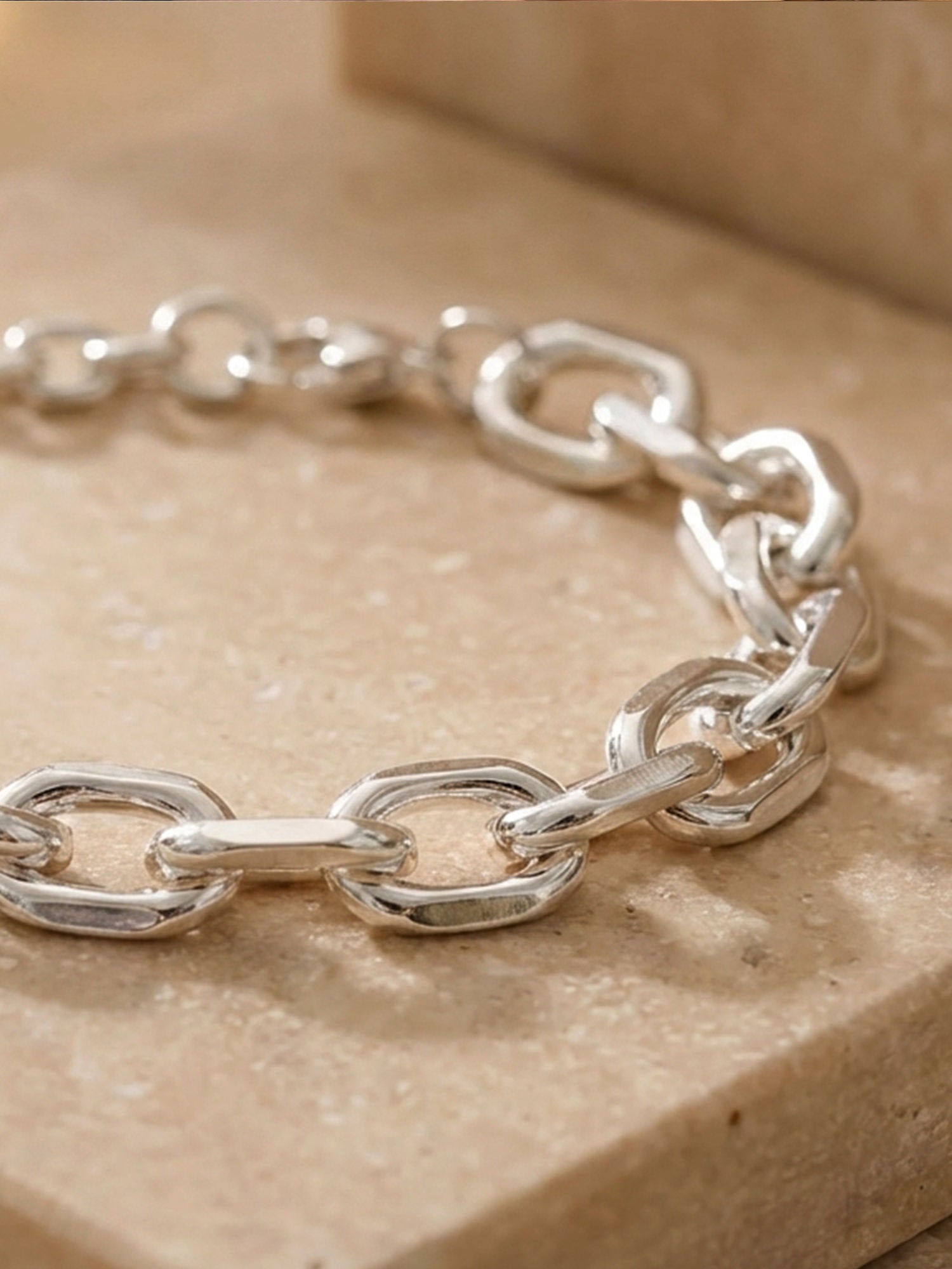 Das Rolo Chain Bracelet Silber ist ein echtes Statement-Piece – bold, modern und mit einem außergewöhnlich klaren Glanz. Durch die hochwertige Versilberung wirkt es besonders hell, shiny und weißgoldähnlich, was ihm diesen edlen, cleanen Look verleiht.