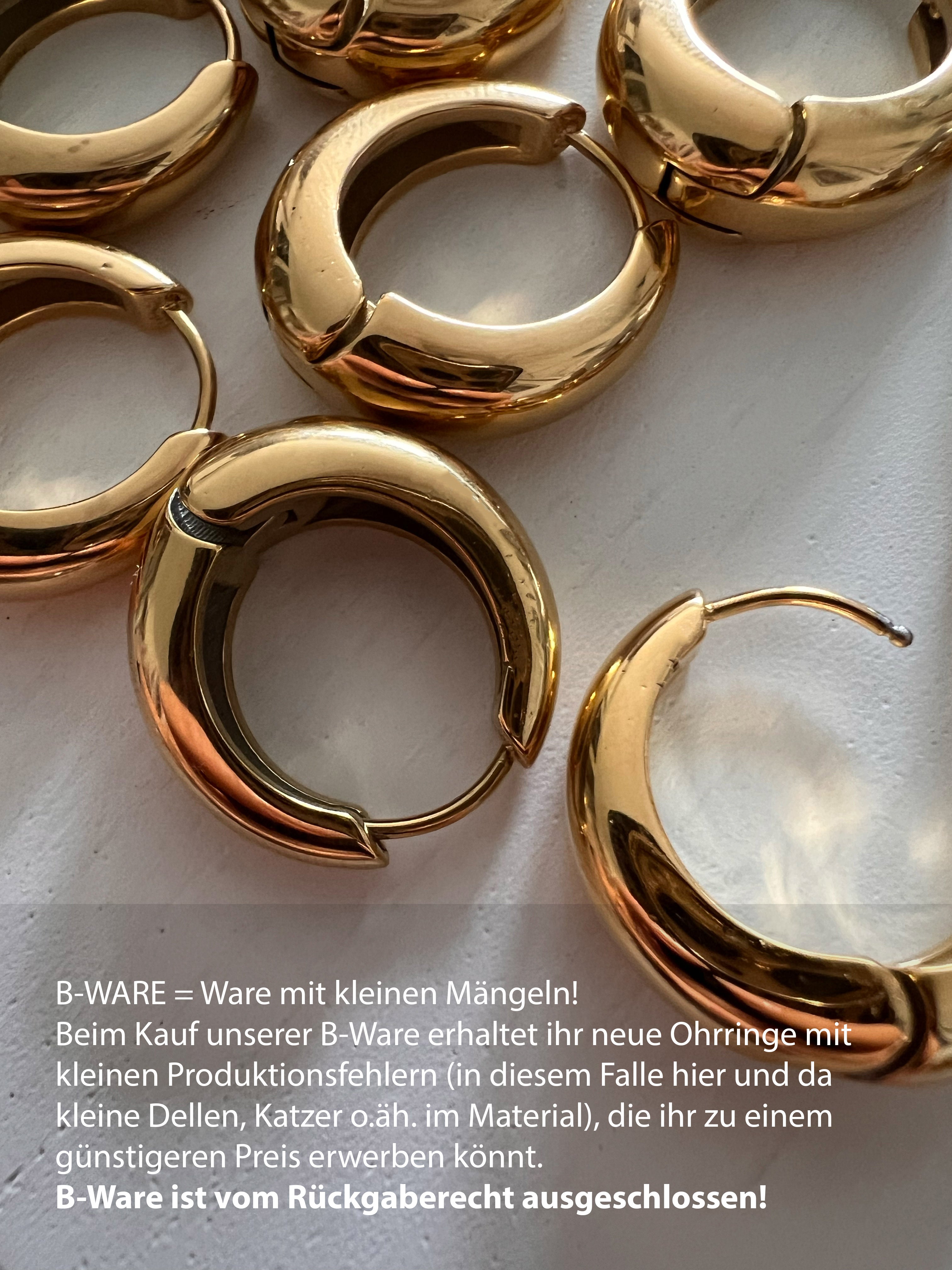 Beim Kauf unserer B-Ware erhaltet ihr neue Ohrringe mit kleinen Produktionsfehlern (in diesem Falle hier und da kleine Dellen, Katzer o.äh. im Material), die ihr zu einem günstigeren Preis erwerben könnt. B-Ware ist vom Umtausch ausgeschlossen. Eine Rückgabe ist nicht möglich.