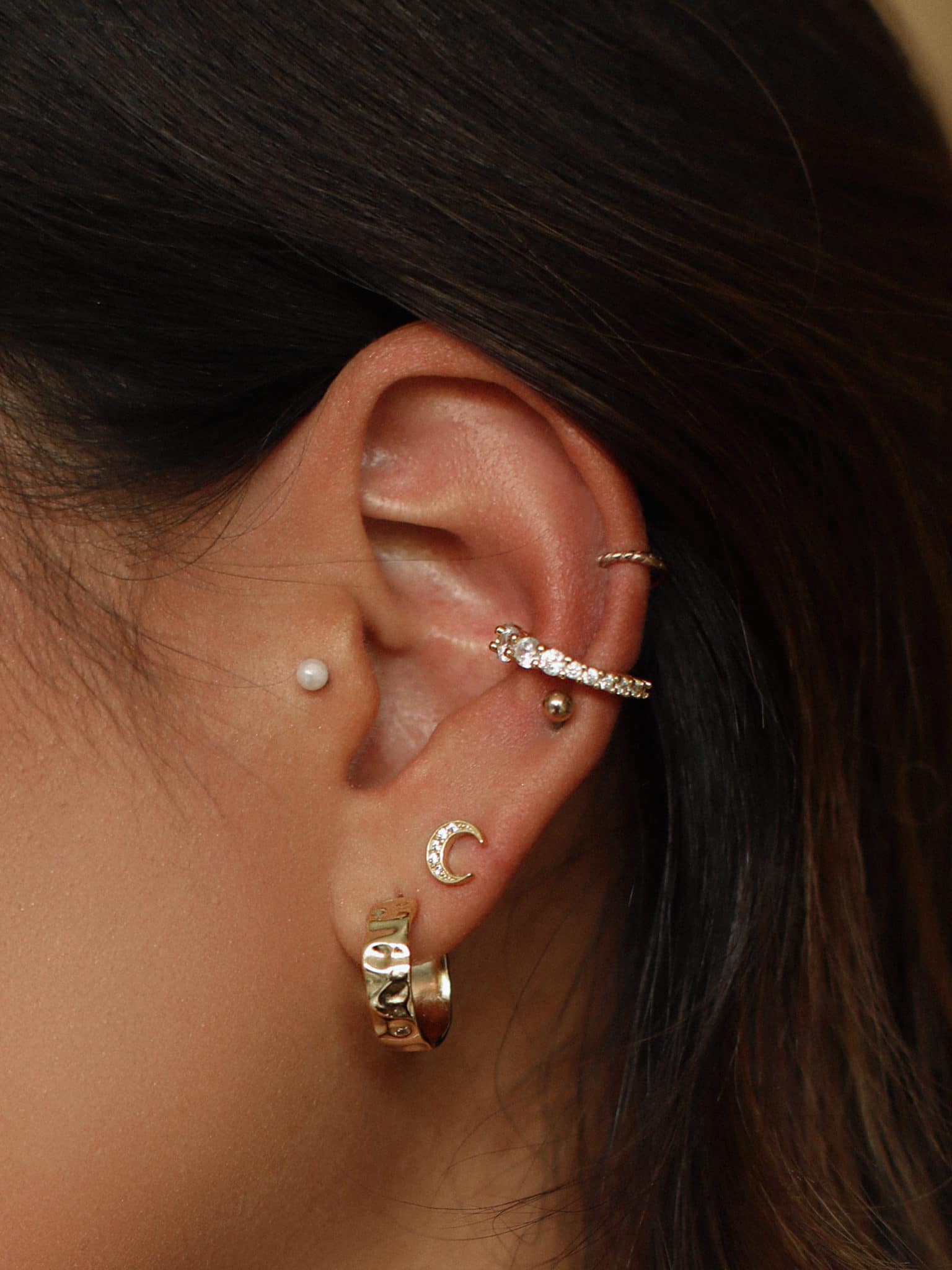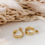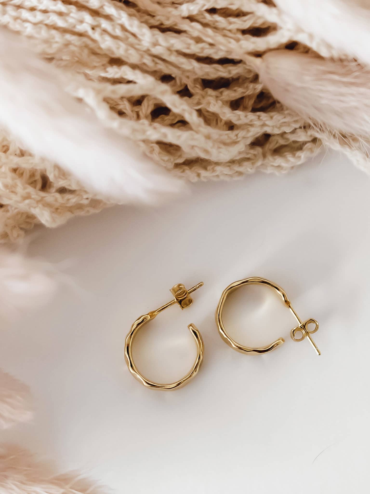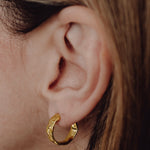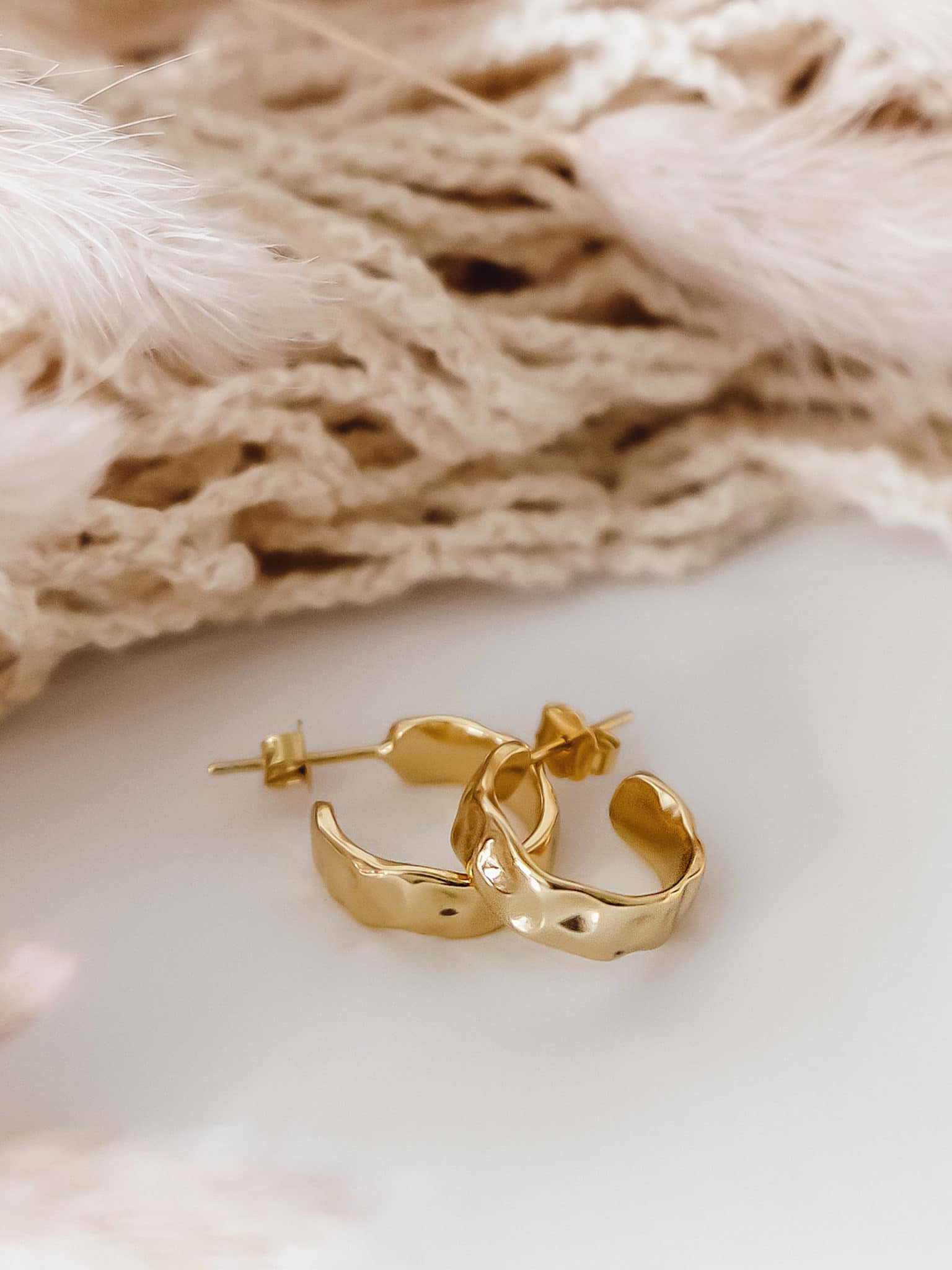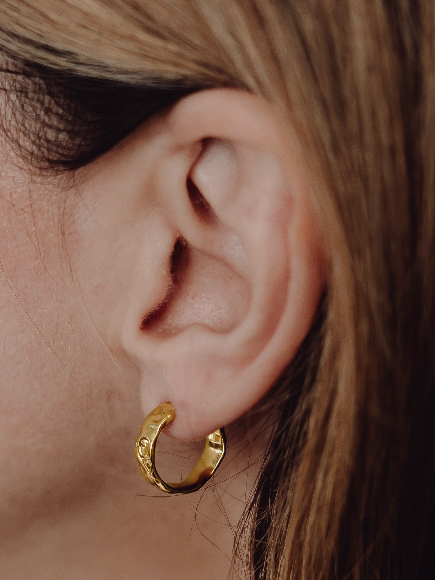 Unsere trendigen Hammered Creolen Small Gold sind die perfekten Allrounder für jedes Outfit! Die etwas breiteren Creolen in C-Form haben ein einzigartiges gehämmertes Design und mit ihren 14 mm Innendurchmesser eine kompakte aber dennoch auffällige Größe für deinen Every-Day-Look. Sie sind aus hochwertigem 925 Sterling Silber gefertigt und mit einer 18 Karat Mehrfachvergoldung versehen. Der sichere Steckerverschluss sorgt dafür, dass du sie den ganzen Tag über bequem tragen kannst. Unsere Creolen sind zudem nickelfrei sowie allergiefreundlich und somit auch für empfindliche Ohren geeignet sind.