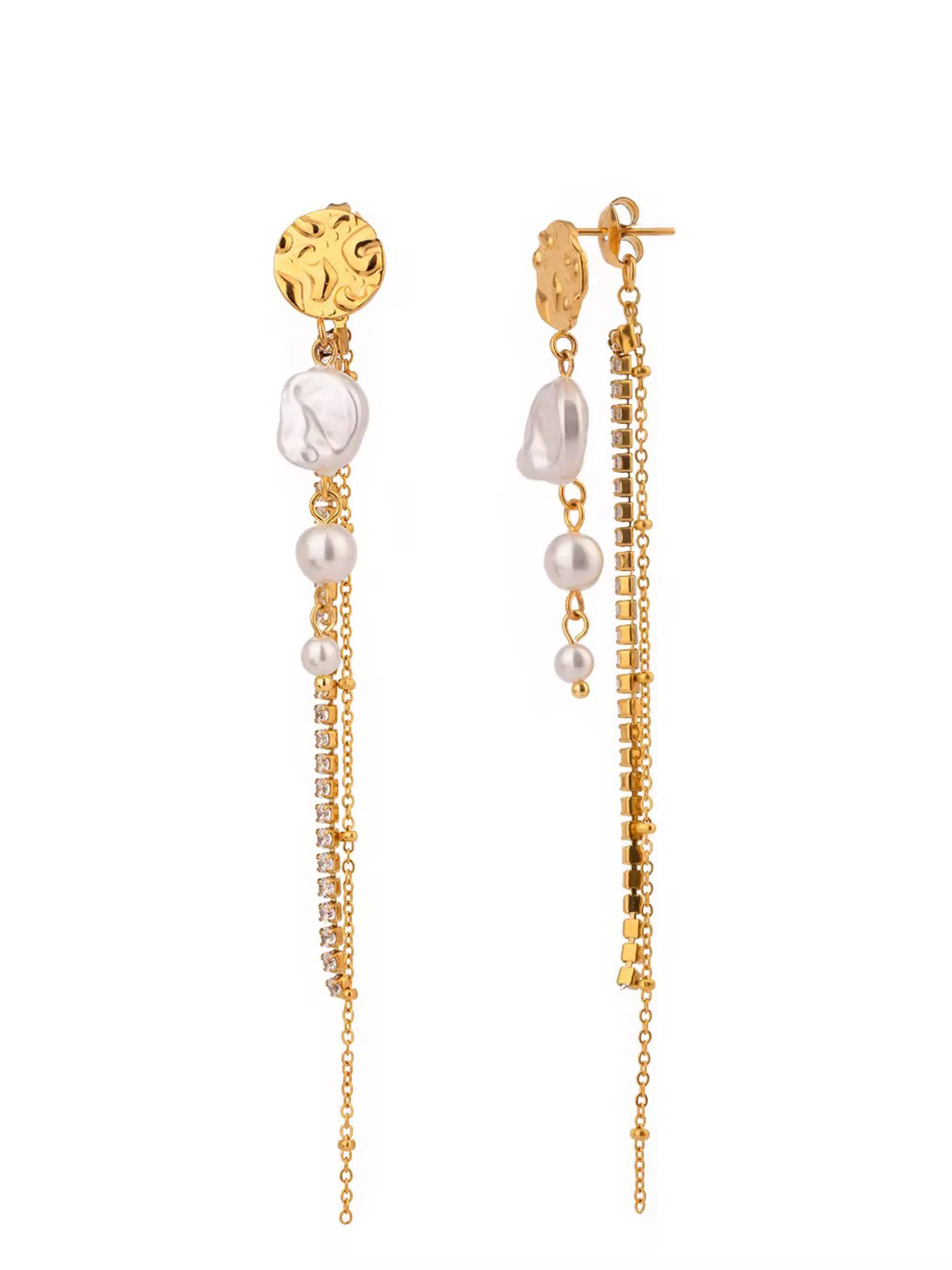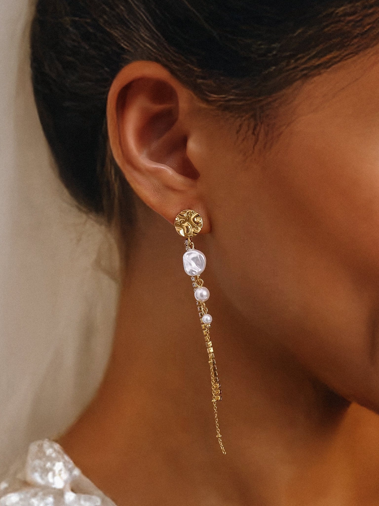 Die Pearl Allure Ohrstecker Gold vereinen zeitlose Eleganz mit moderner Raffinesse. Goldene Strukturen treffen auf fließende Strassstränge und schimmernde Perlen, die bei jeder Bewegung sanft mitschwingen. Ein Design, das Leichtigkeit und Glamour zugleich ausstrahlt – perfekt für die Braut, die an ihrem großen Tag strahlen möchte.