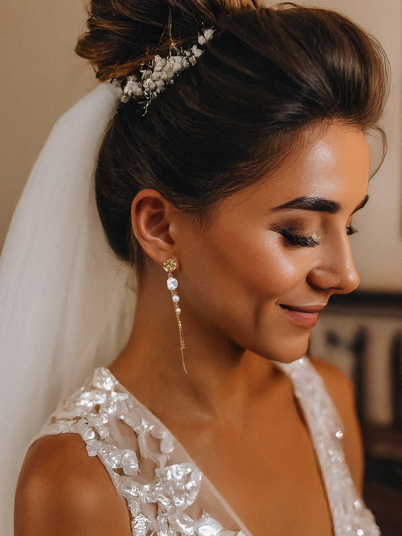 Elegante Ohrstecker mit goldenen Details, funkelnden Strass-Elementen und schimmernden Perlen – für einen unwiderstehlich edlen Brautlook.