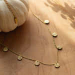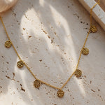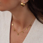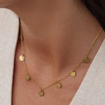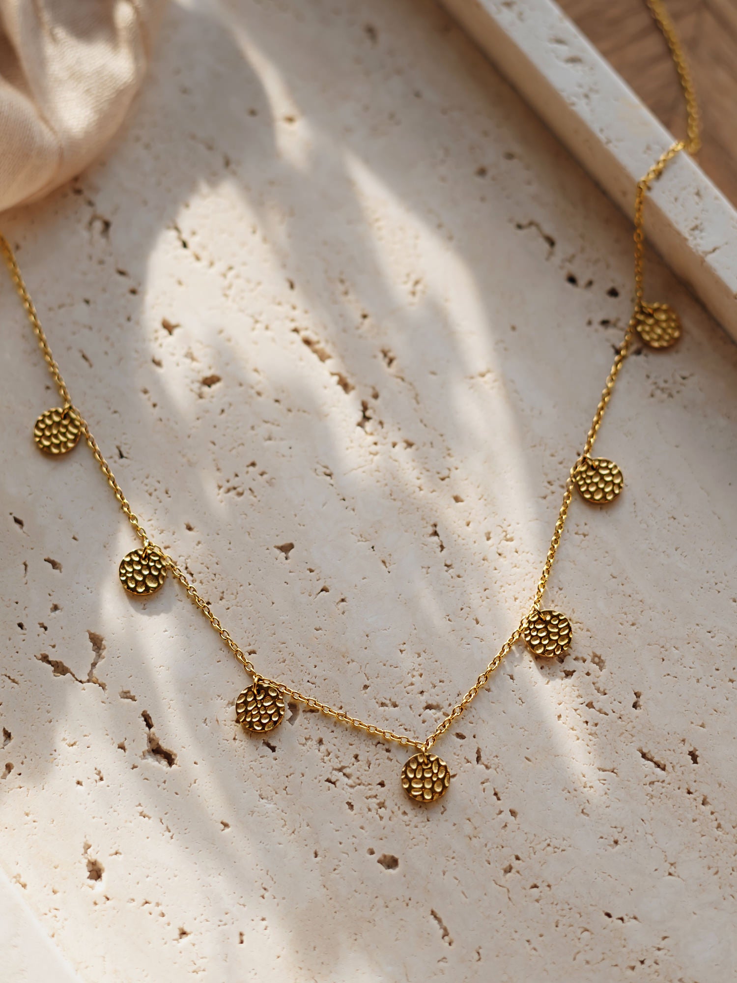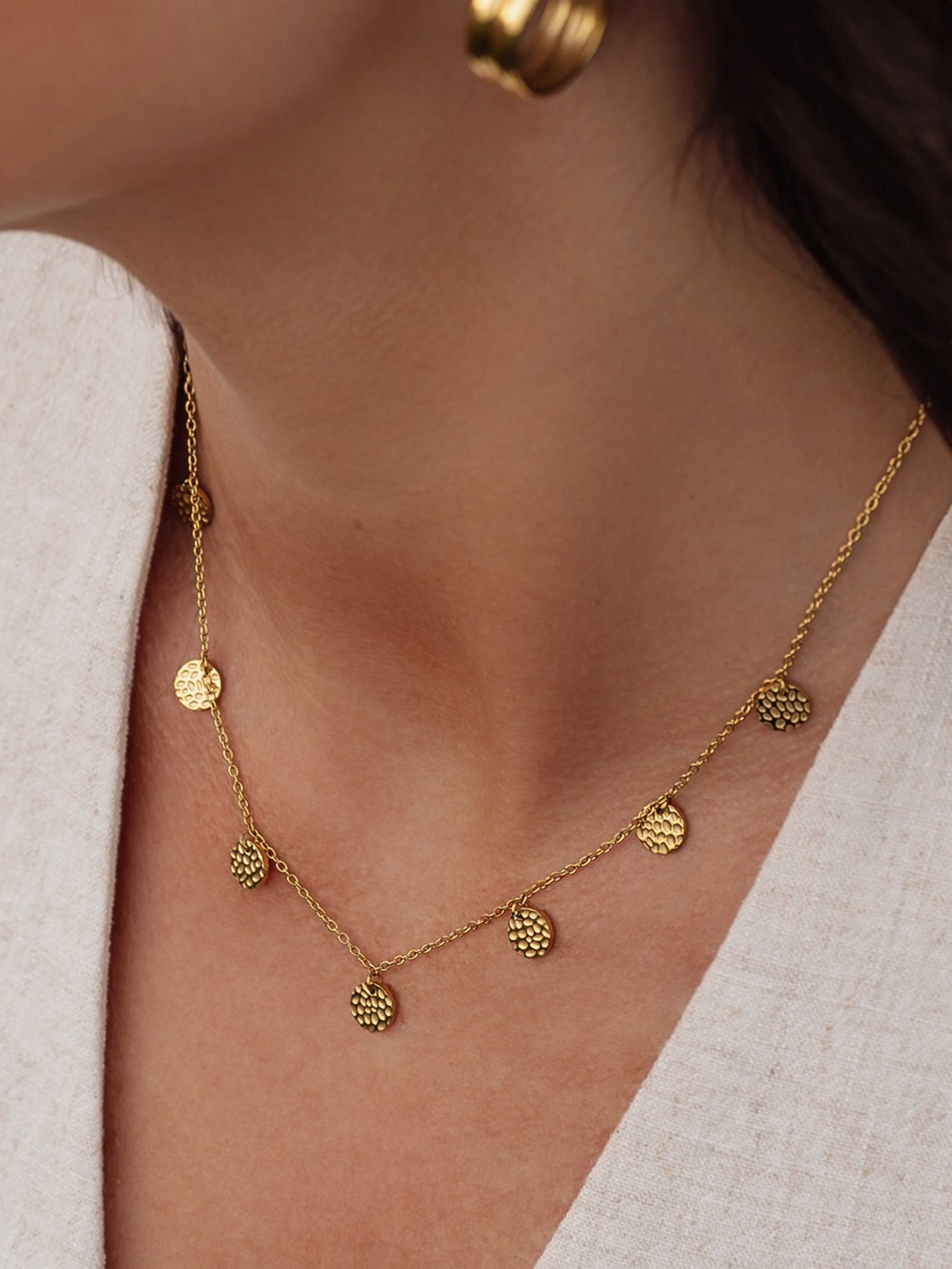 Add the perfect touch to your outfit with our Hammered Coins Necklace Gold. This delicate link chain made of 18-karat gold-plated stainless steel is adorned with several hammered coin pendants and is adjustable in length from 40 to 45 cm. Our Hammered Coins Necklace Gold is nickel-free, allergy-friendly, and therefore suitable for sensitive skin.