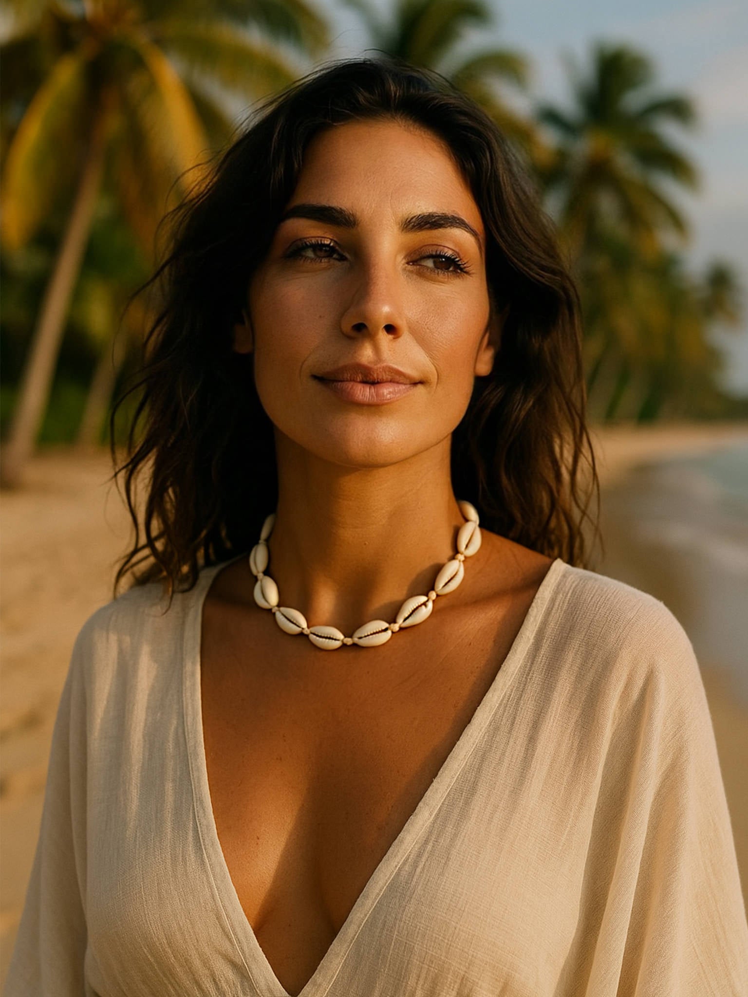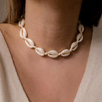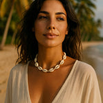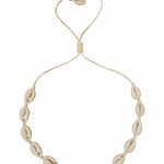 Our Cowrie Necklace Choker is the perfect addition to your summer look. It features genuine cowrie shells arranged on a beautiful cotton cord with a handy pull clasp.