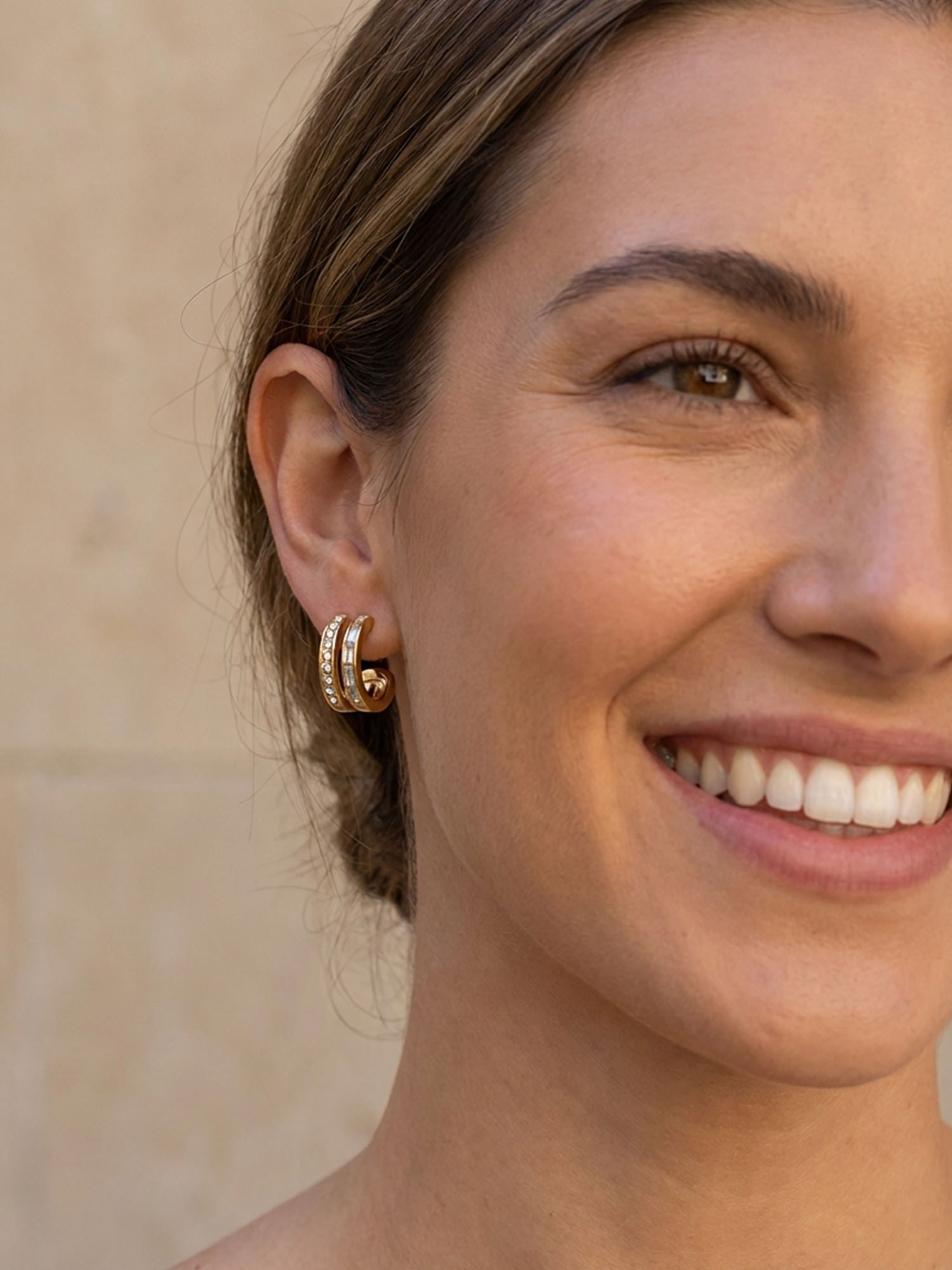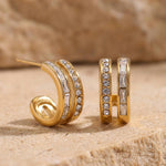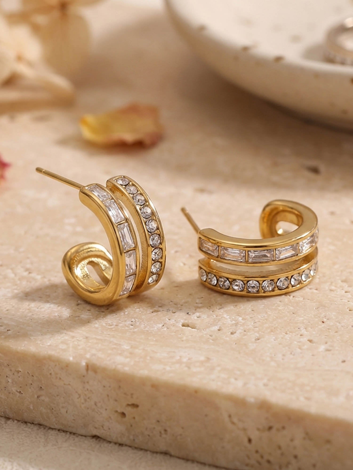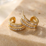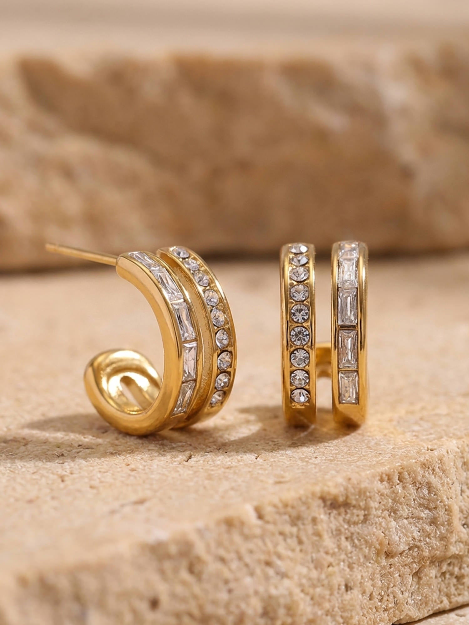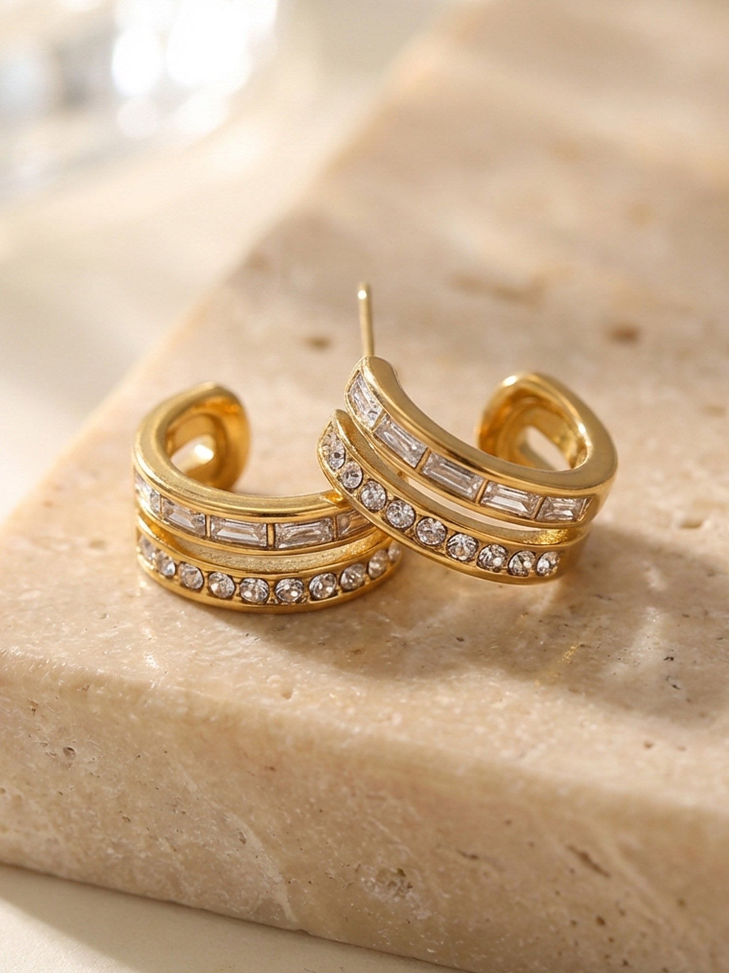 Moderne Creolen mit funkelnden Zirkonia- und Baguette-Steinen. Aus 18 Karat vergoldetem Edelstahl – wasserfest, hypoallergen und perfekt für jeden Tag.