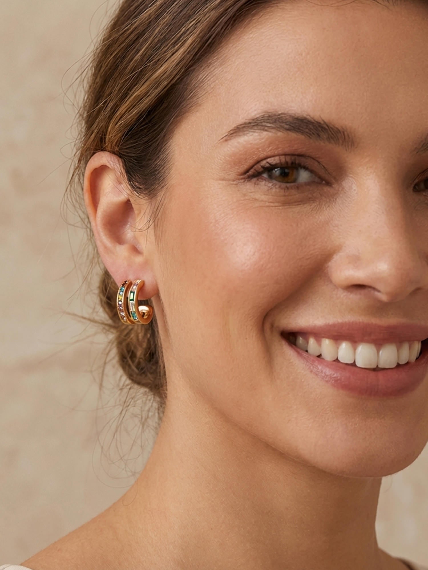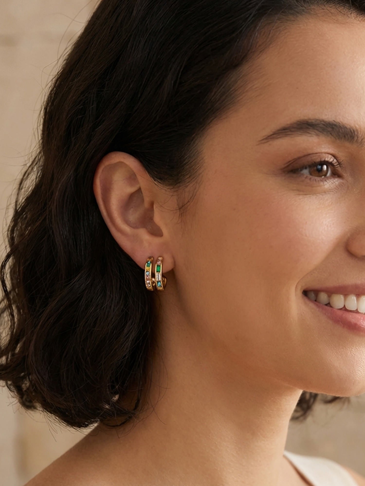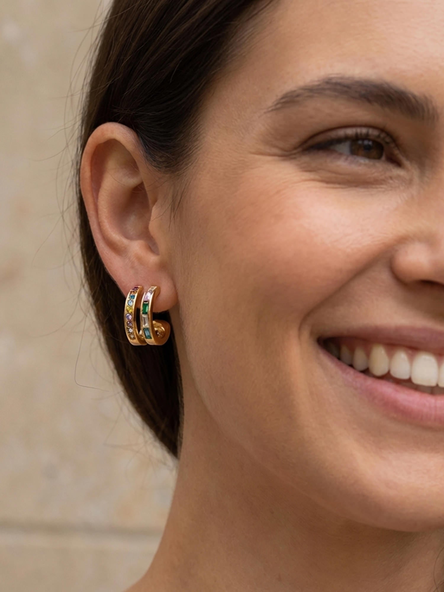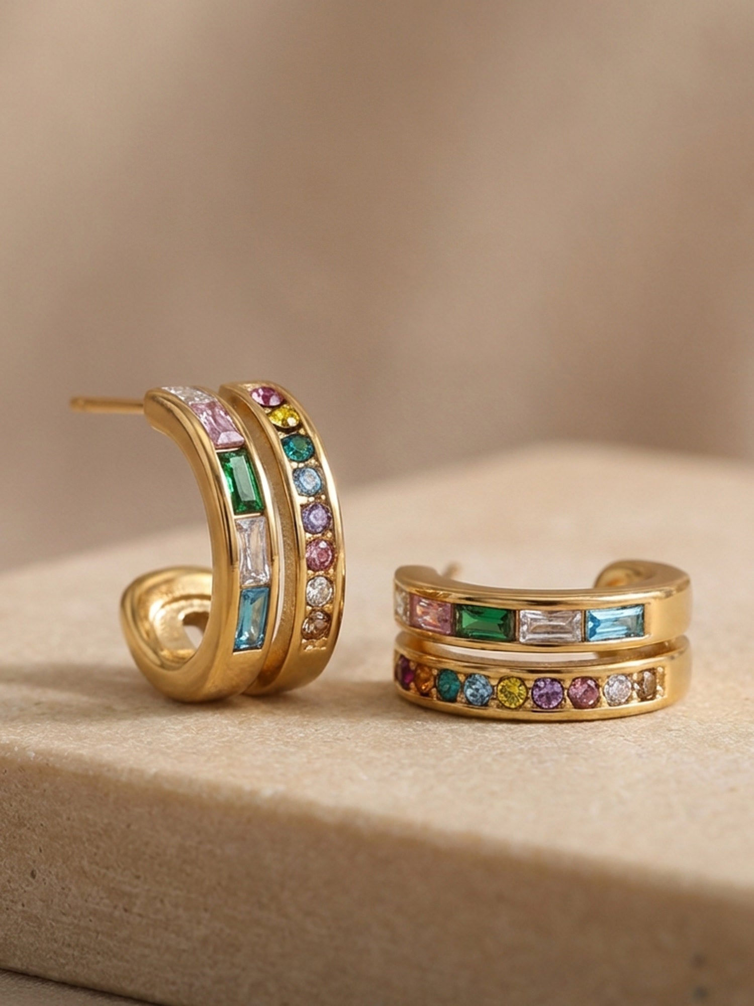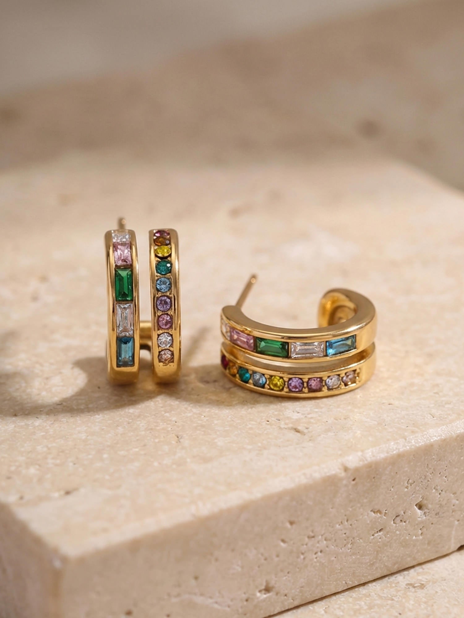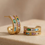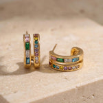 Moderne Creolen mit mehrfarbigen Zirkonia-Steinen aus 18 Karat vergoldetem Edelstahl – ein subtiler Farbakzent mit Glam-Faktor.