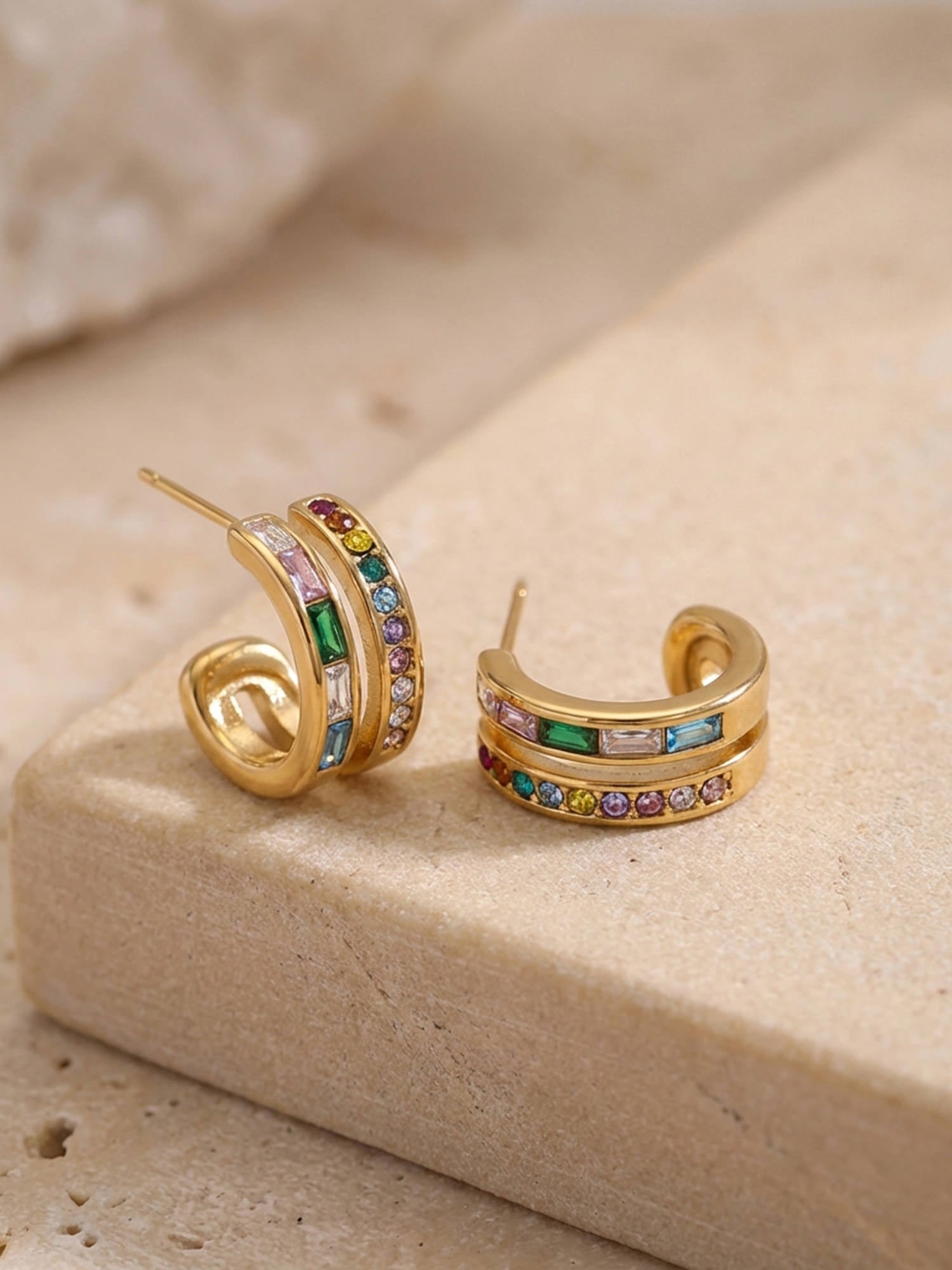 • eye-catching hoop earrings with colorful zirconia and baguette stars