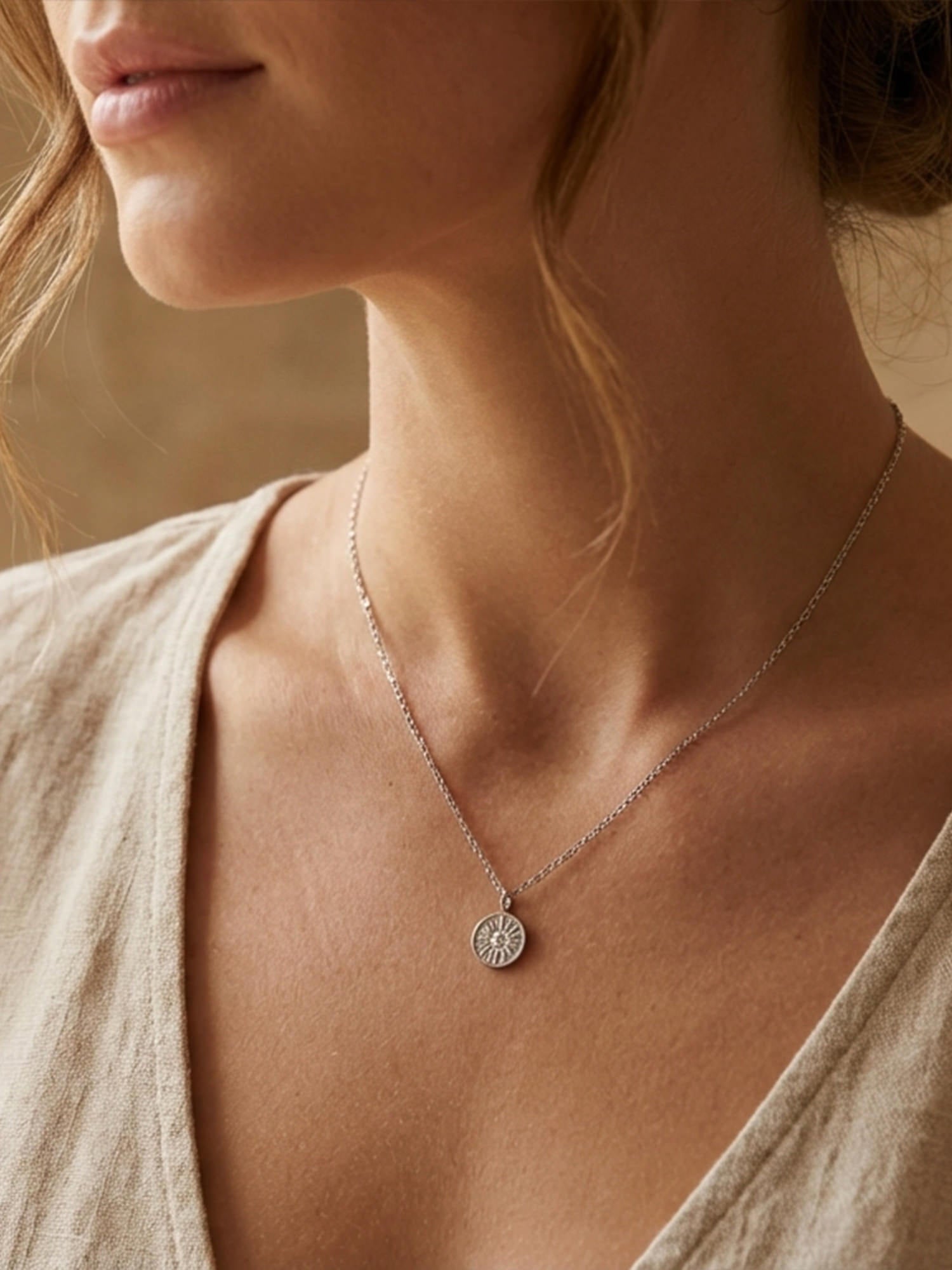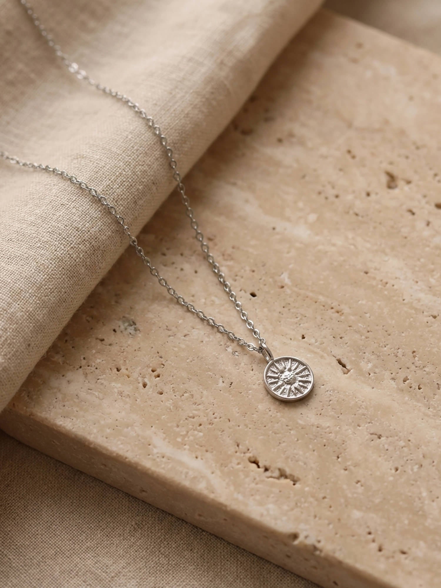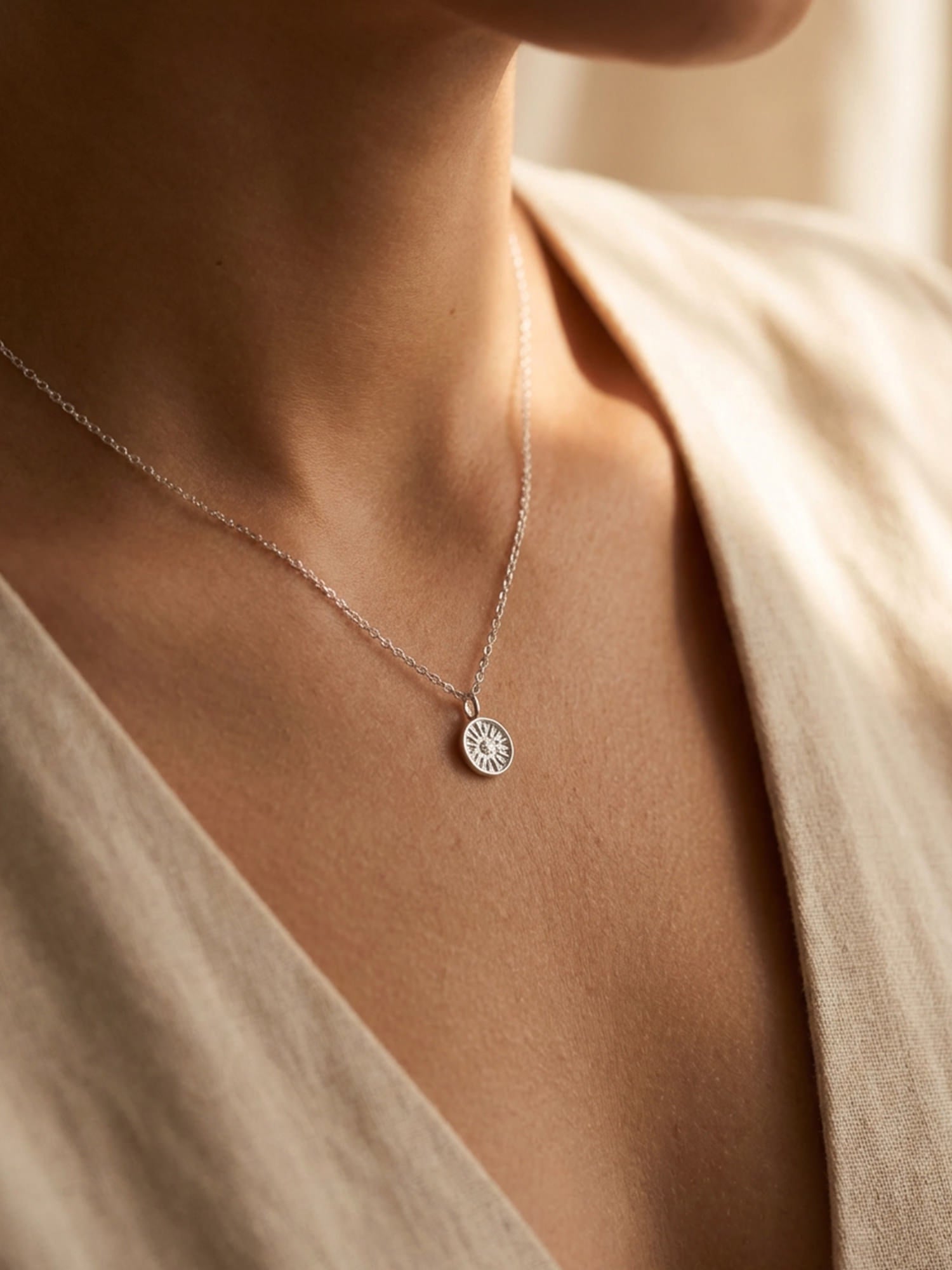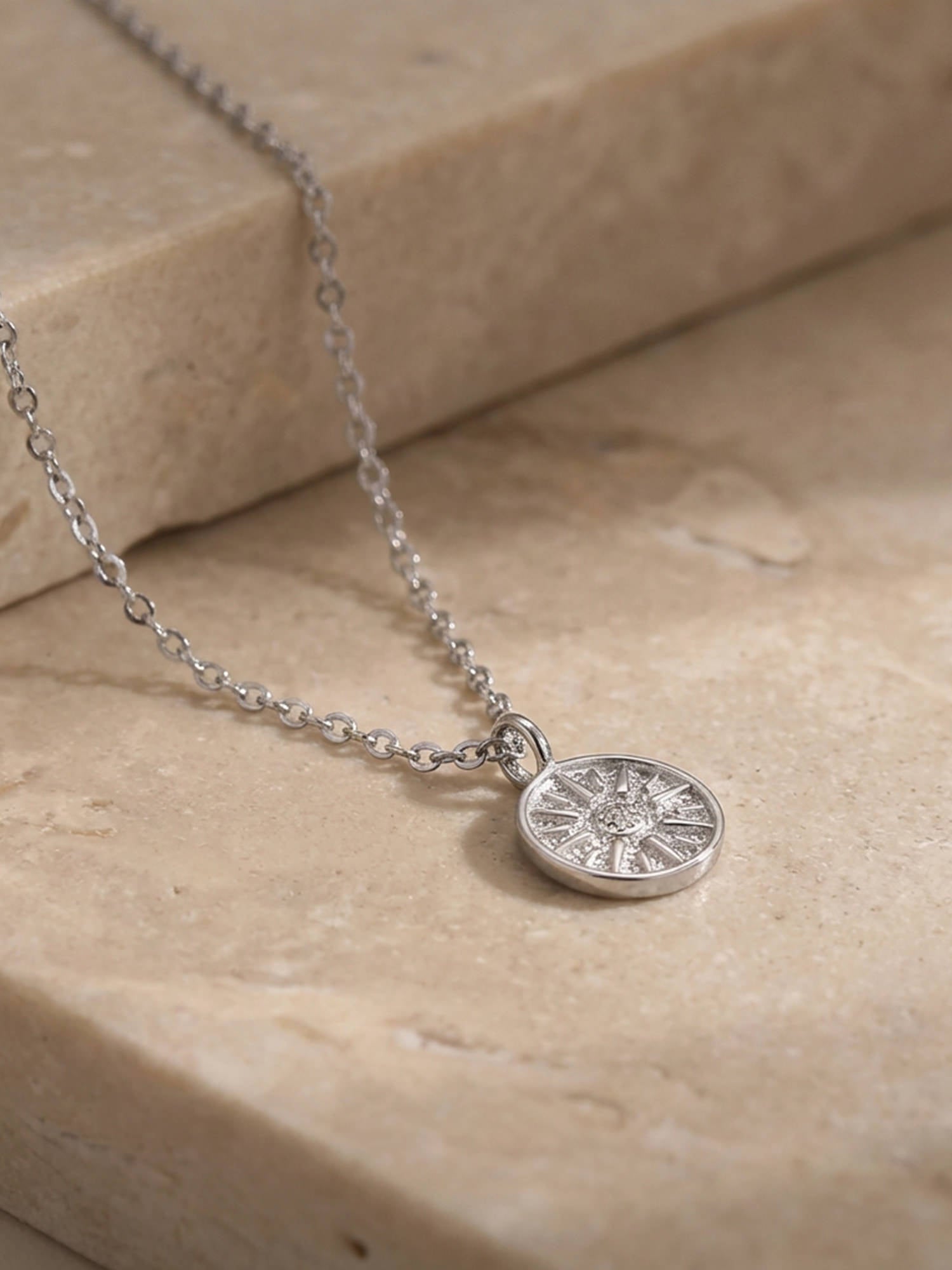 Zarte 925-Sterling-Silberkette mit feinem gehämmerten Sonnenanhänger – modern, clean & perfekt für den Alltag.