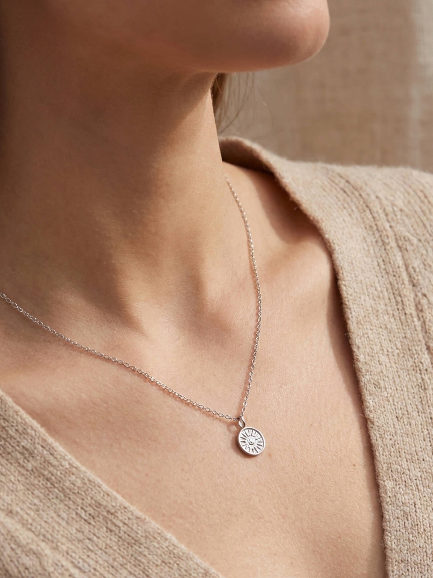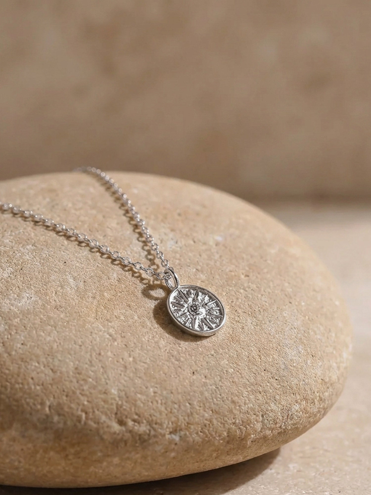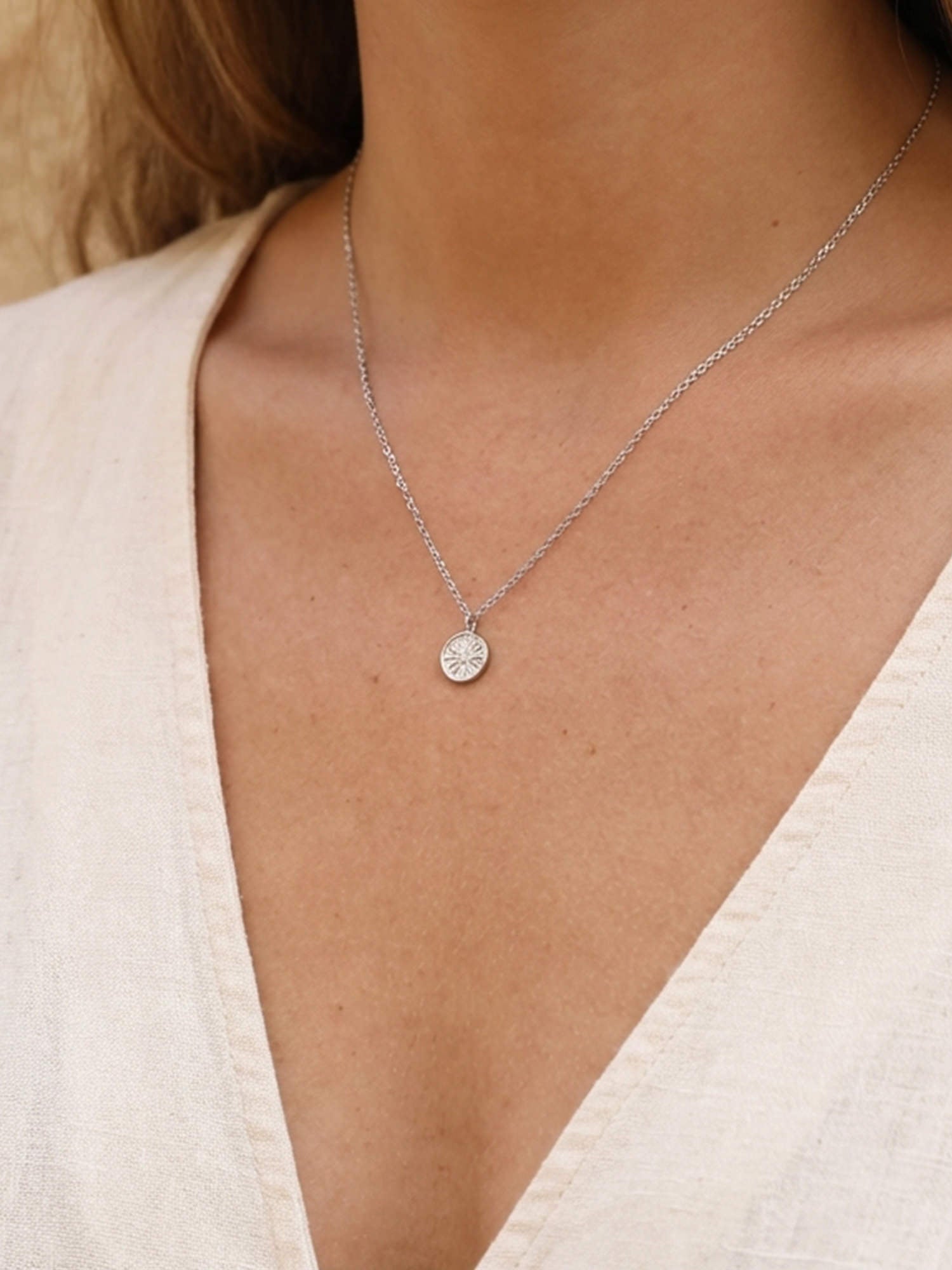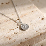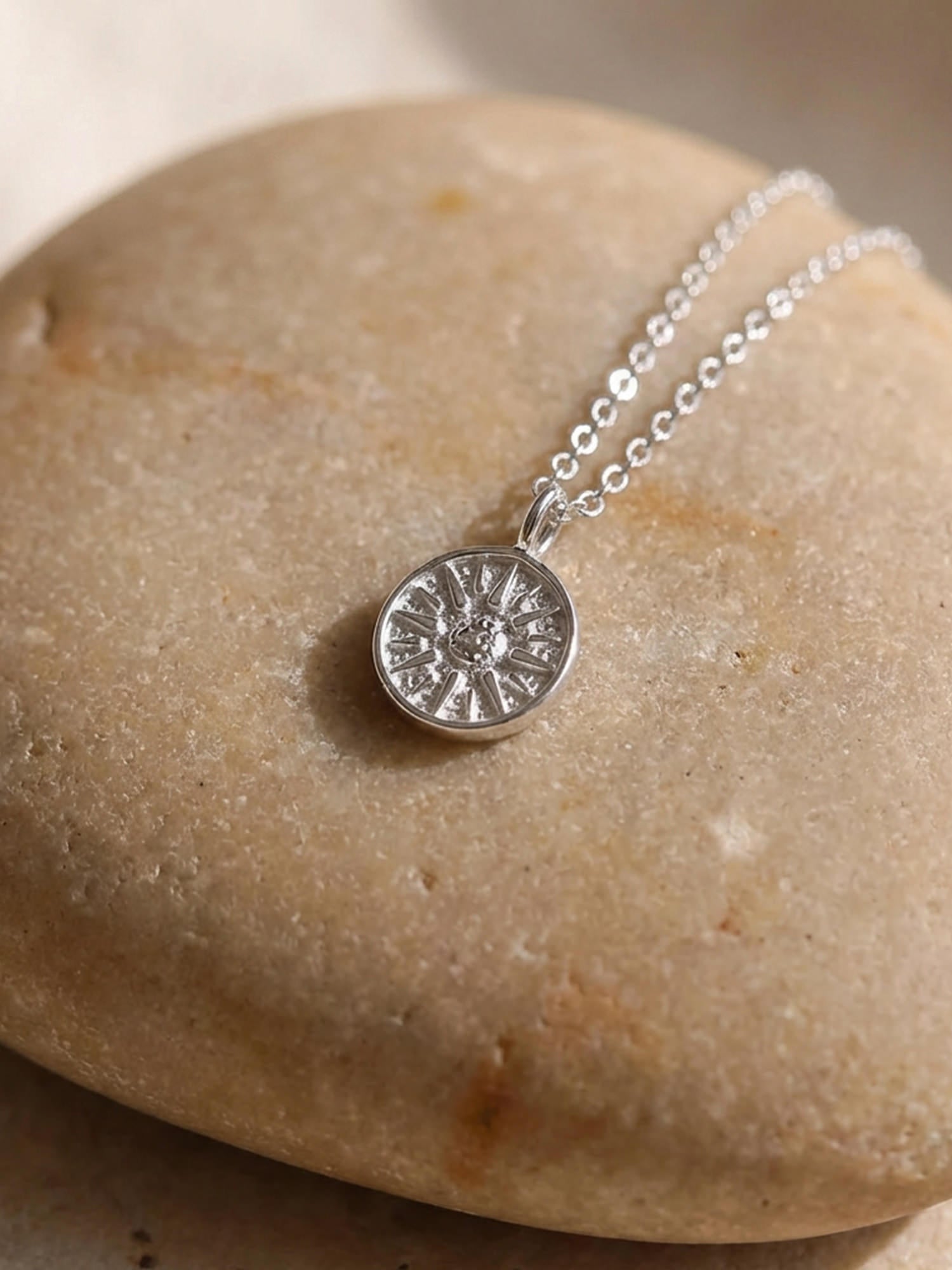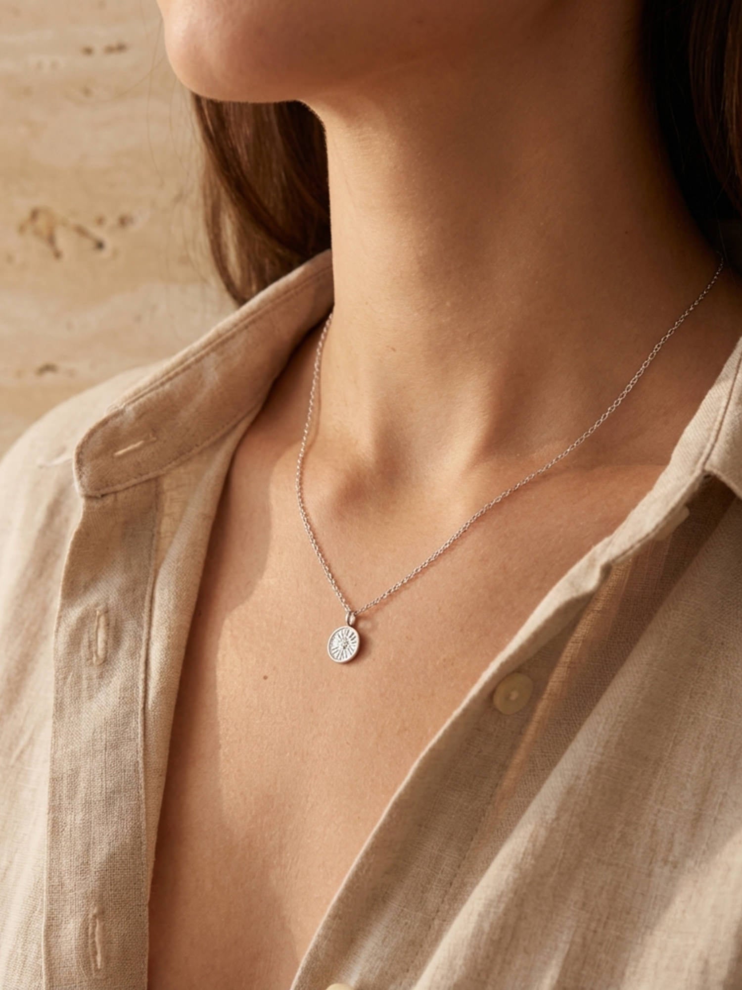 Zarte 925-Sterling-Silberkette mit feinem gehämmerten Sonnenanhänger – modern, clean & perfekt für den Alltag.