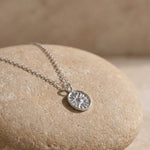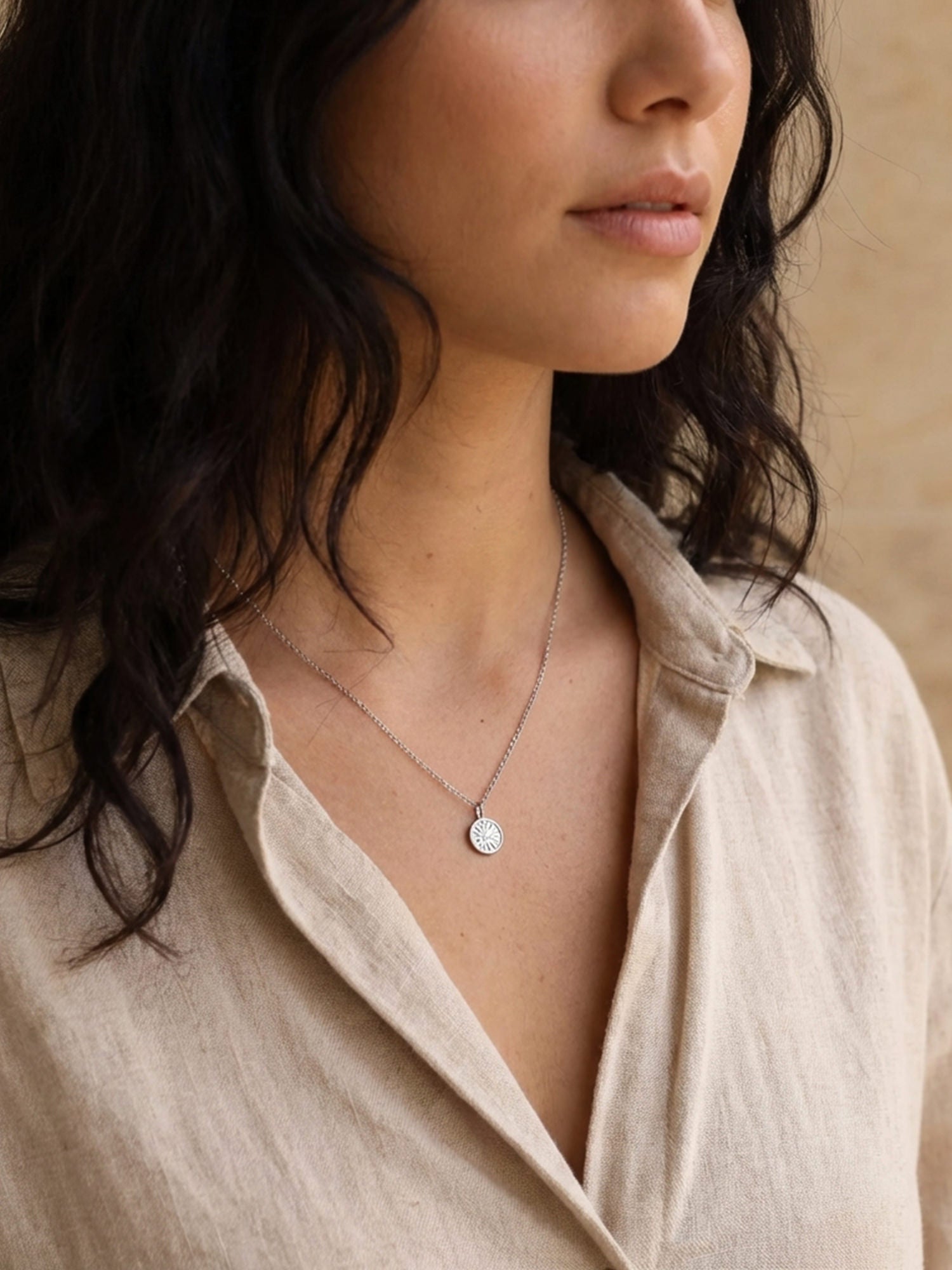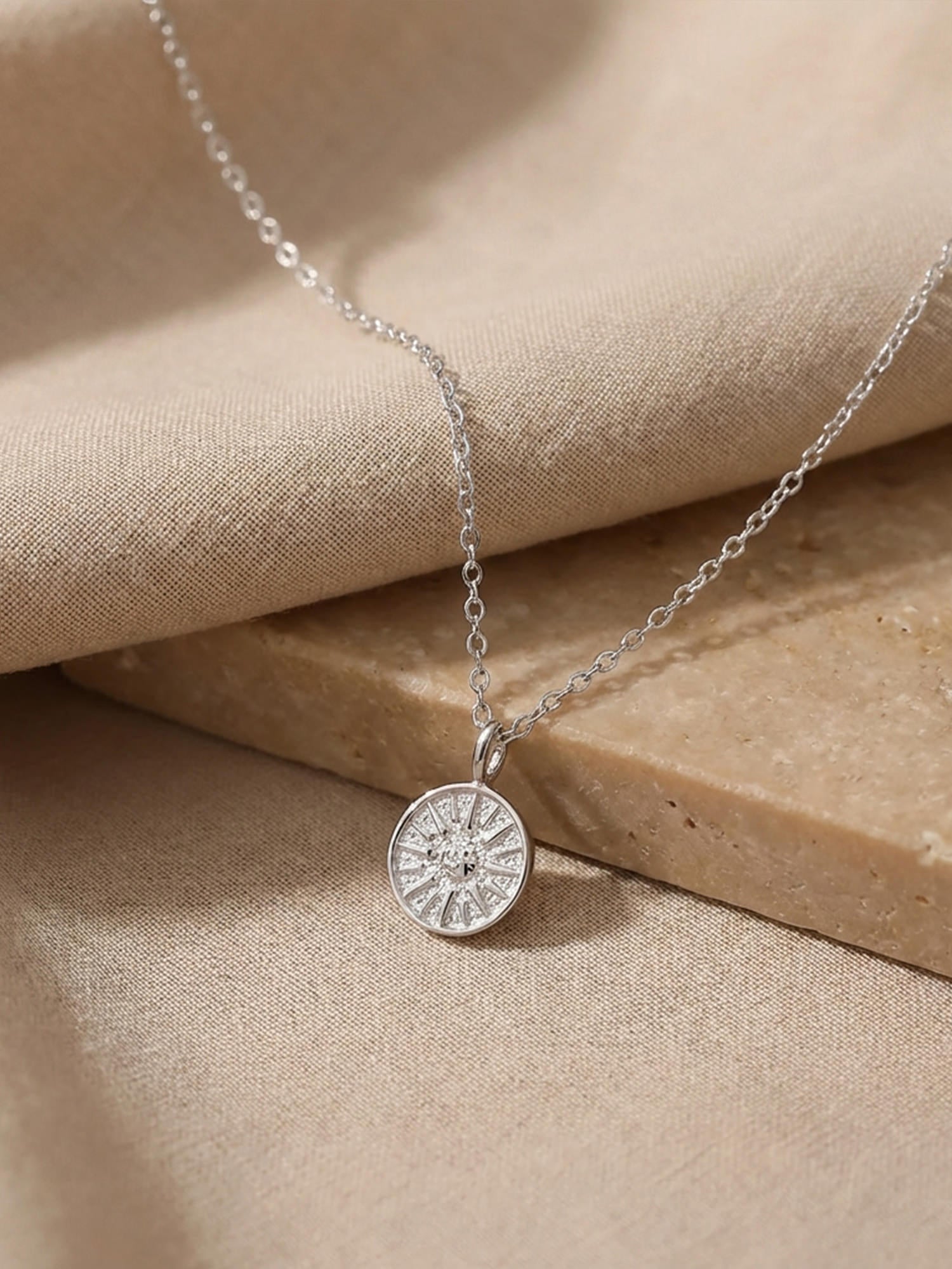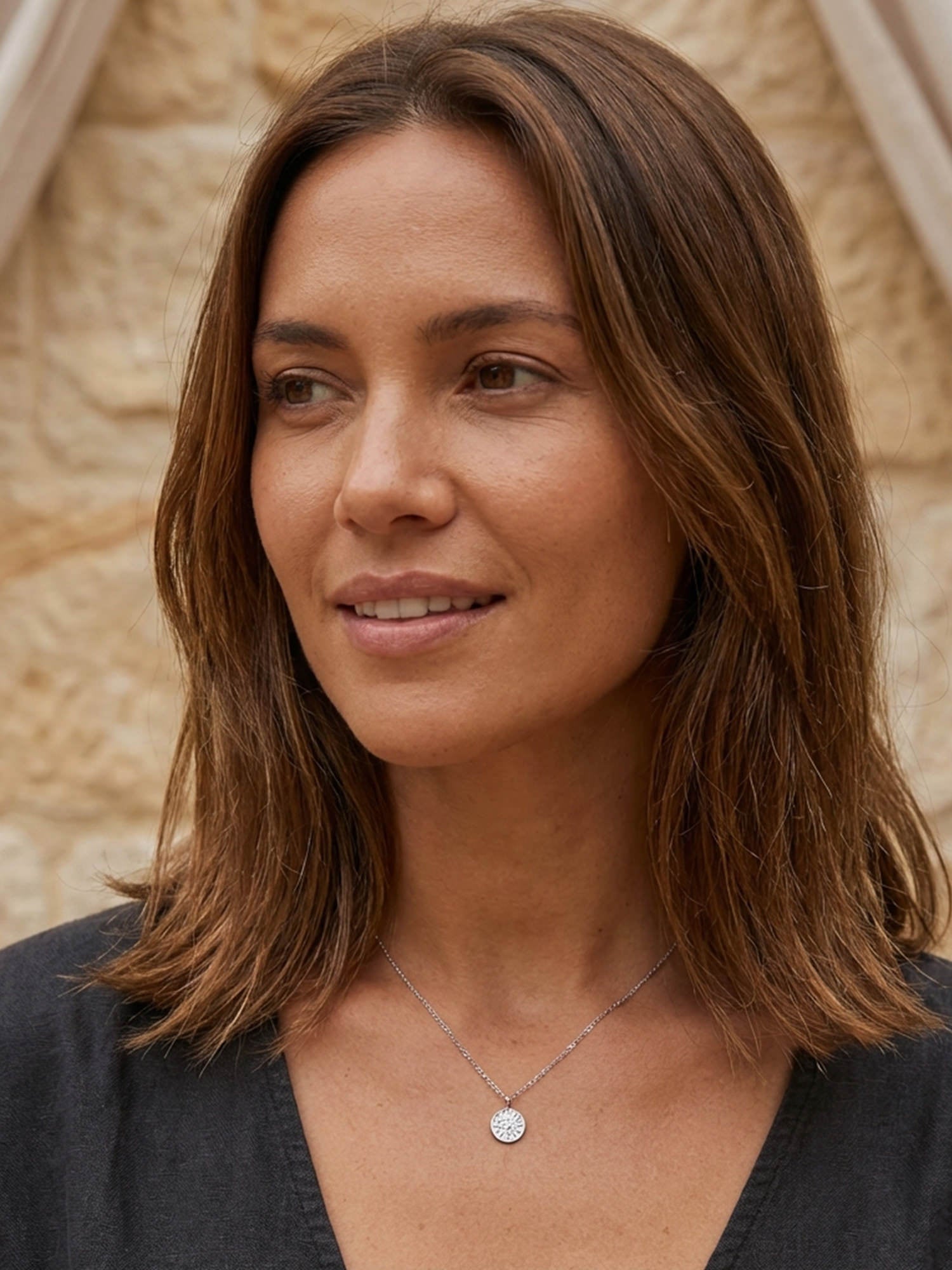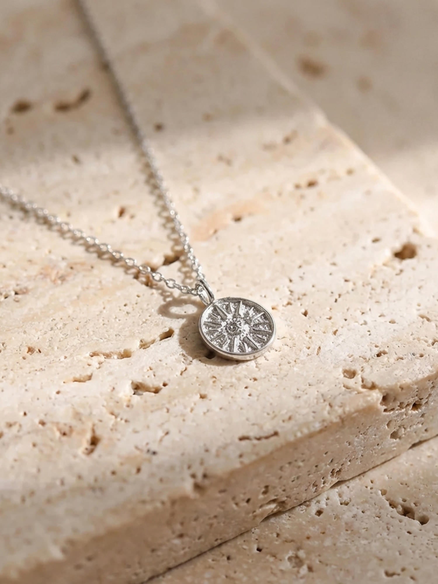 Zarte 925-Sterling-Silberkette mit feinem gehämmerten Sonnenanhänger – modern, clean & perfekt für den Alltag.