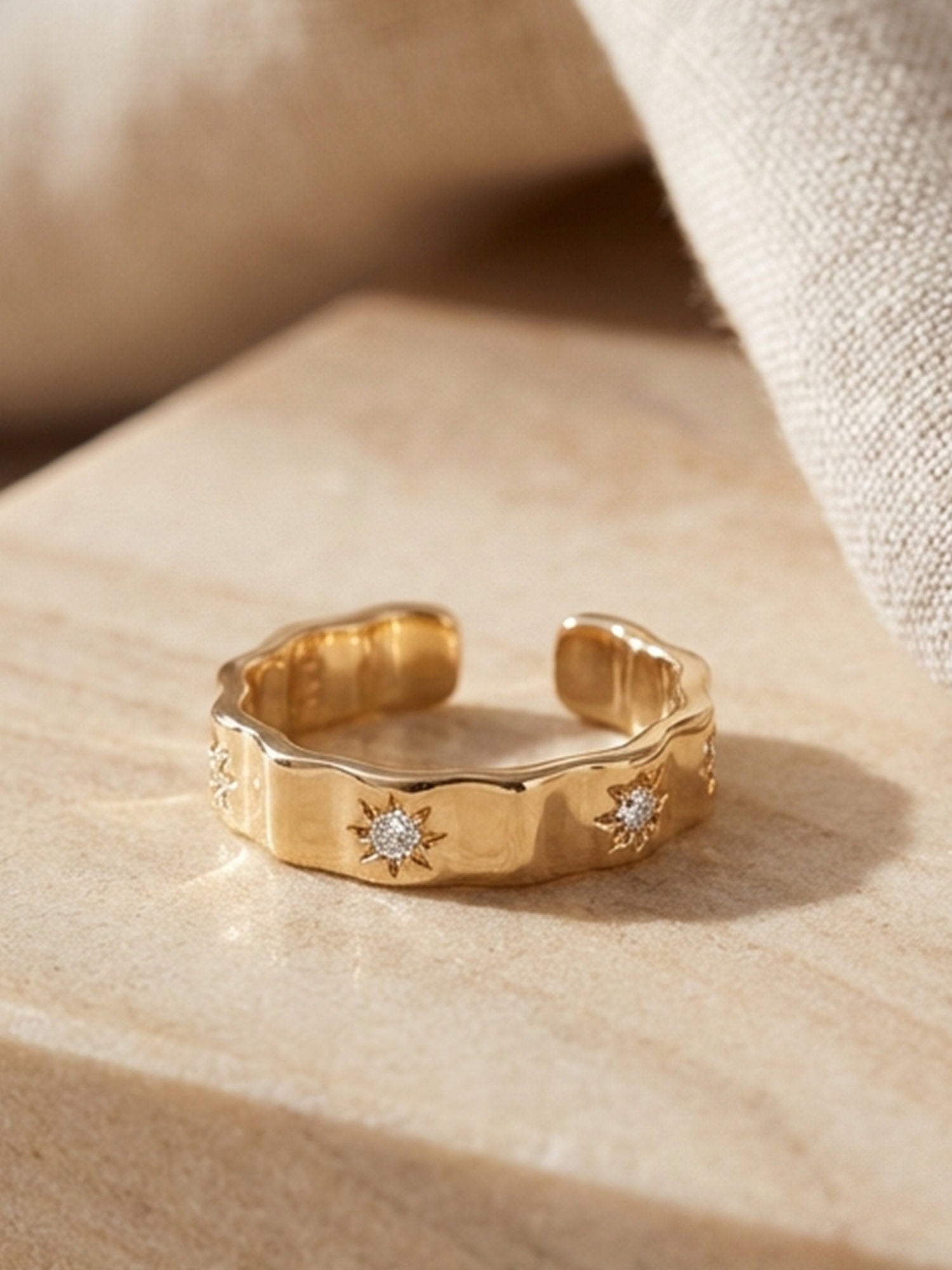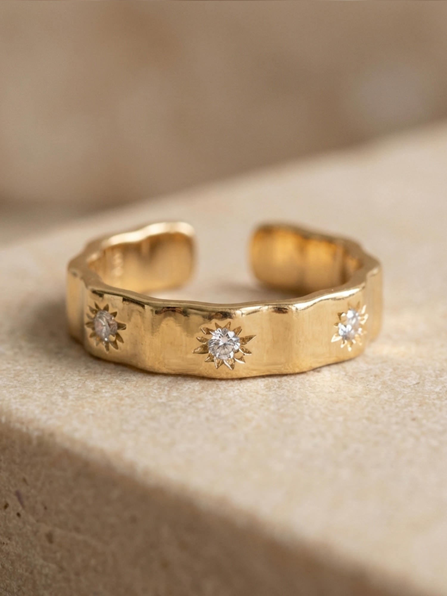 Gefertigt aus echtem 925 Sterling Silber und mit 18 Karat vergoldet, strahlt der Ring in einem warmen, eleganten Goldton. Das edle Material macht ihn ideal für empfindliche Haut und sorgt für ein angenehm leichtes Tragegefühl. Ein Schmuckstück, das jedes Outfit aufwertet und sofort ins Auge fällt.