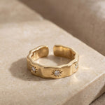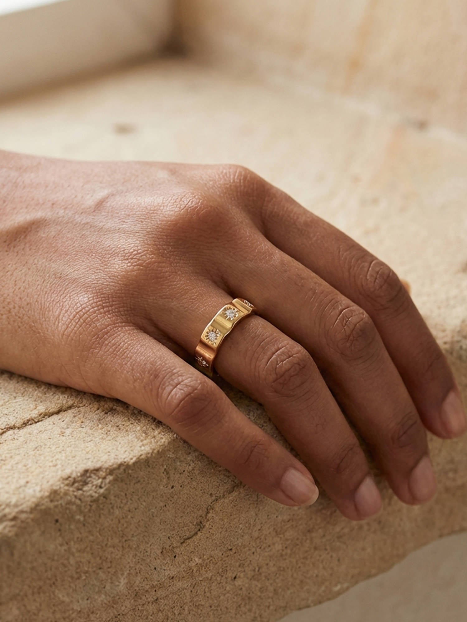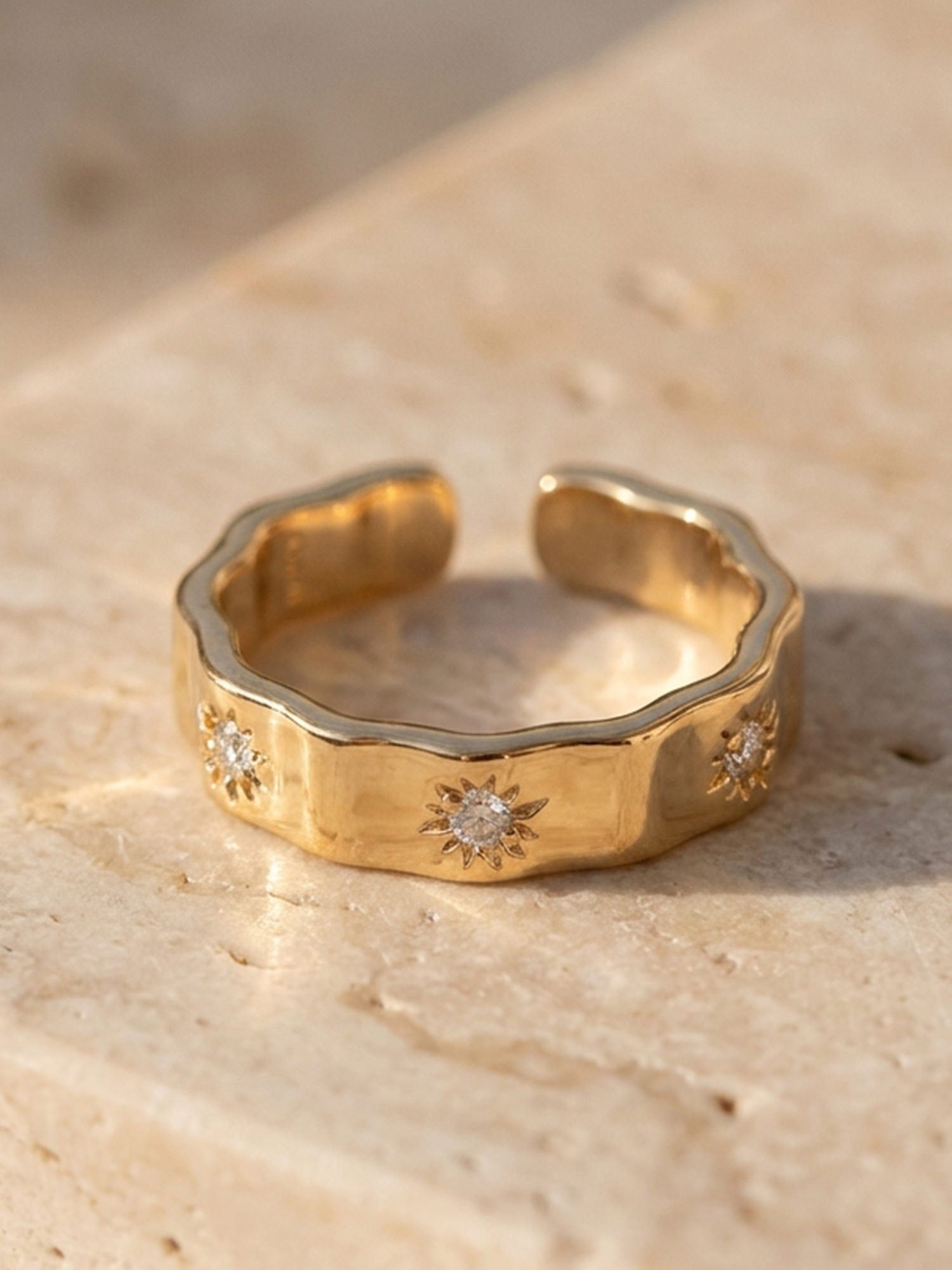 Der Bold Sun Ring Gold ist ein kraftvolles Statement-Piece, das durch seine strukturierte Oberfläche an warme Sonnenstrahlen erinnert. Die markante Form verleiht dem Ring eine moderne, feminine Ausstrahlung – perfekt für alle, die ein besonderes Highlight suchen, das dennoch zeitlos bleibt.