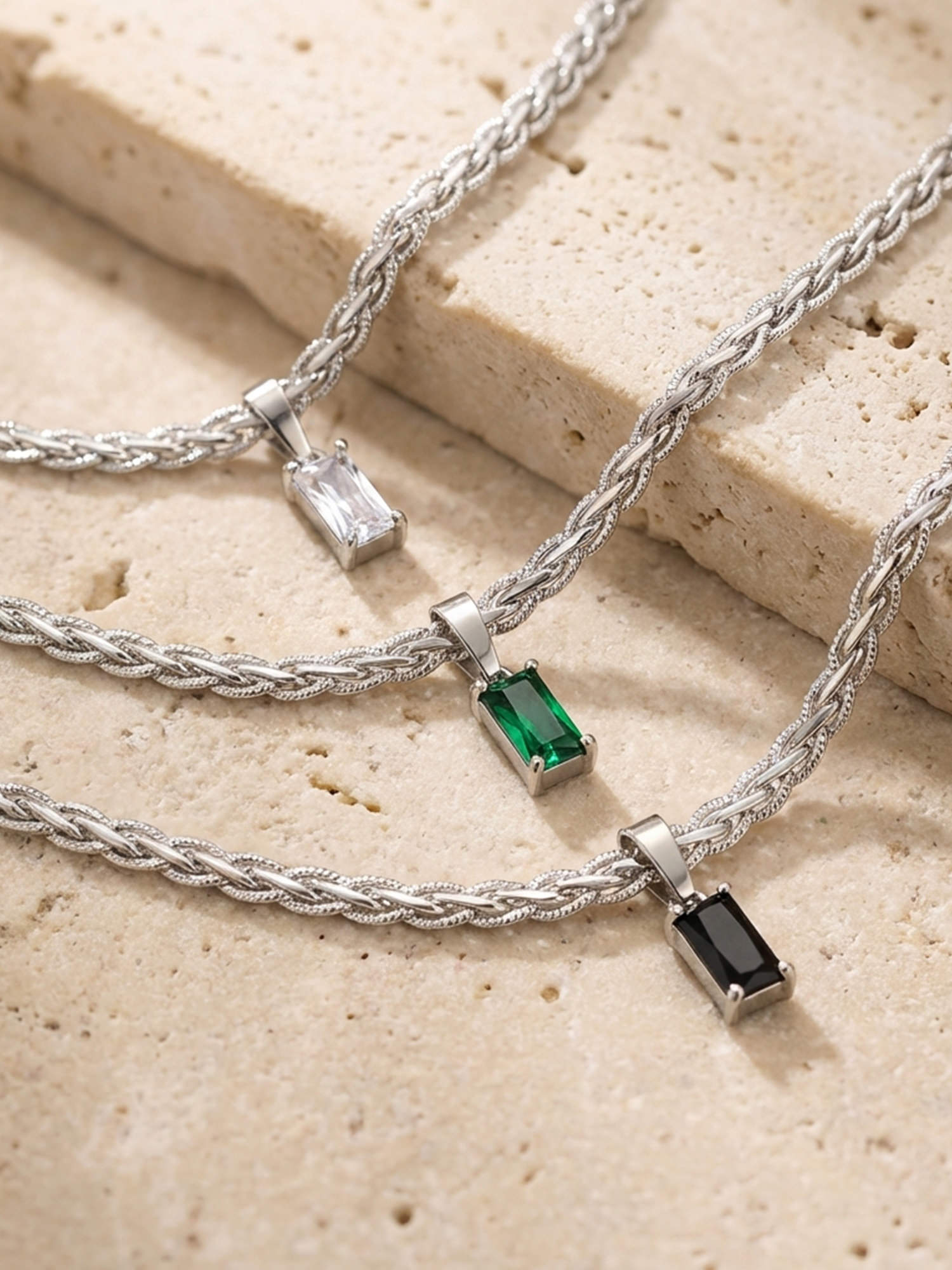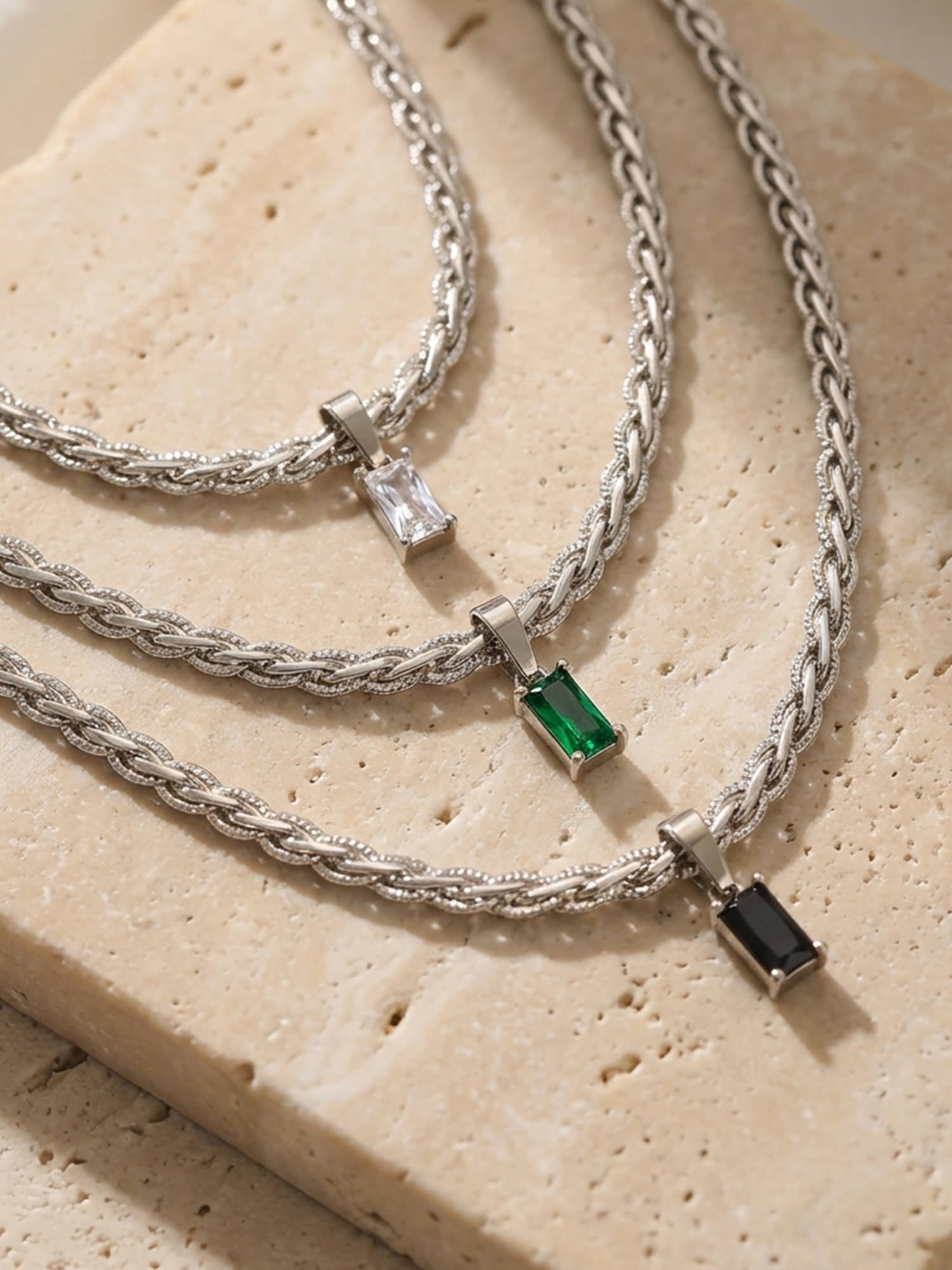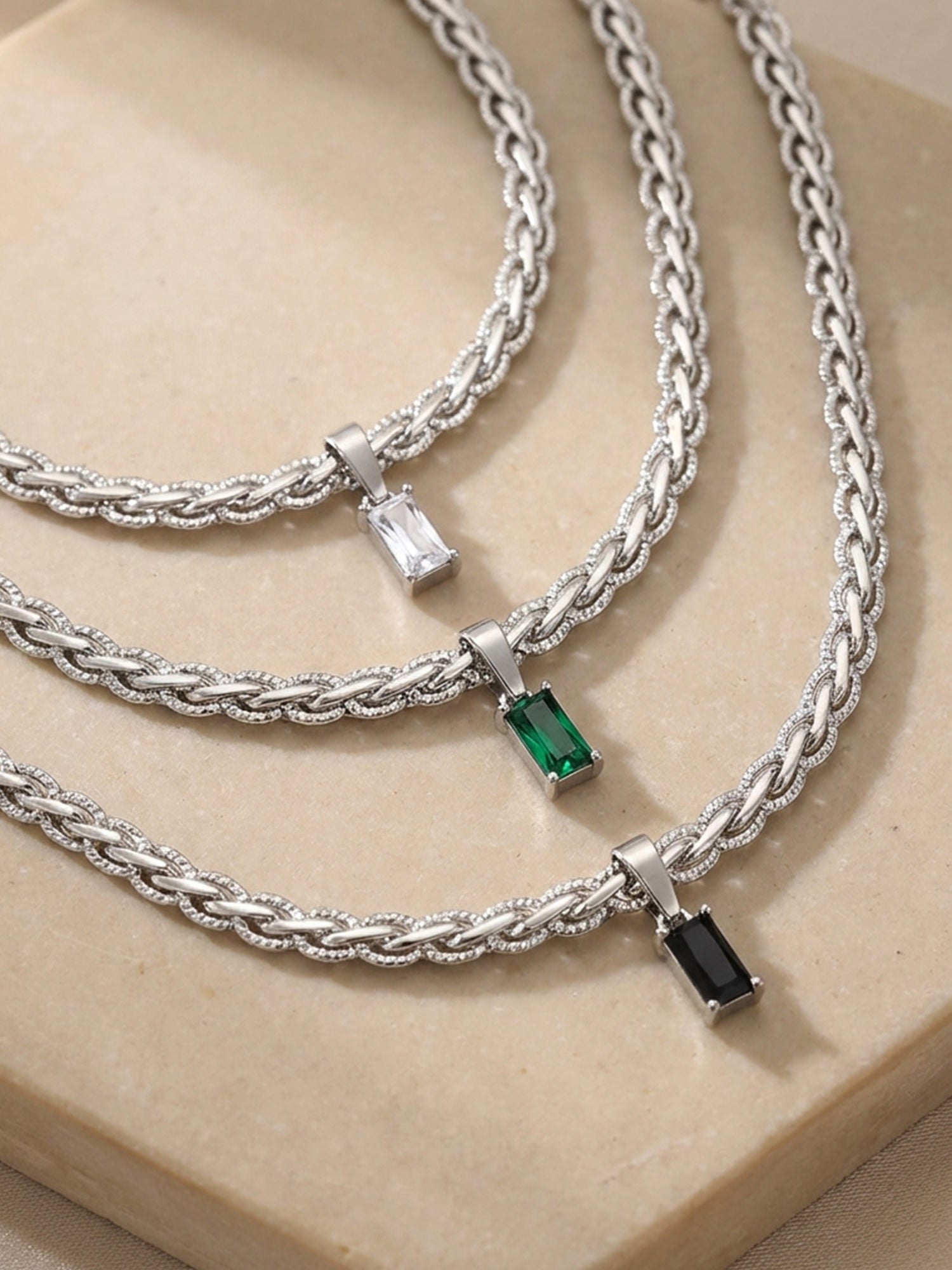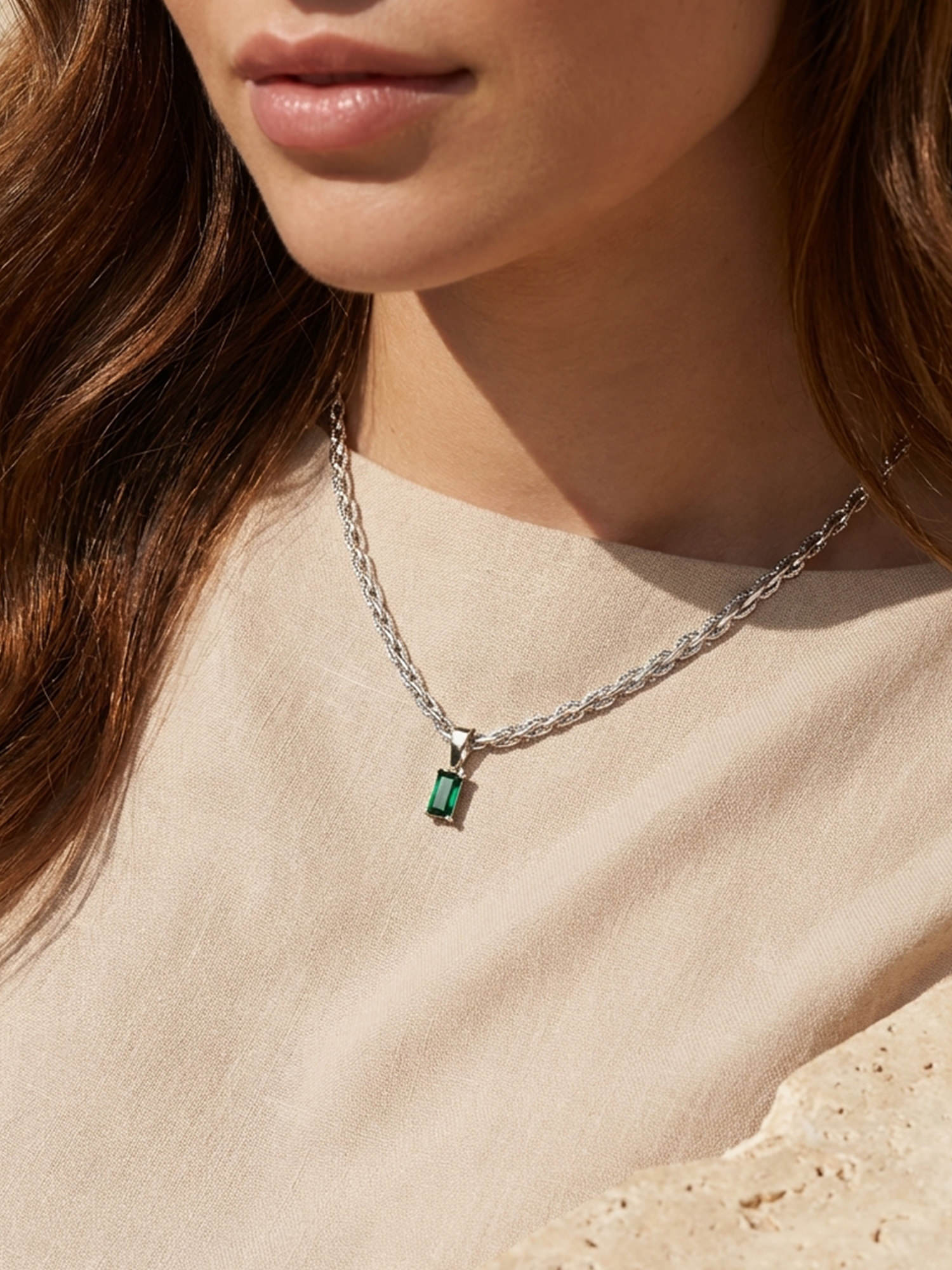 Im Mittelpunkt steht der rechteckige Baguette-Zirkonia, der je nach Variante in Grün, Schwarz oder Weiß gewählt werden kann. Der präzise Schliff verleiht der Kette einen stilvollen, zurückhaltenden Sparkle – modern, clean und absolut alltagstauglich.