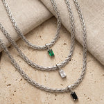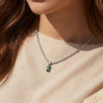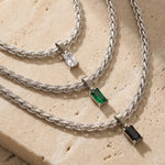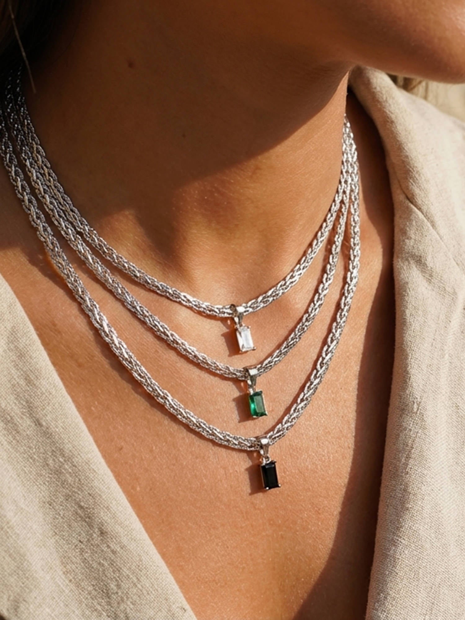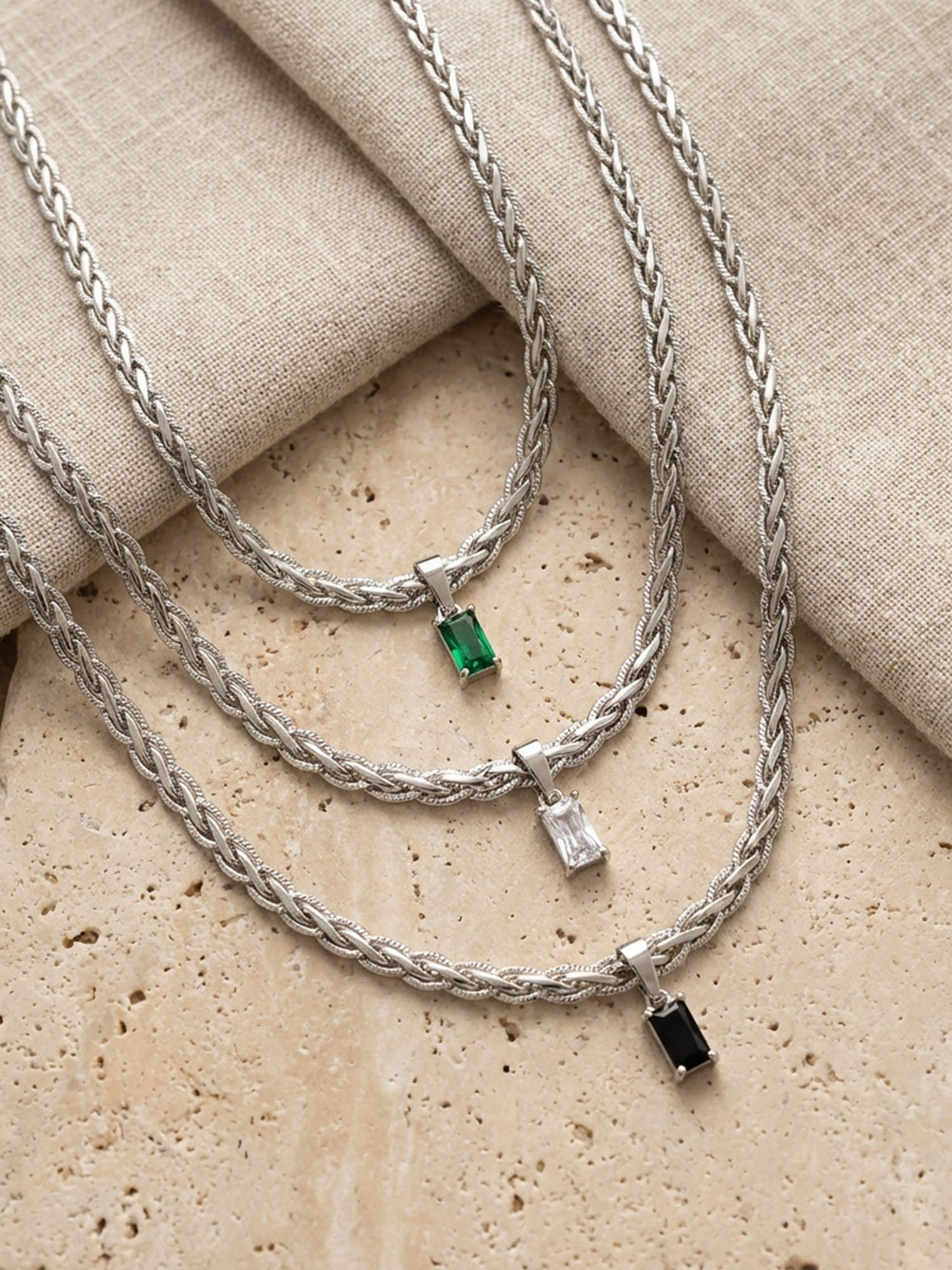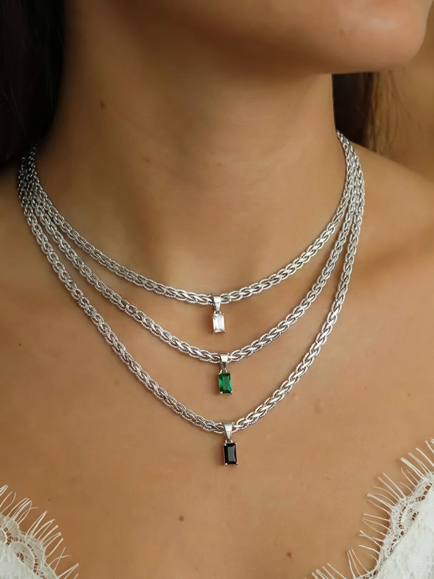 Im Mittelpunkt steht der rechteckige Baguette-Zirkonia, der je nach Variante in Grün, Schwarz oder Weiß gewählt werden kann. Der präzise Schliff verleiht der Kette einen stilvollen, zurückhaltenden Sparkle – modern, clean und absolut alltagstauglich.