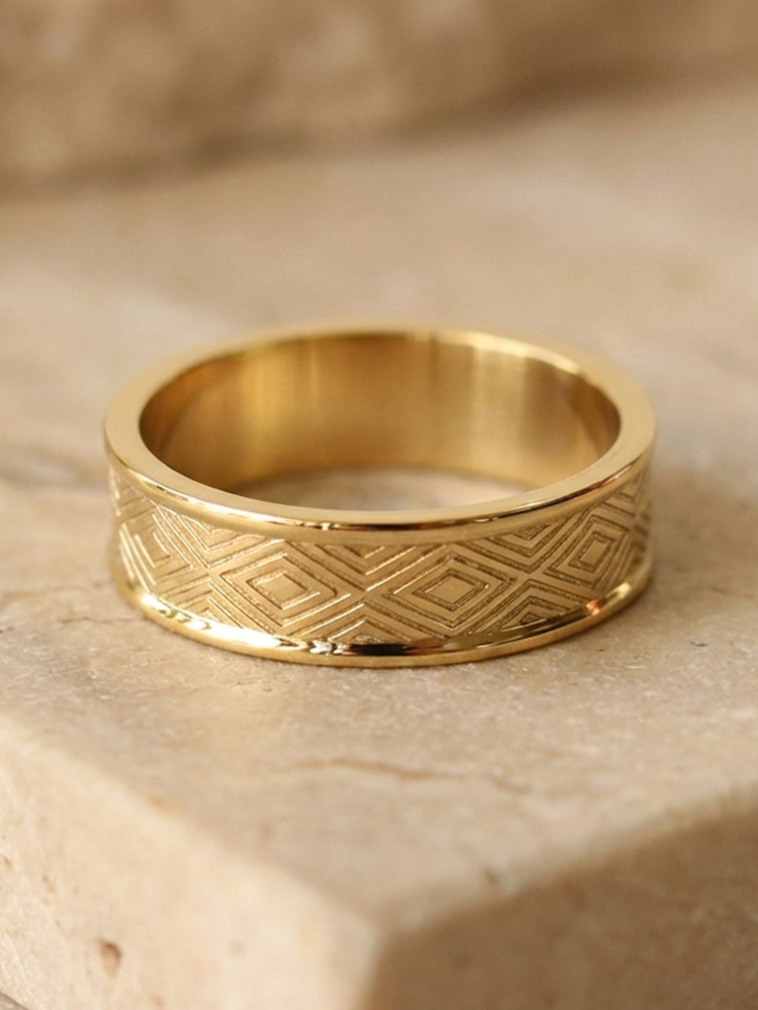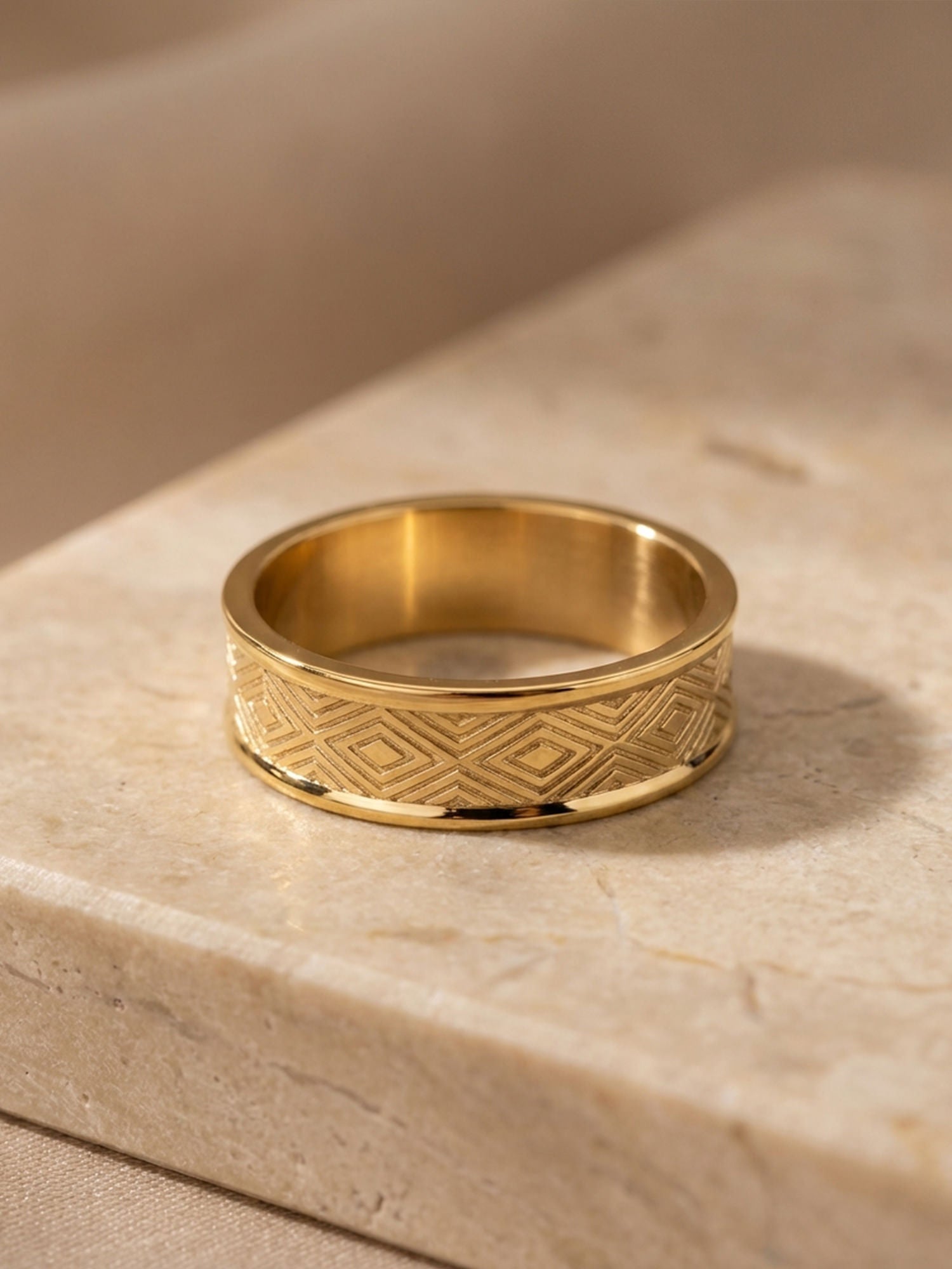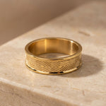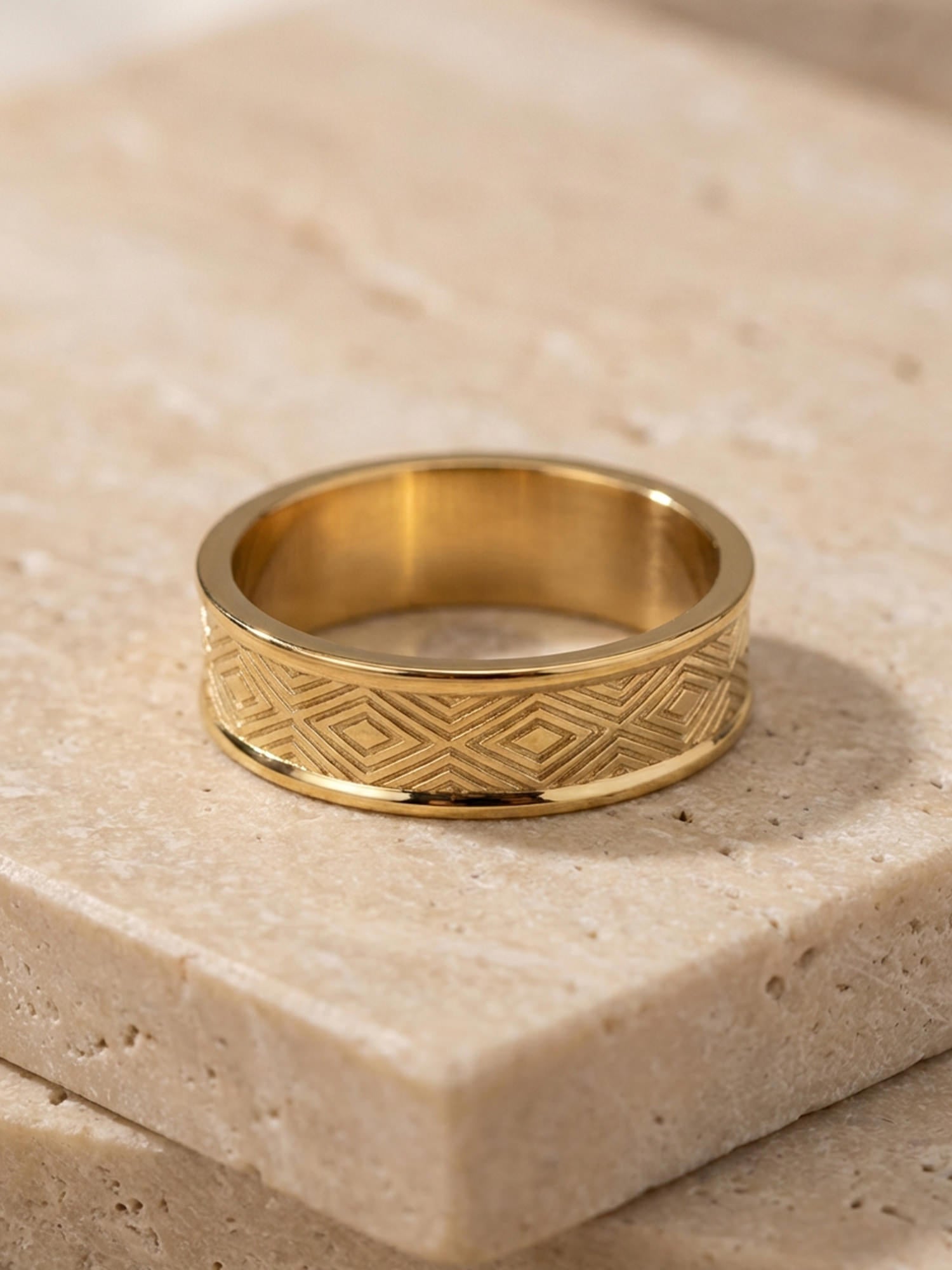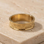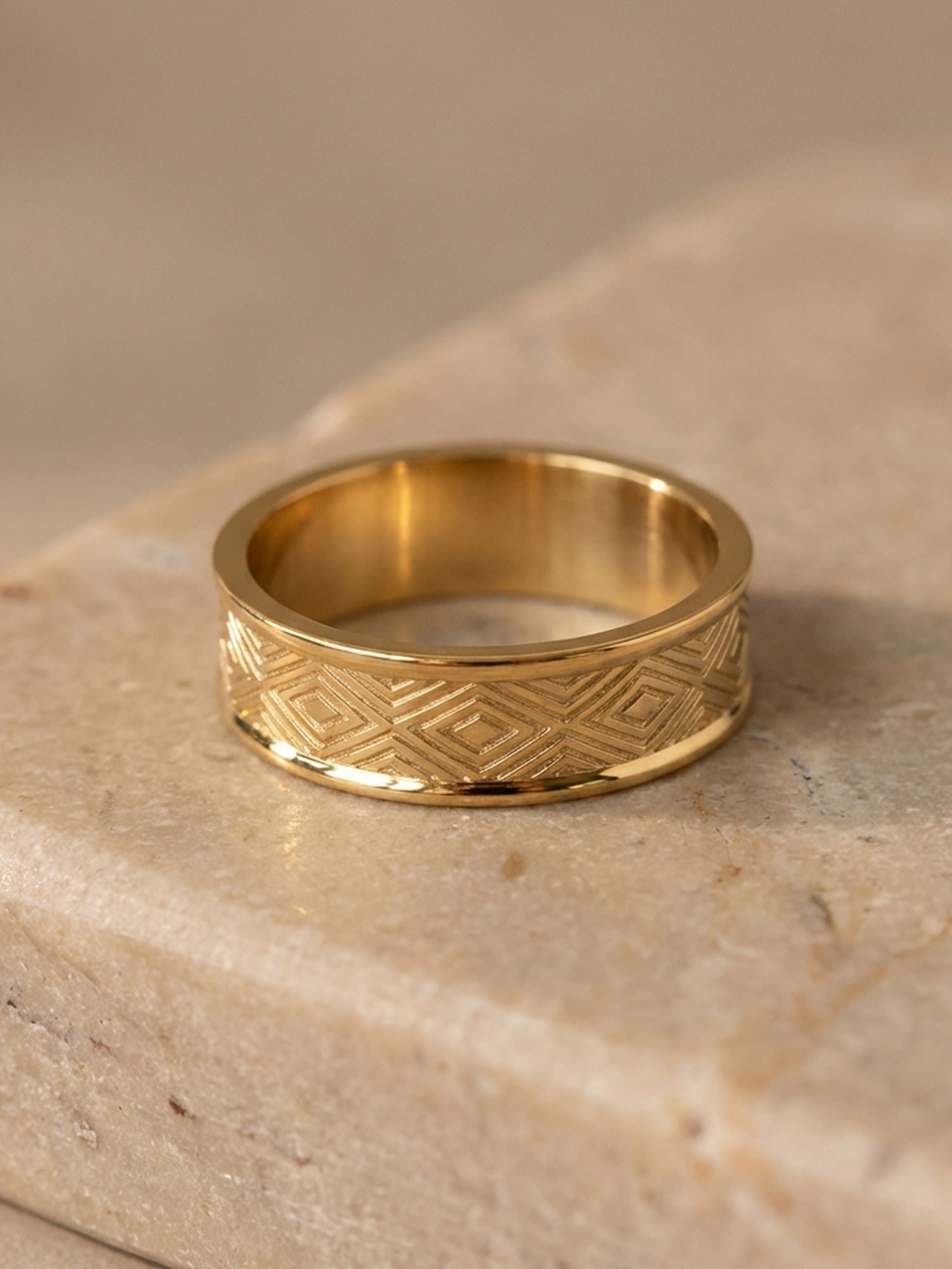 18 Karat vergoldeter Bandring mit Maya-Gravuren – auffälliger Statement-Ring aus Edelstahl, modern & hypoallergen.
