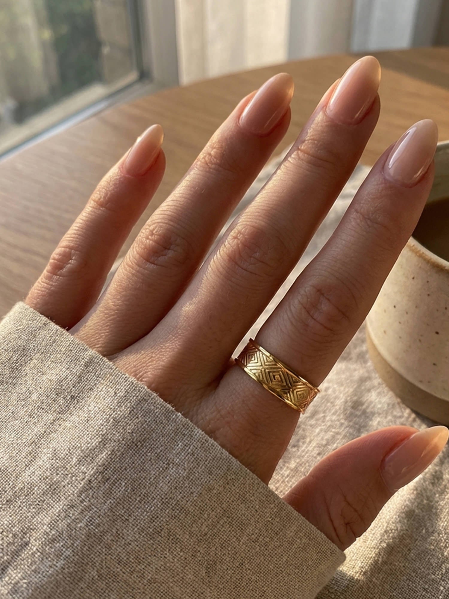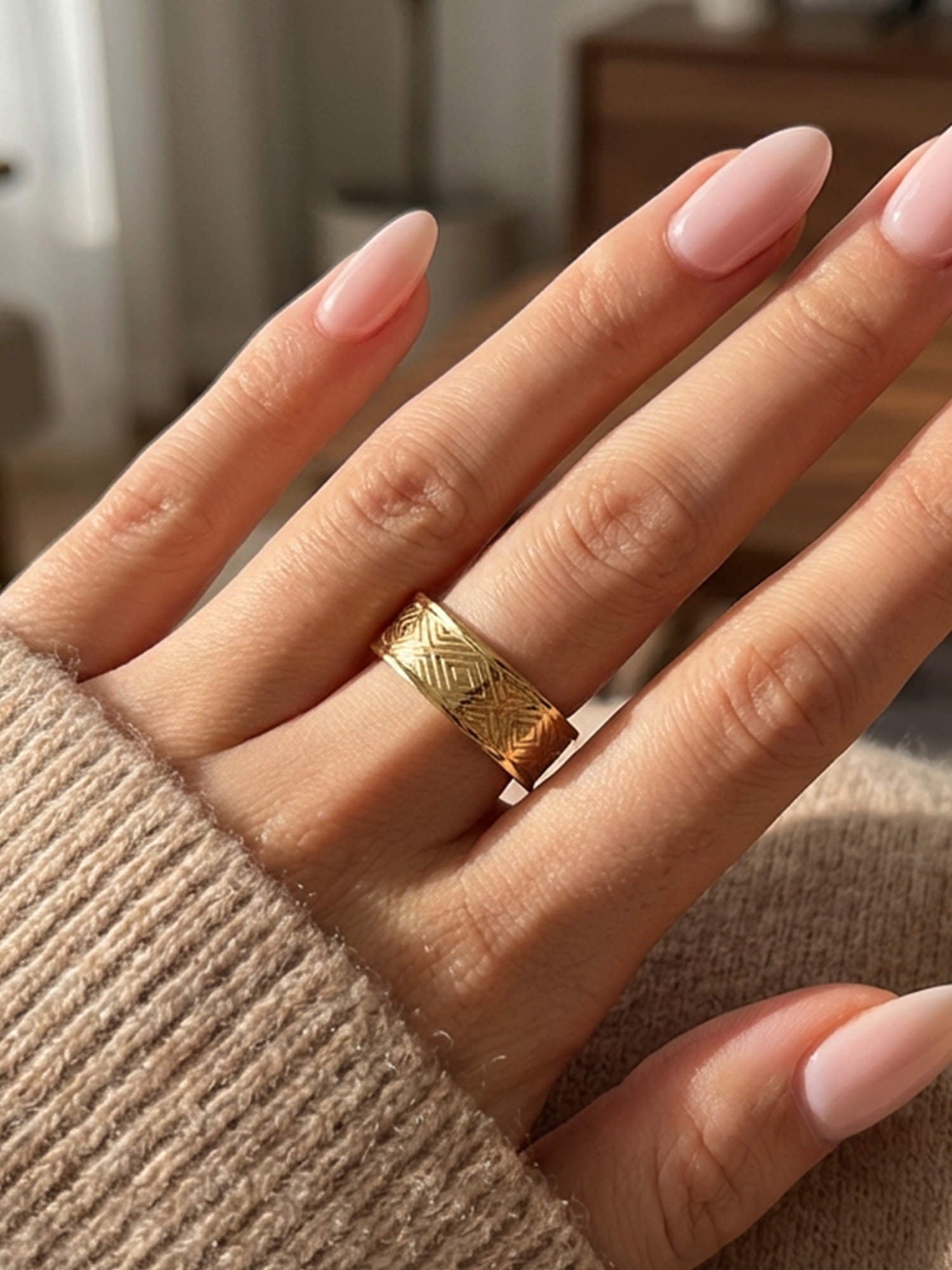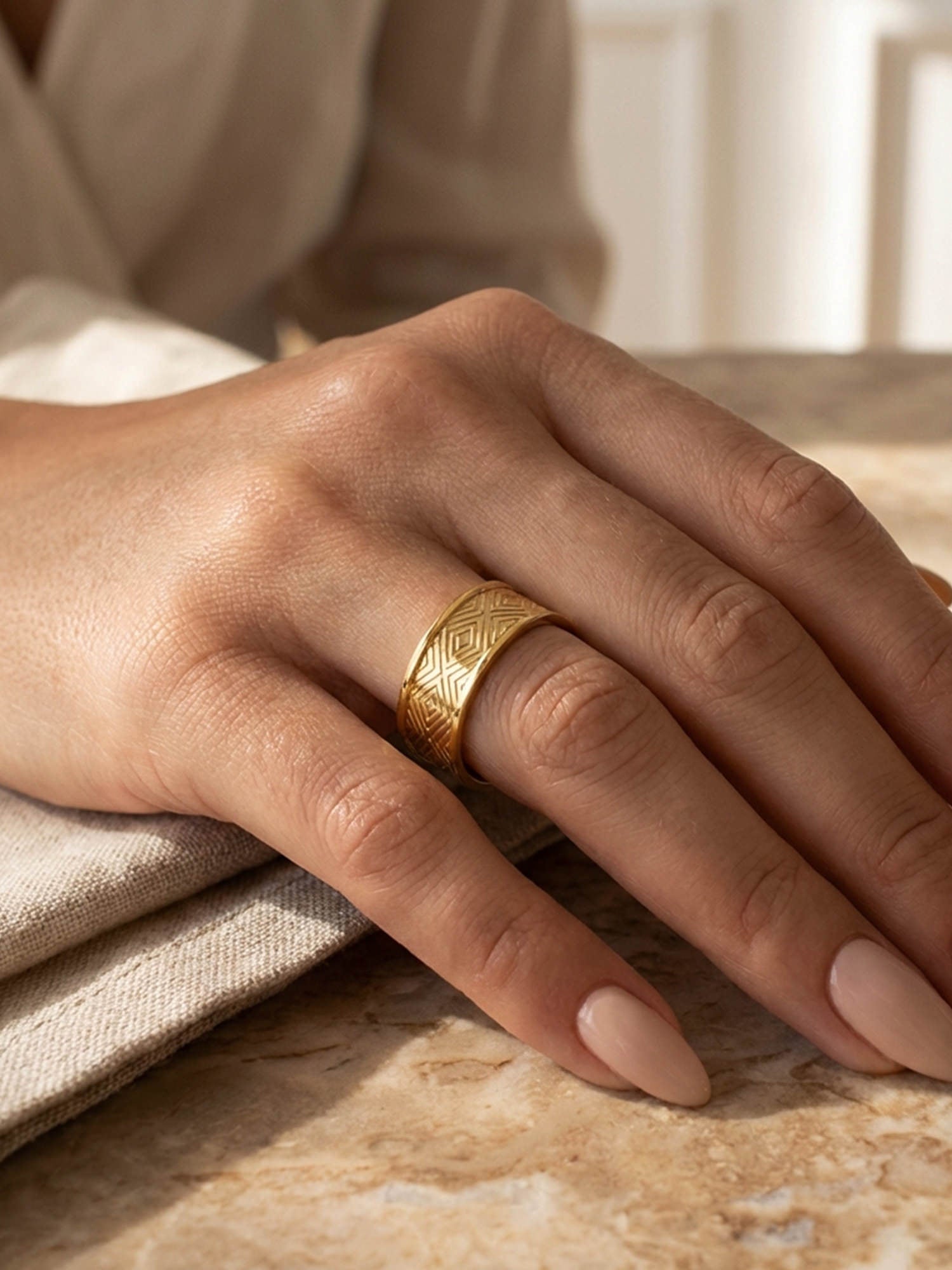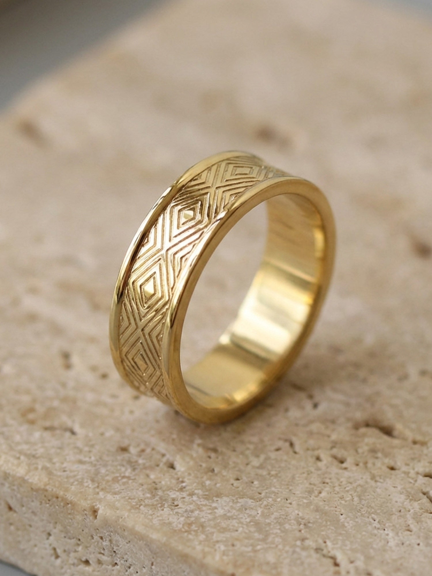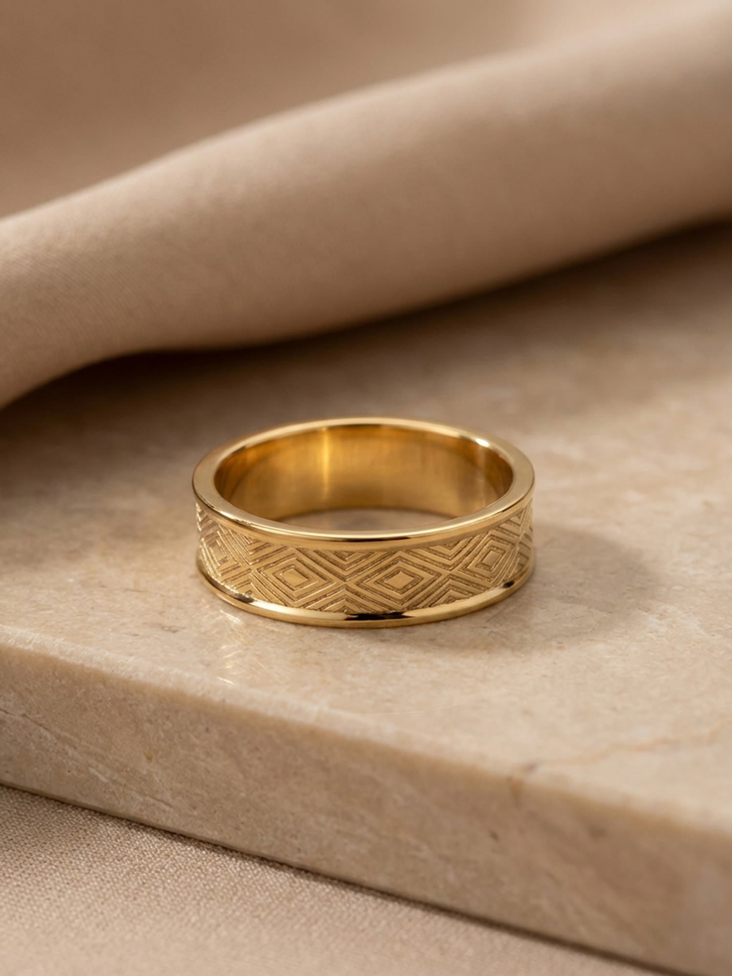 18 Karat vergoldeter Bandring mit Maya-Gravuren – auffälliger Statement-Ring aus Edelstahl, modern & hypoallergen.