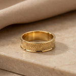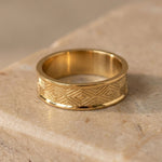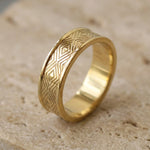Der Maya Ring Gold ist ein markanter Bandring, der von traditionellen Maya- und Azteken-Ornamenten inspiriert ist. Die geometrischen Gravuren verleihen dem Ring eine kraftvolle, archaische Ausstrahlung, während der warme 18-Karat-Goldglanz das Design modern und edel wirken lässt.